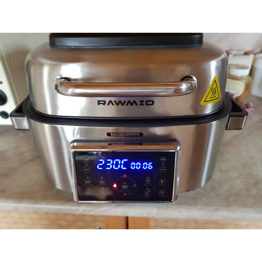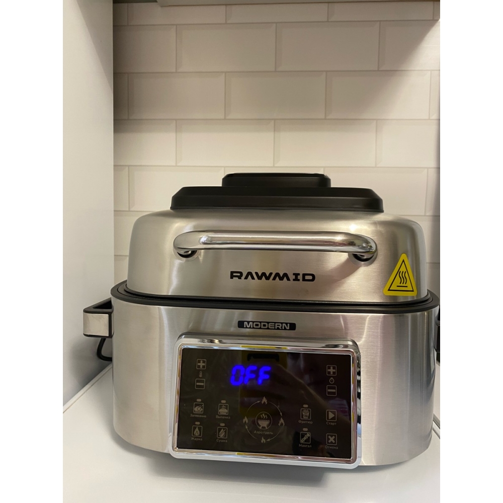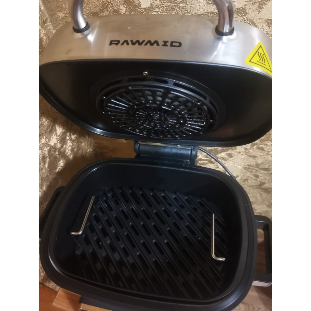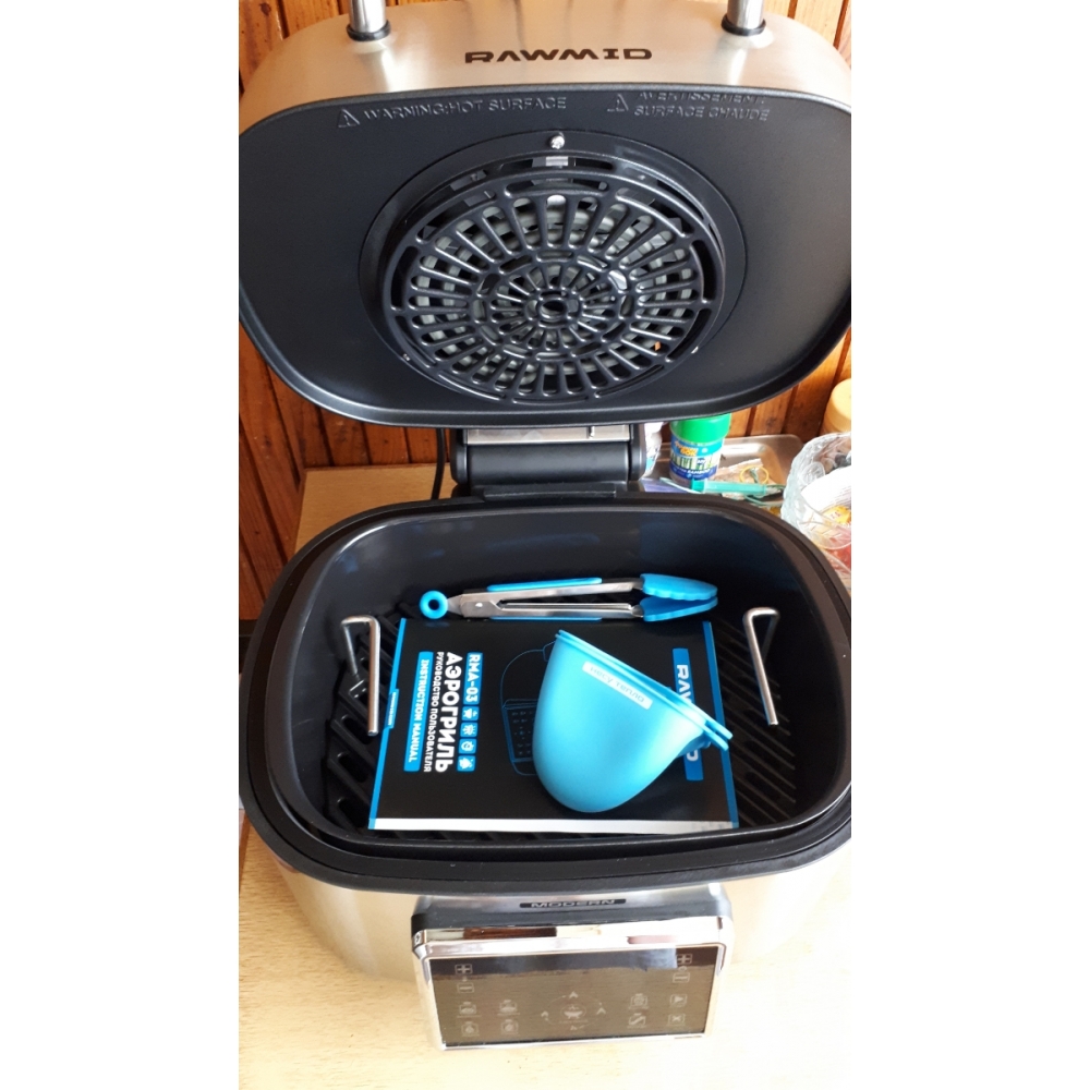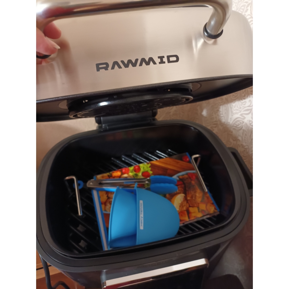 Аэрогриль RAWMID Modern лёгок и прост в уходе. Продукты нагреваются воздухом, а не решёткой, поэтому масло, специи и прочие ингредиенты не прилипают к поверхности (как это бывает с контактными грилями). К тому же чаша для запекания и решётка-гриль имеют стойкое антипригарное покрытие, с которого остатки пищи легко смываются. Нагревательный элемент спрятан в верхнюю крышку и никак не контактирует с продуктами, поэтому его вовсе не придётся чистить.