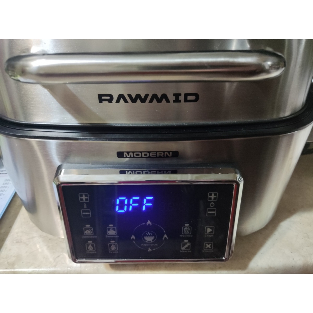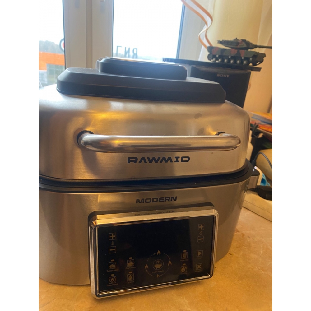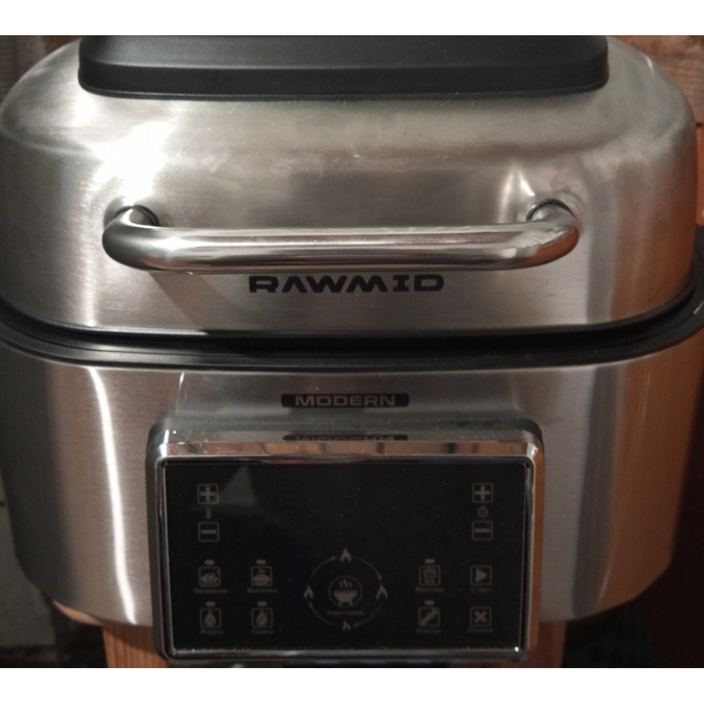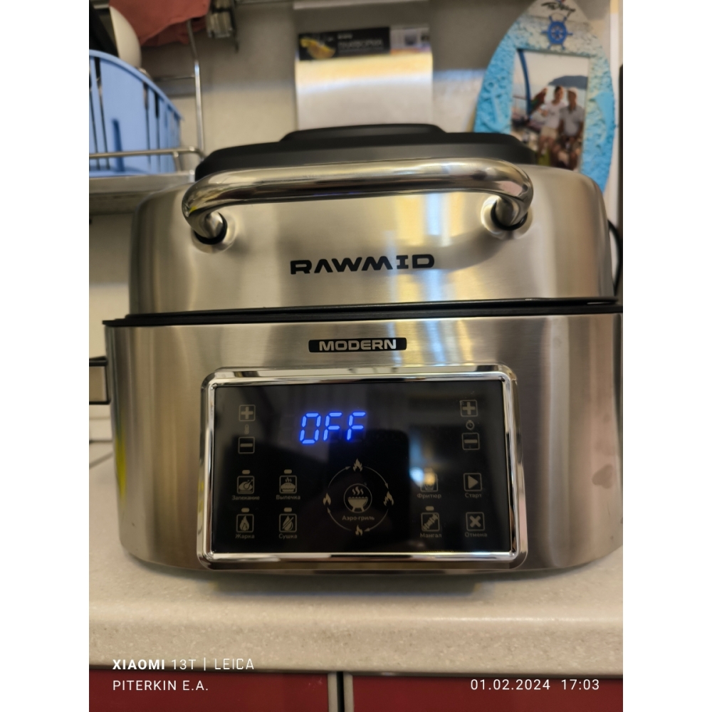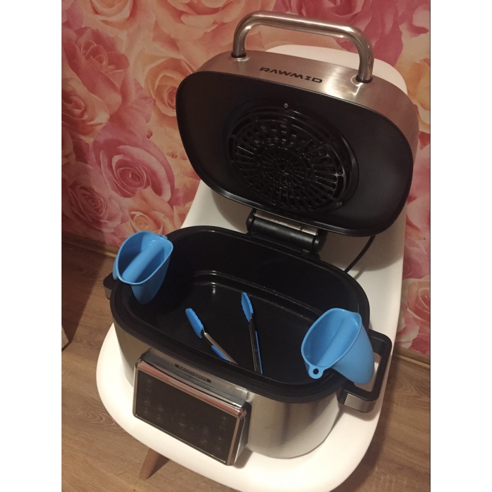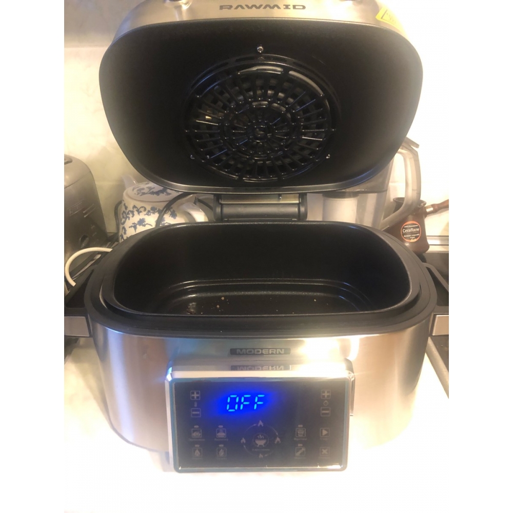Аэрогриль RAWMID Modern лёгок и прост в уходе. Продукты нагреваются воздухом, а не решёткой, поэтому масло, специи и прочие ингредиенты не прилипают к поверхности (как это бывает с контактными грилями). К тому же чаша для запекания и решётка-гриль имеют стойкое антипригарное покрытие, с которого остатки пищи легко смываются. Нагревательный элемент спрятан в верхнюю крышку и никак не контактирует с продуктами, поэтому его вовсе не придётся чистить.