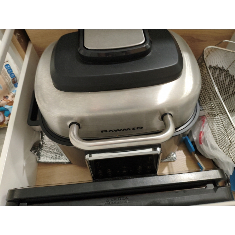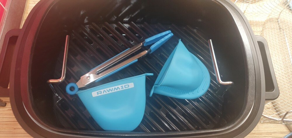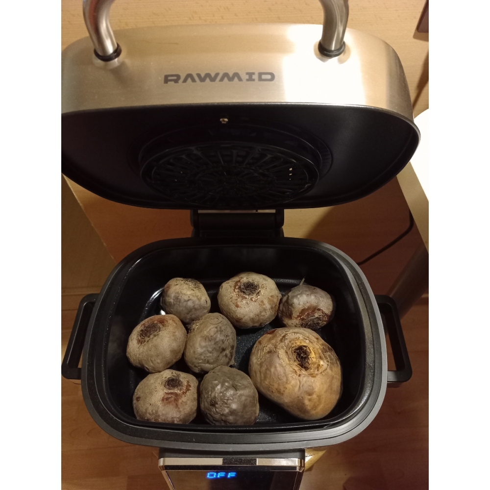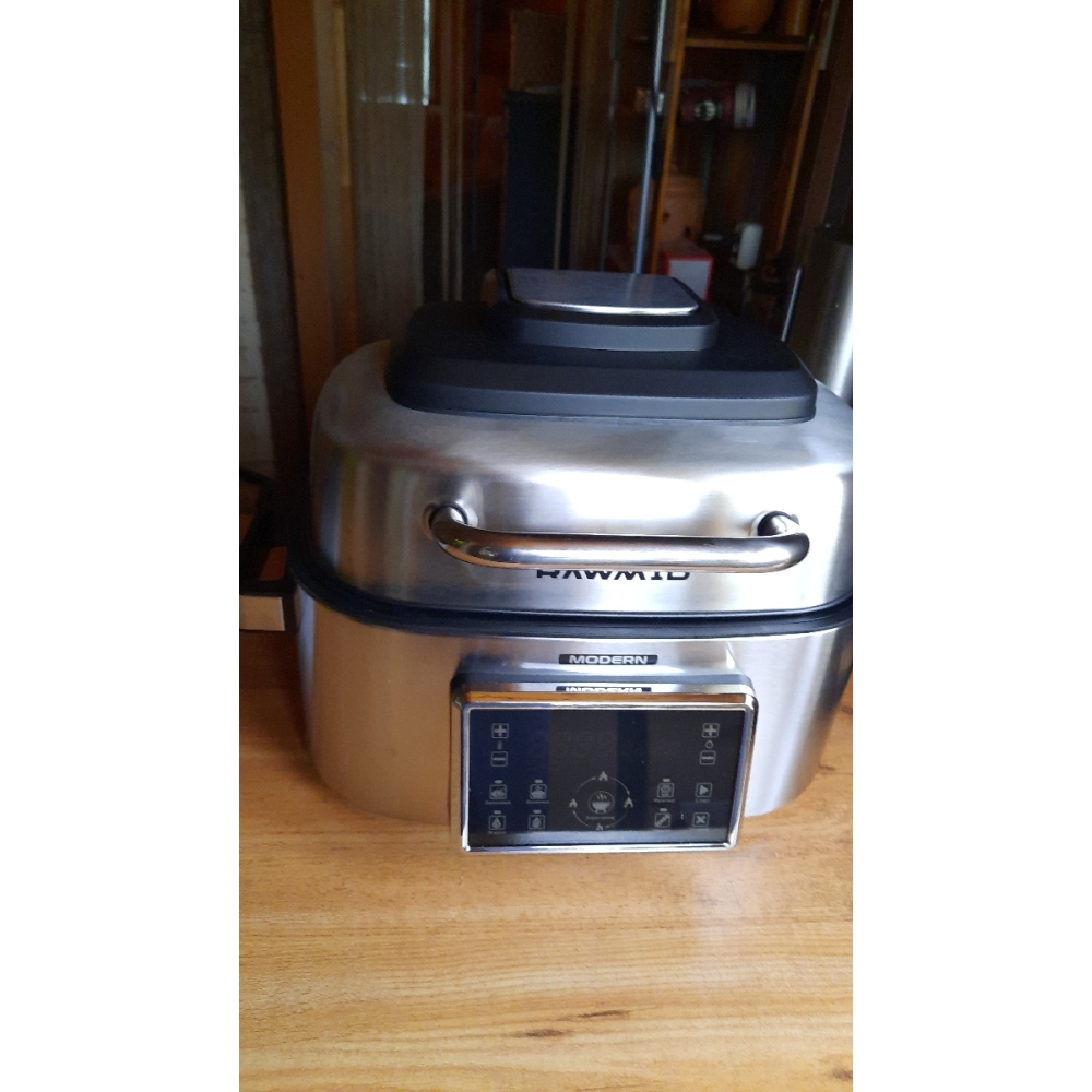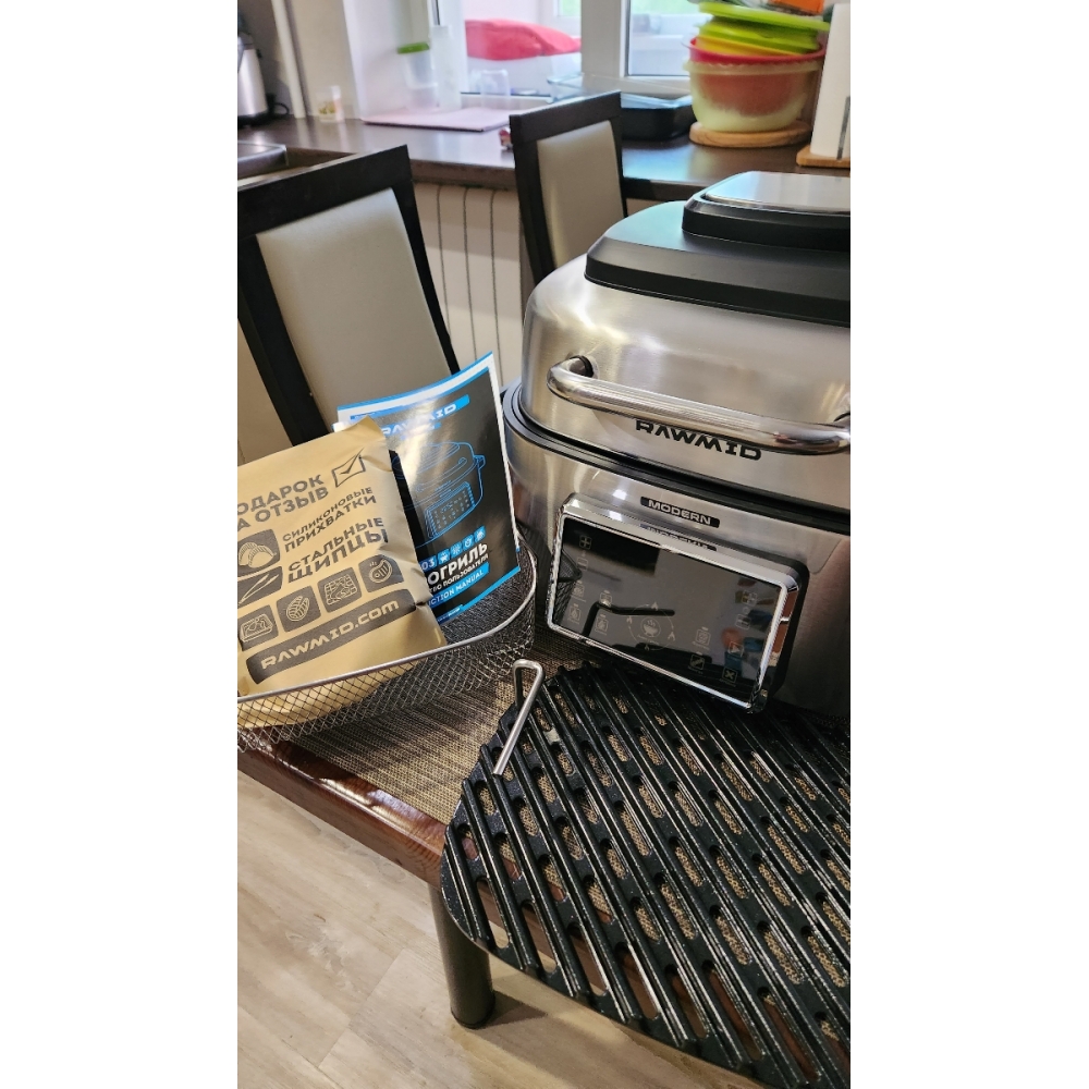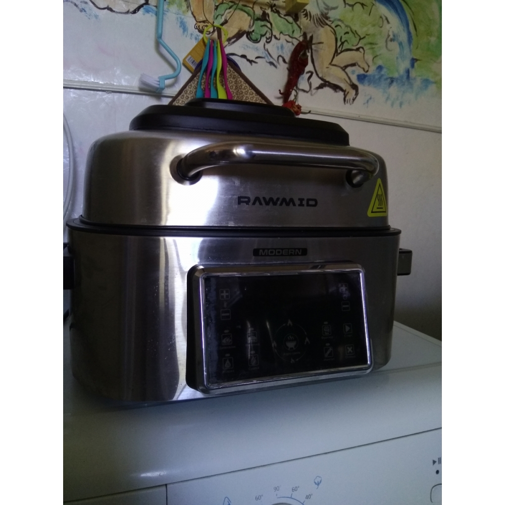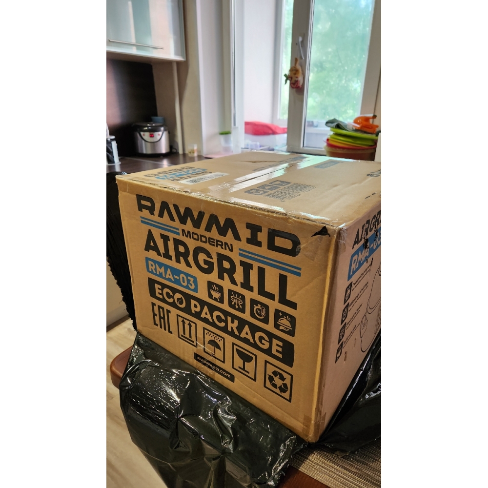 Аэрогриль RAWMID Modern лёгок и прост в уходе. Продукты нагреваются воздухом, а не решёткой, поэтому масло, специи и прочие ингредиенты не прилипают к поверхности (как это бывает с контактными грилями). К тому же чаша для запекания и решётка-гриль имеют стойкое антипригарное покрытие, с которого остатки пищи легко смываются. Нагревательный элемент спрятан в верхнюю крышку и никак не контактирует с продуктами, поэтому его вовсе не придётся чистить.