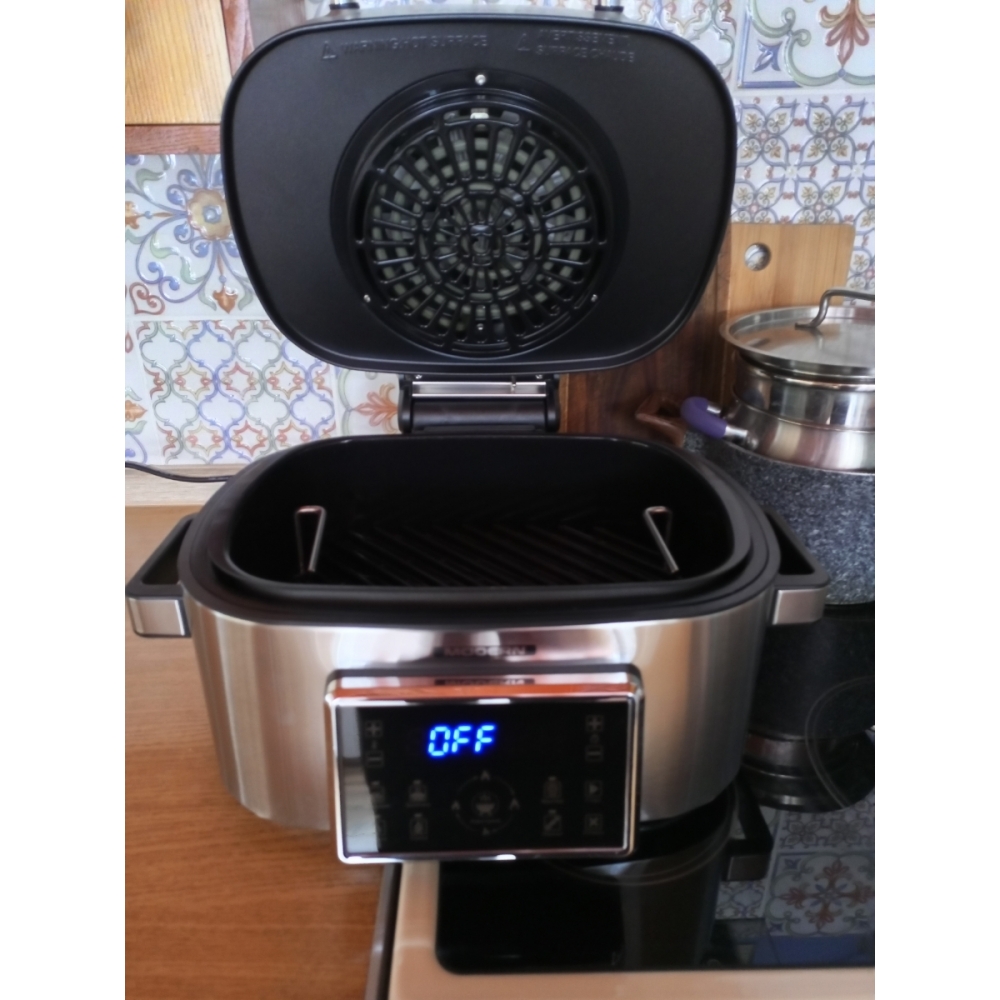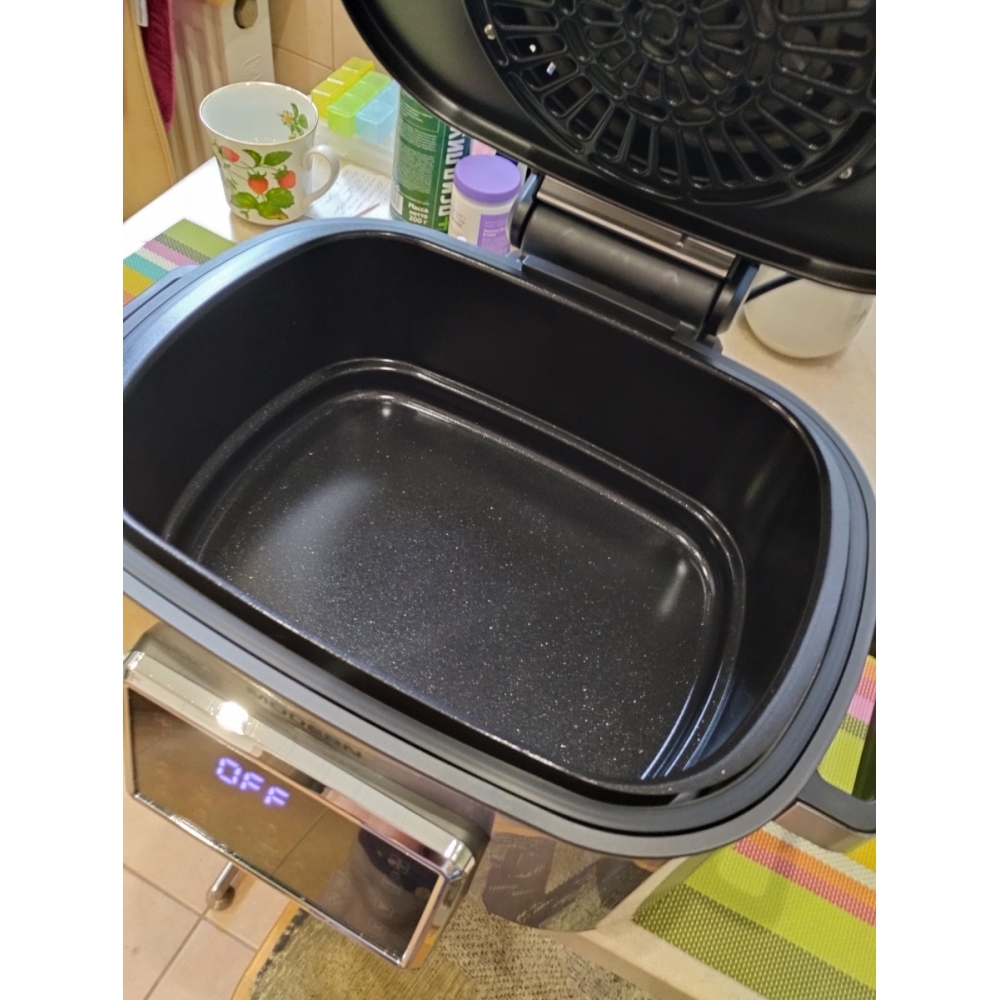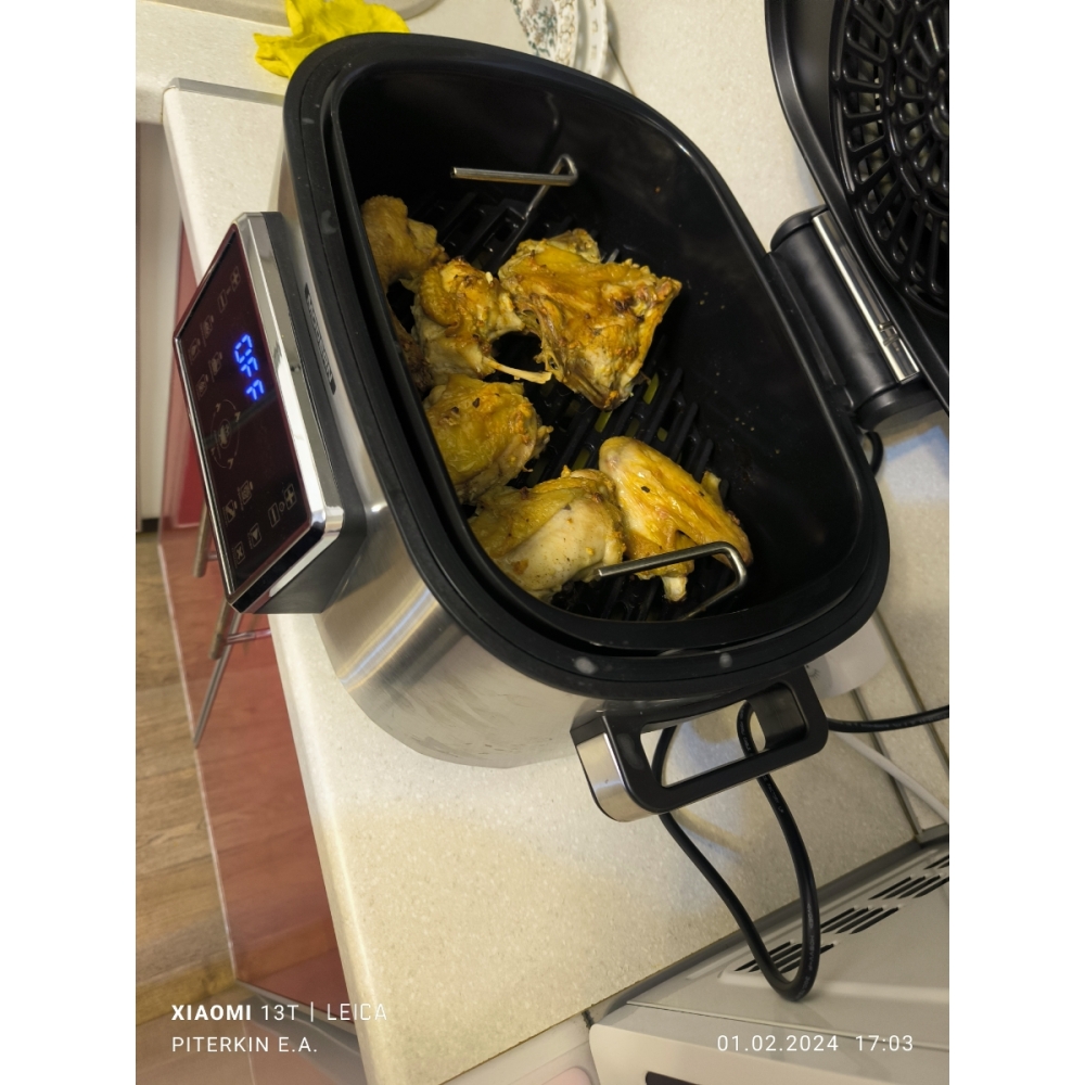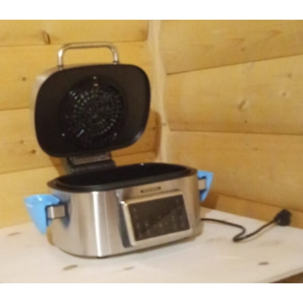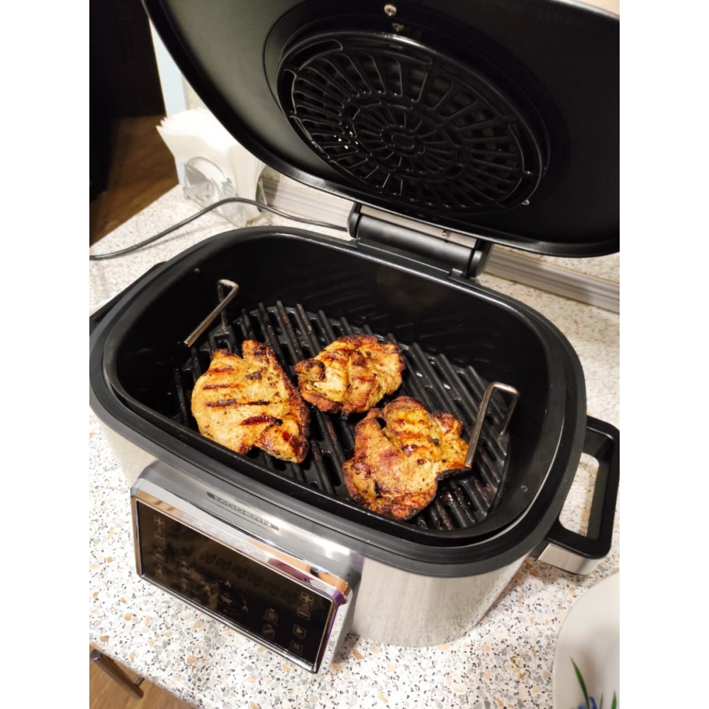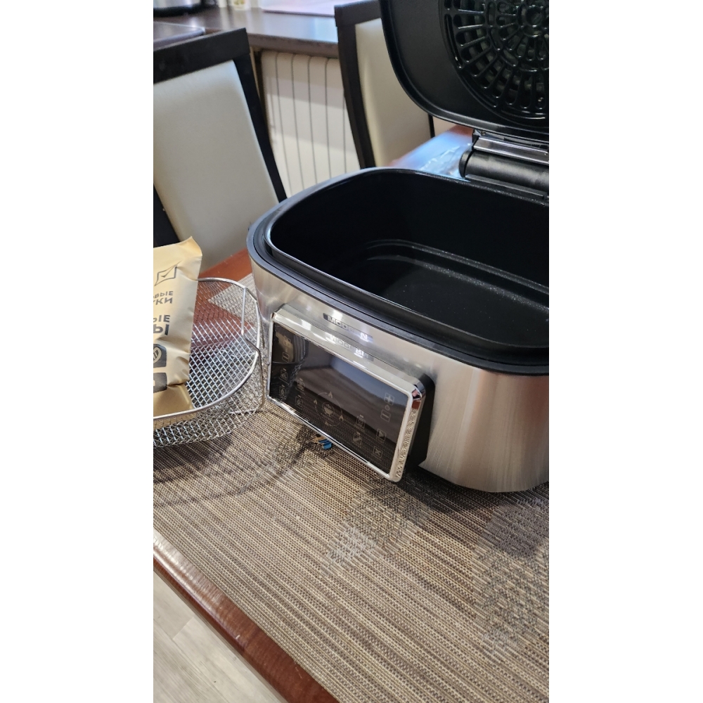 Большой многолопастной вентилятор, расположенный в верхней крышке устройства, сквозная решётка-гриль и обтекаемая форма чаши для запекания обеспечивают мощный и равномерный со всех сторон 3D-обдув продуктов для их равномерной обработки горячим воздухом.