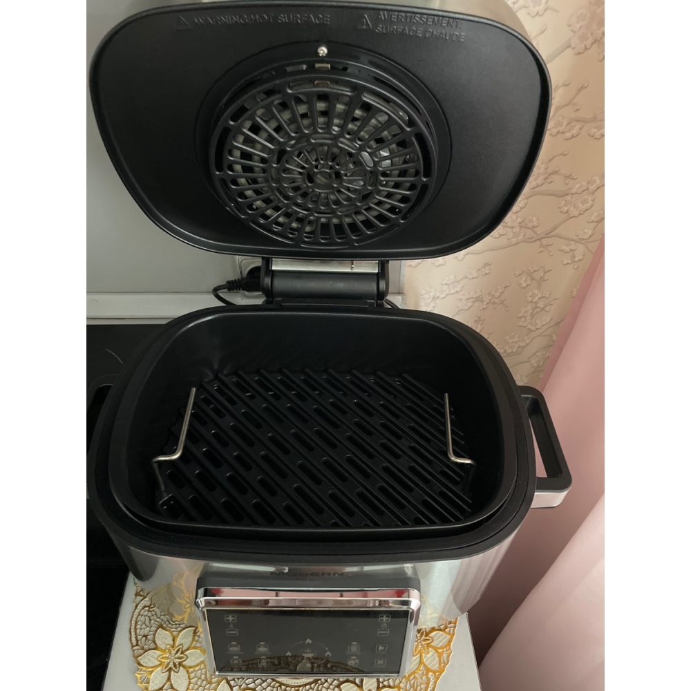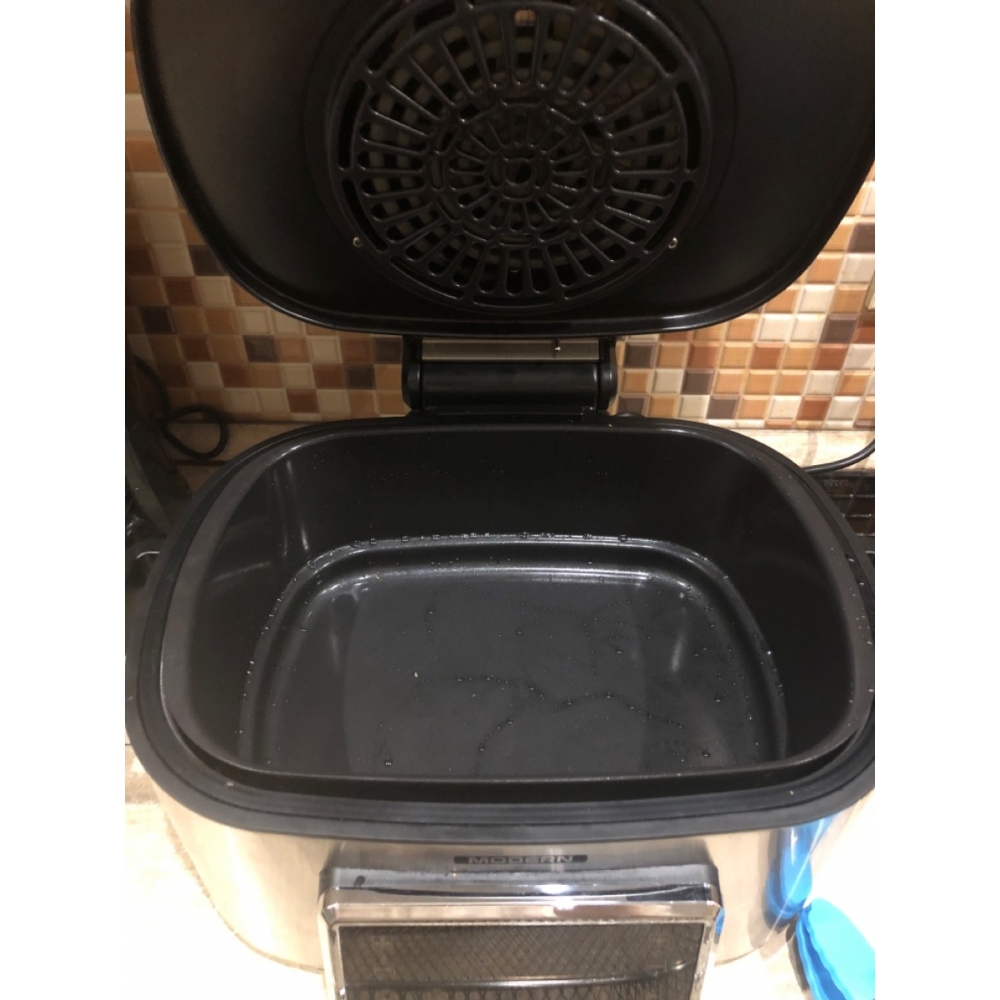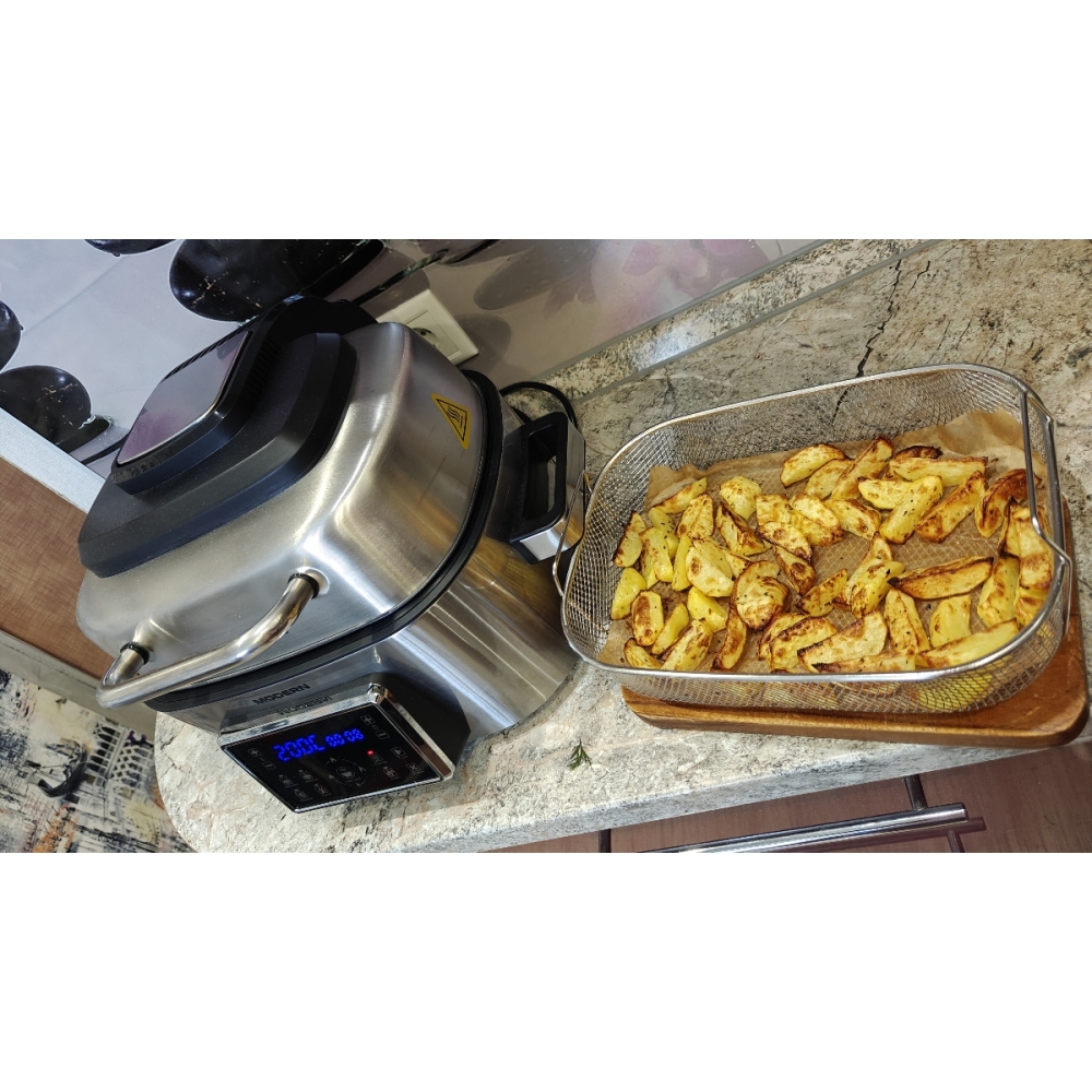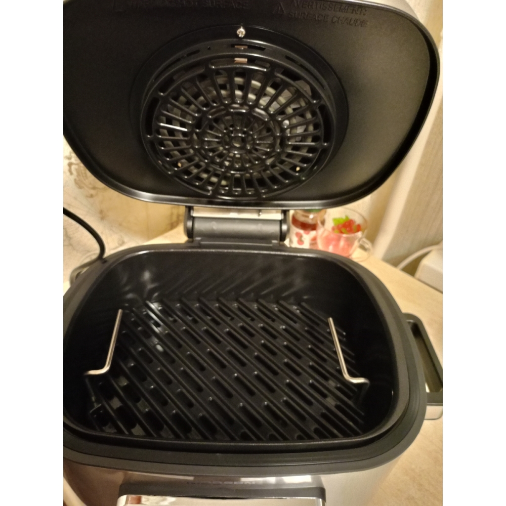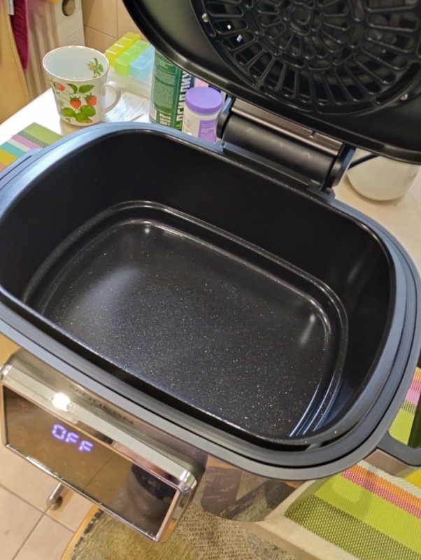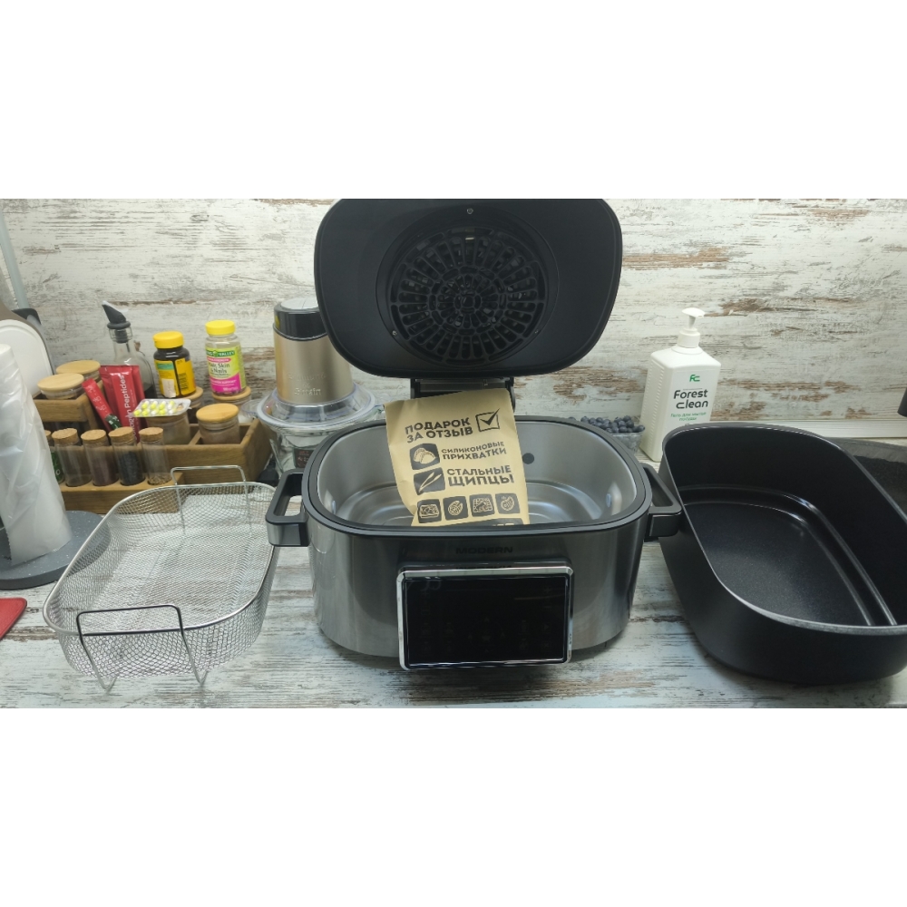Большой многолопастной вентилятор, расположенный в верхней крышке устройства, сквозная решётка-гриль и обтекаемая форма чаши для запекания обеспечивают мощный и равномерный со всех сторон 3D-обдув продуктов для их равномерной обработки горячим воздухом.