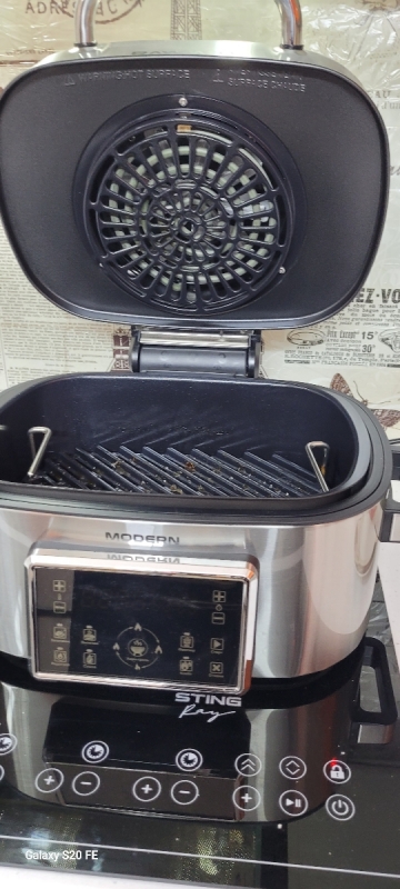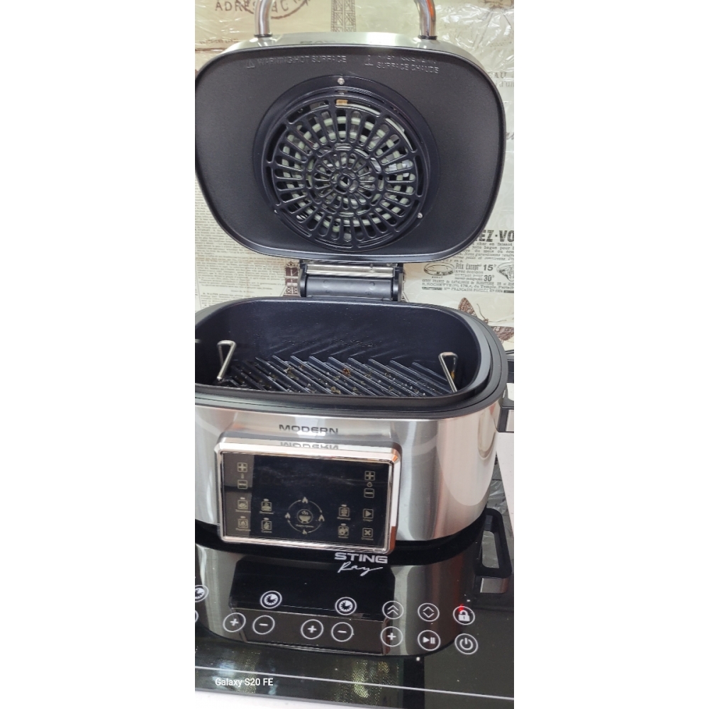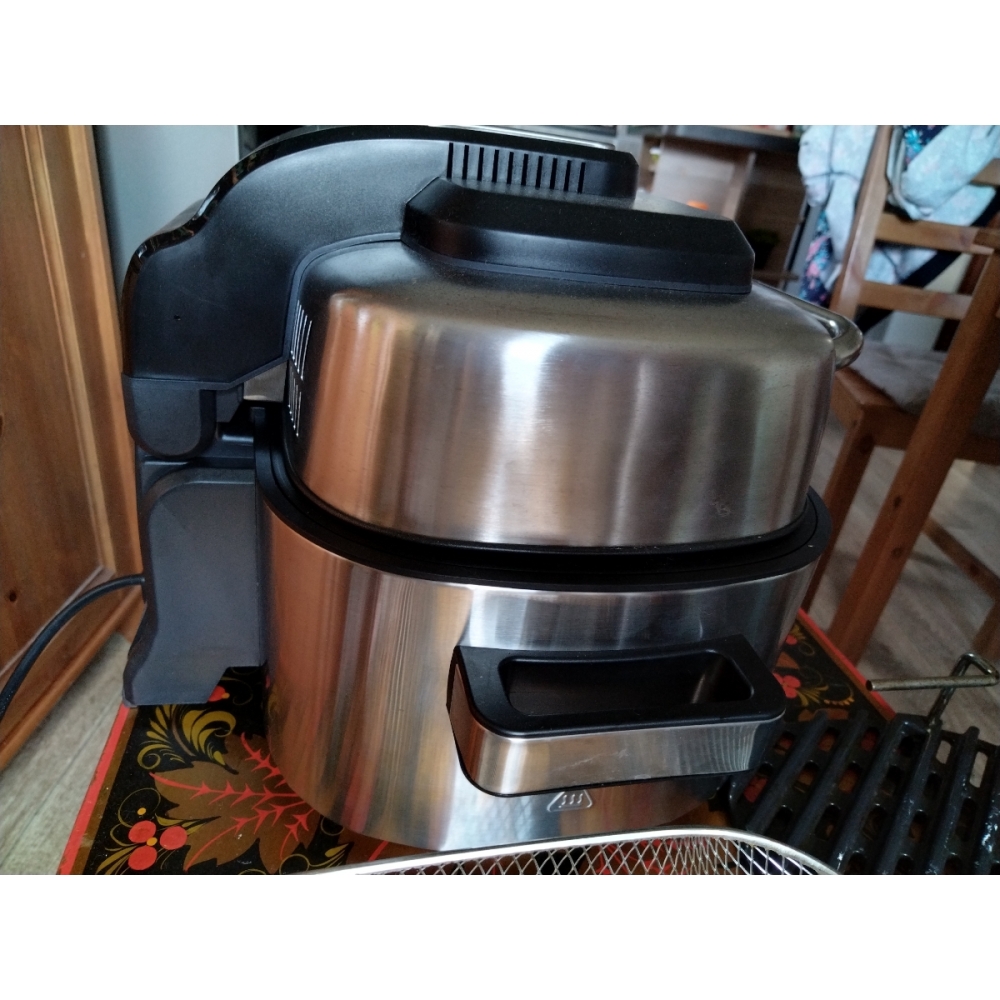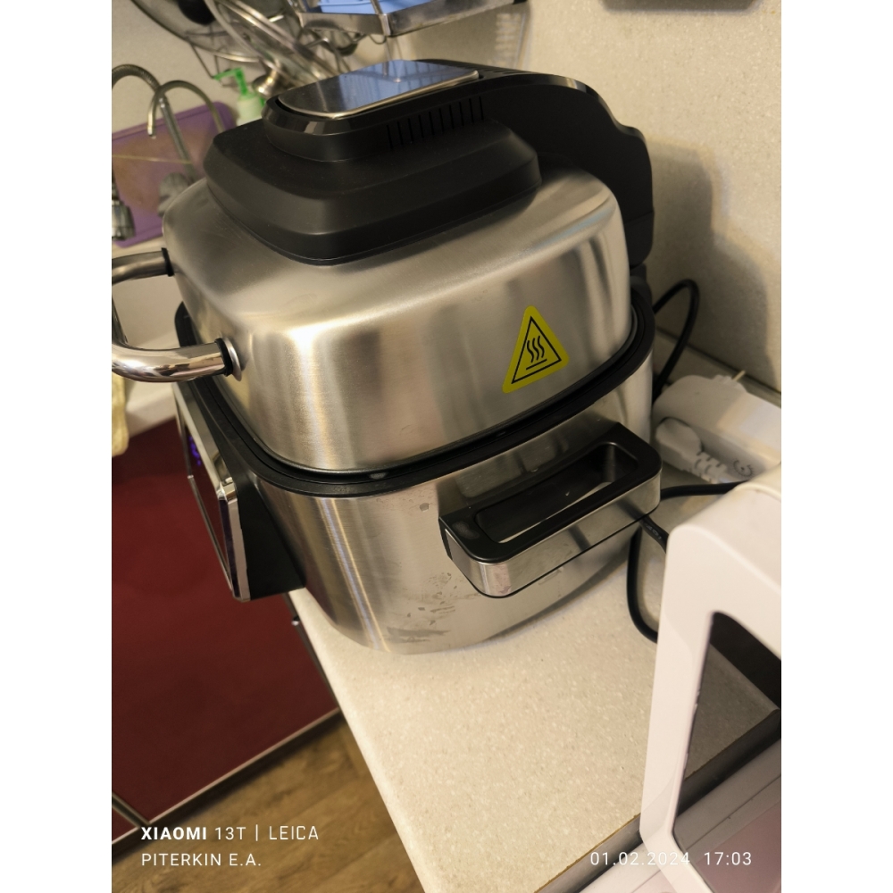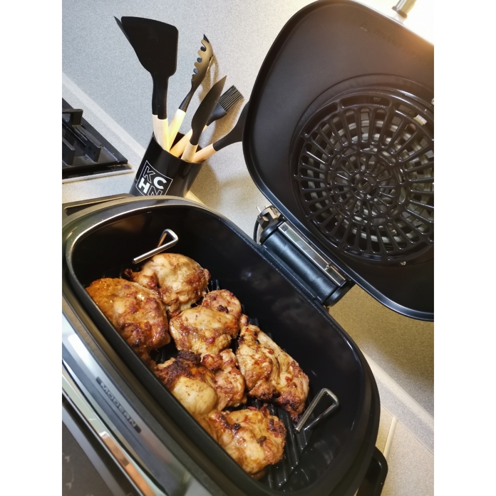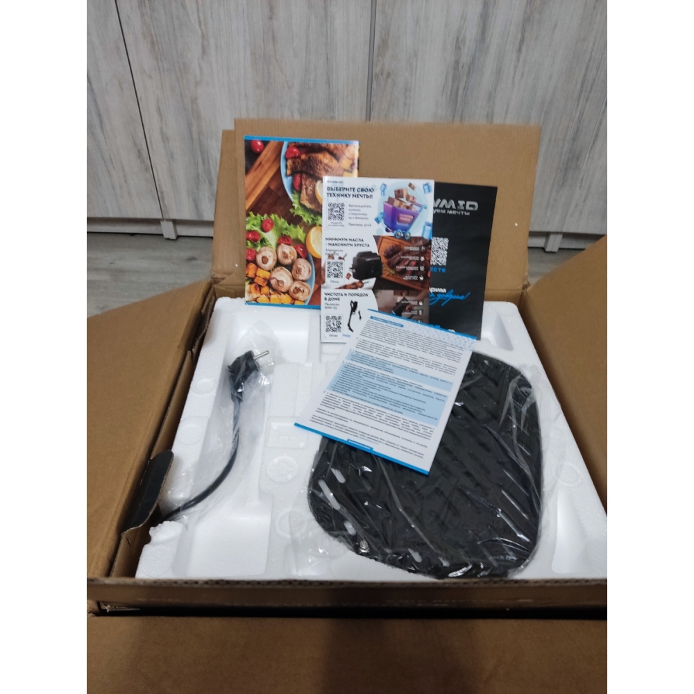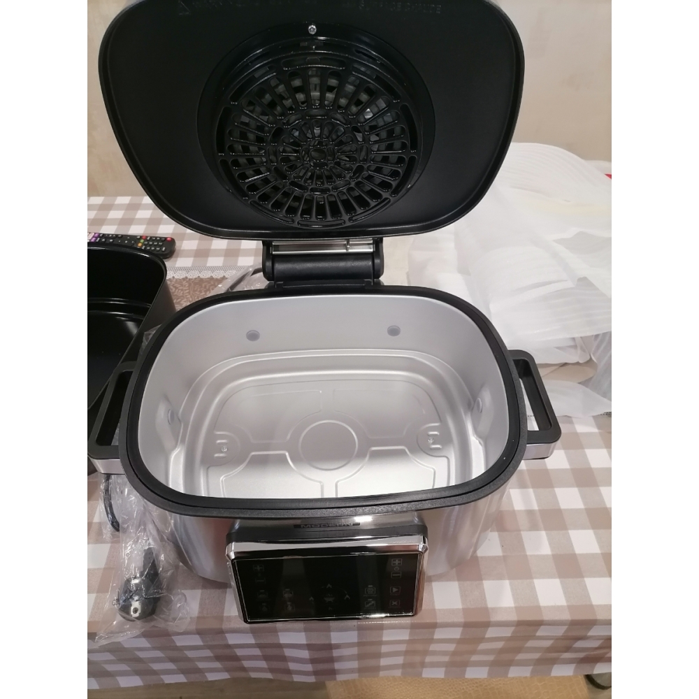 Большой многолопастной вентилятор, расположенный в верхней крышке устройства, сквозная решётка-гриль и обтекаемая форма чаши для запекания обеспечивают мощный и равномерный со всех сторон 3D-обдув продуктов для их равномерной обработки горячим воздухом.