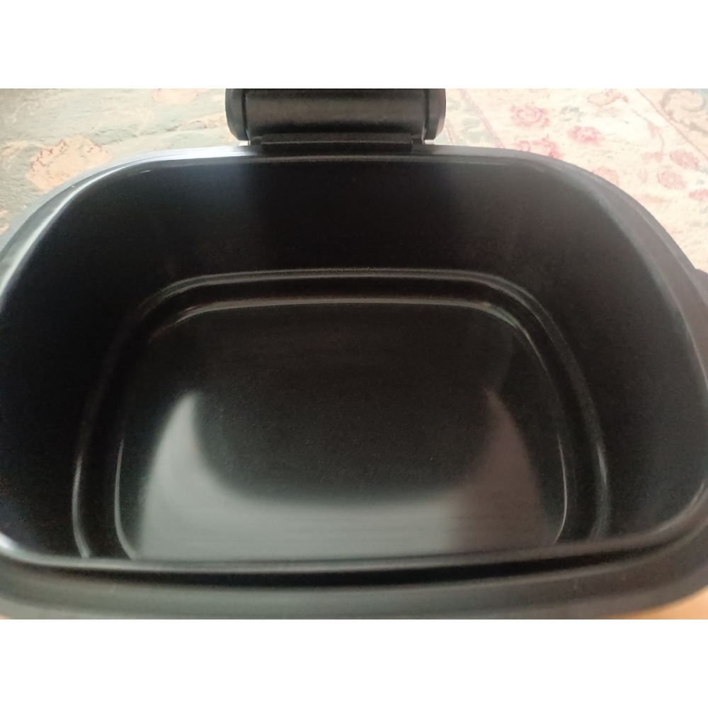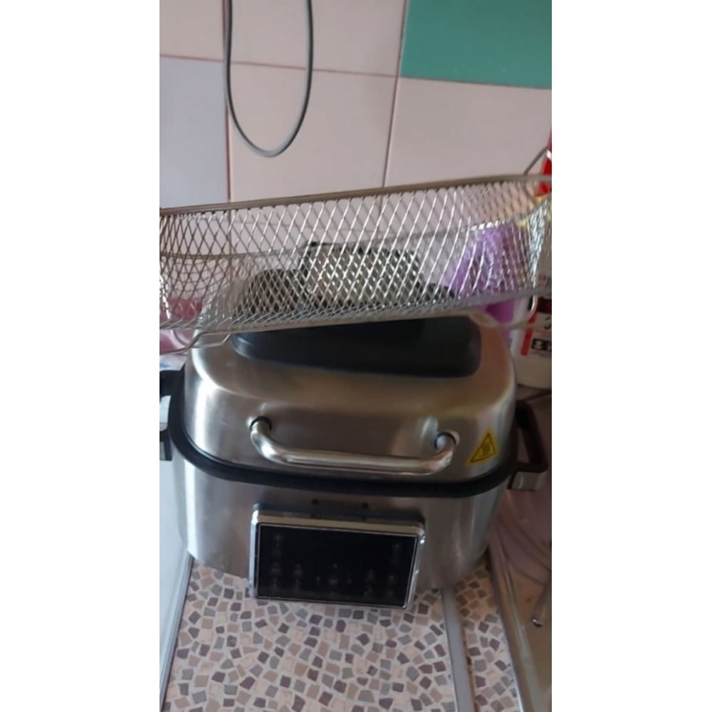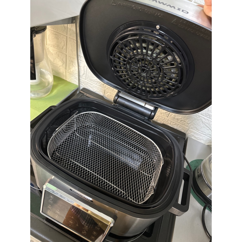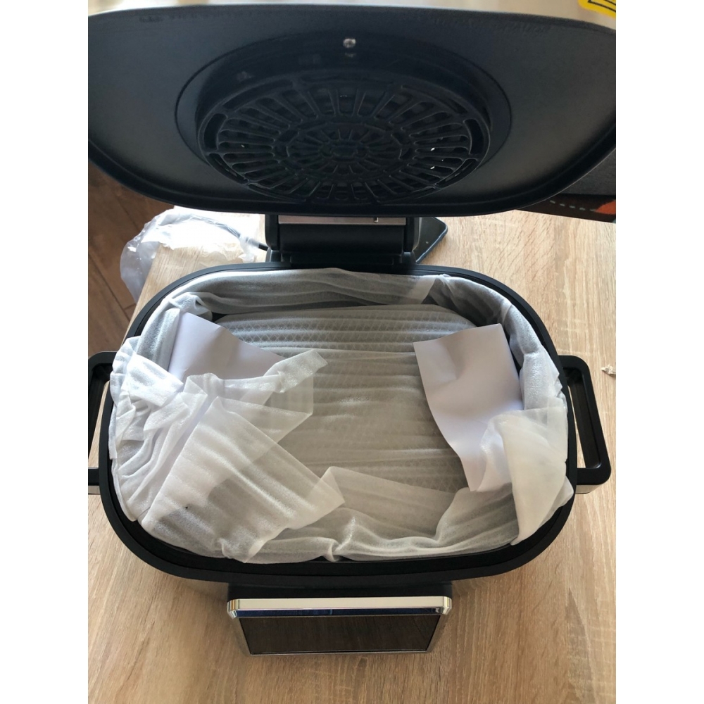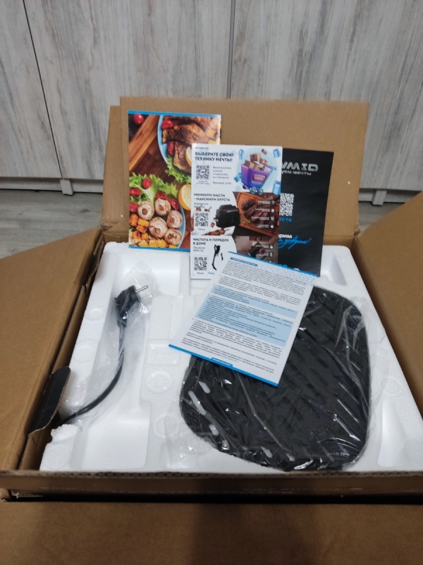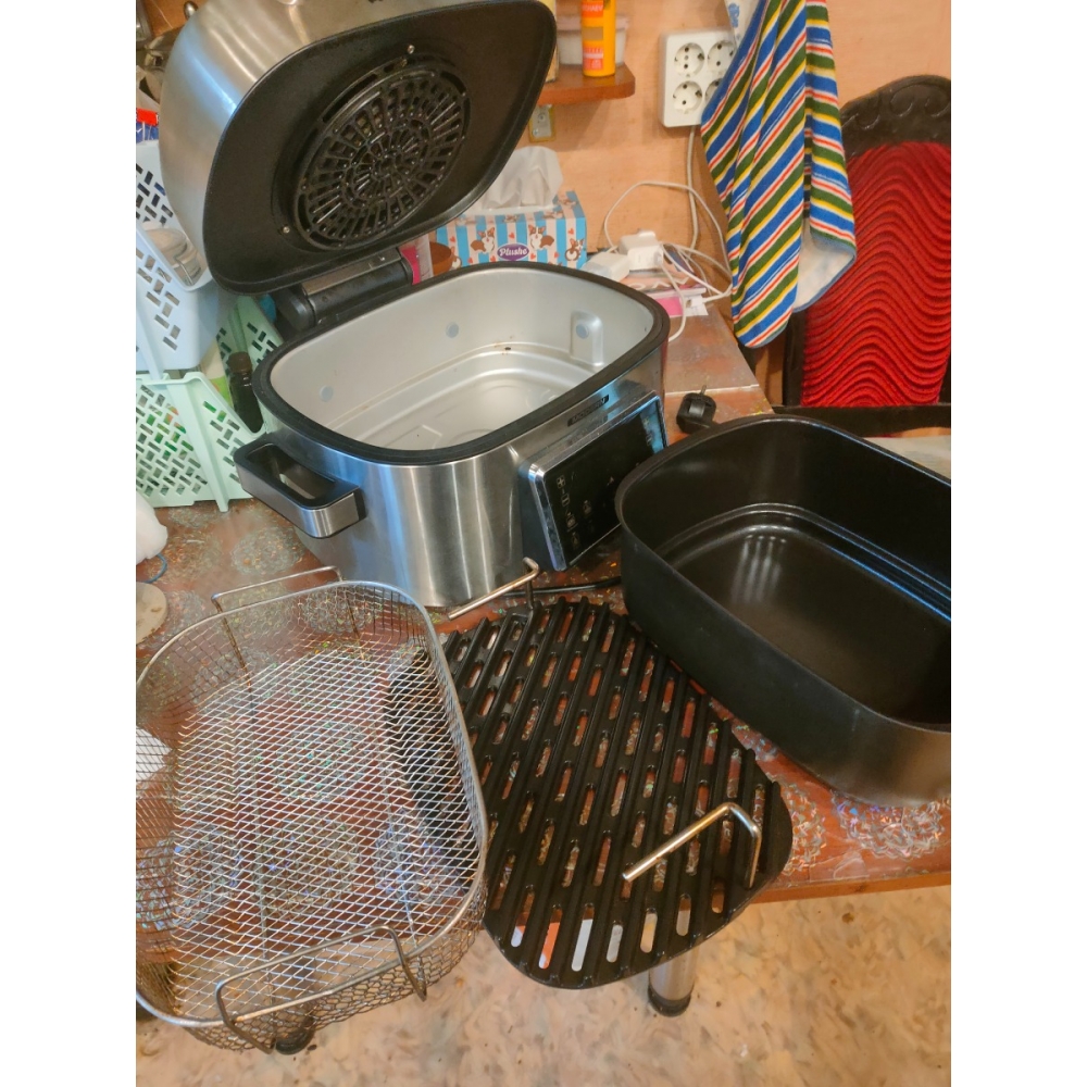 Большой многолопастной вентилятор, расположенный в верхней крышке устройства, сквозная решётка-гриль и обтекаемая форма чаши для запекания обеспечивают мощный и равномерный со всех сторон 3D-обдув продуктов для их равномерной обработки горячим воздухом.