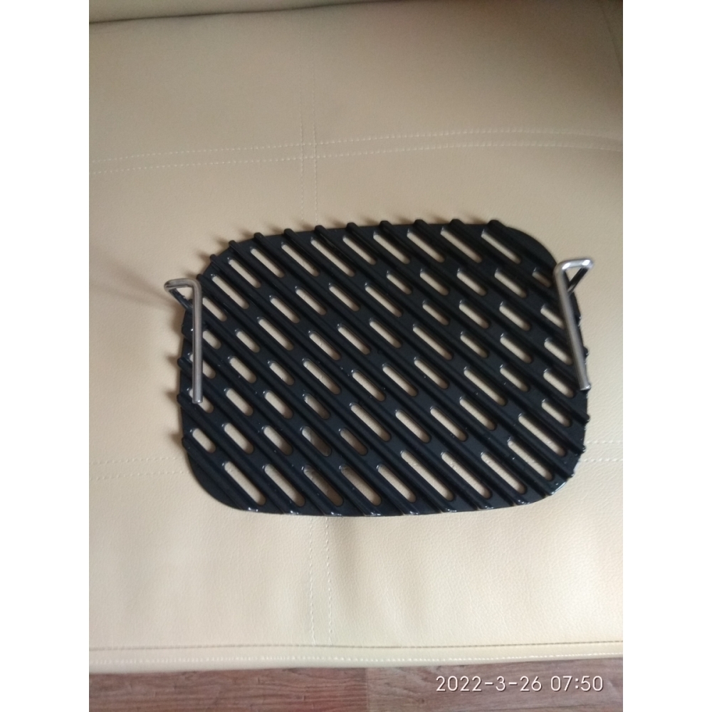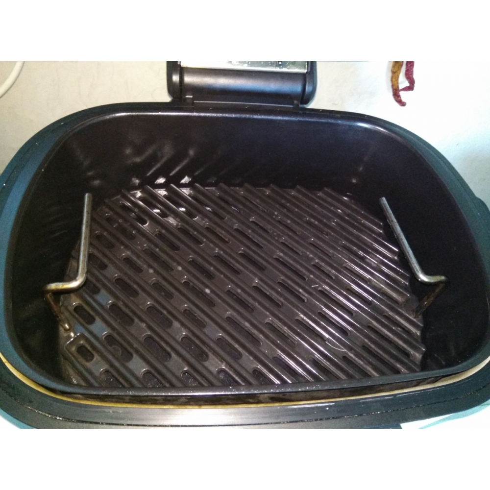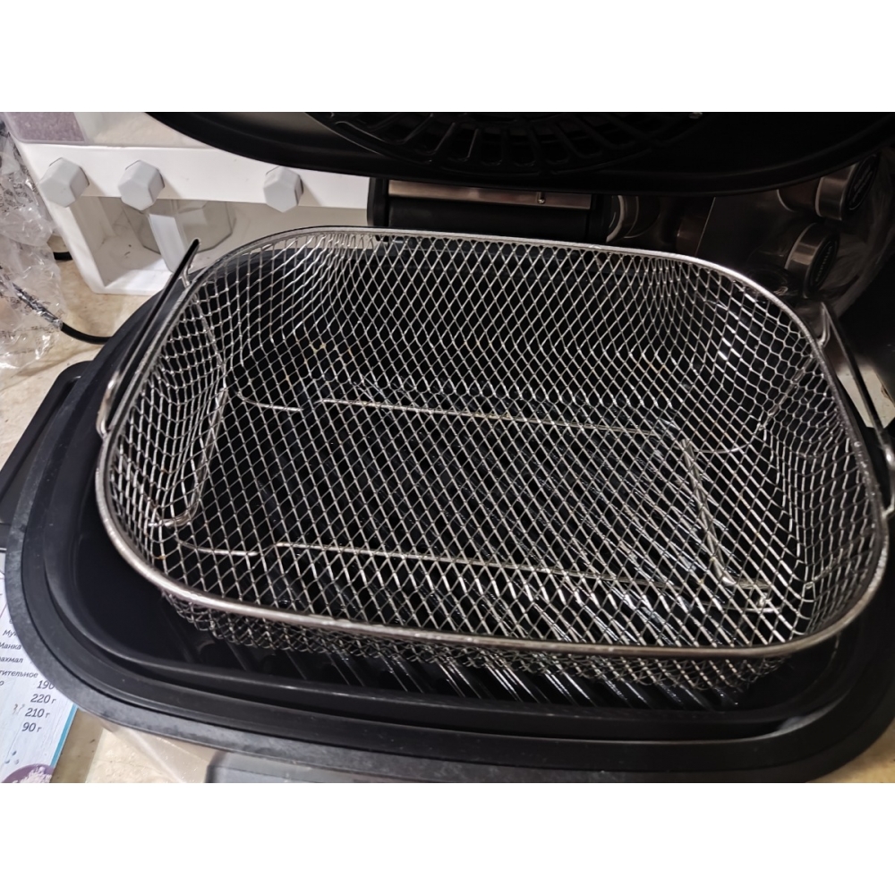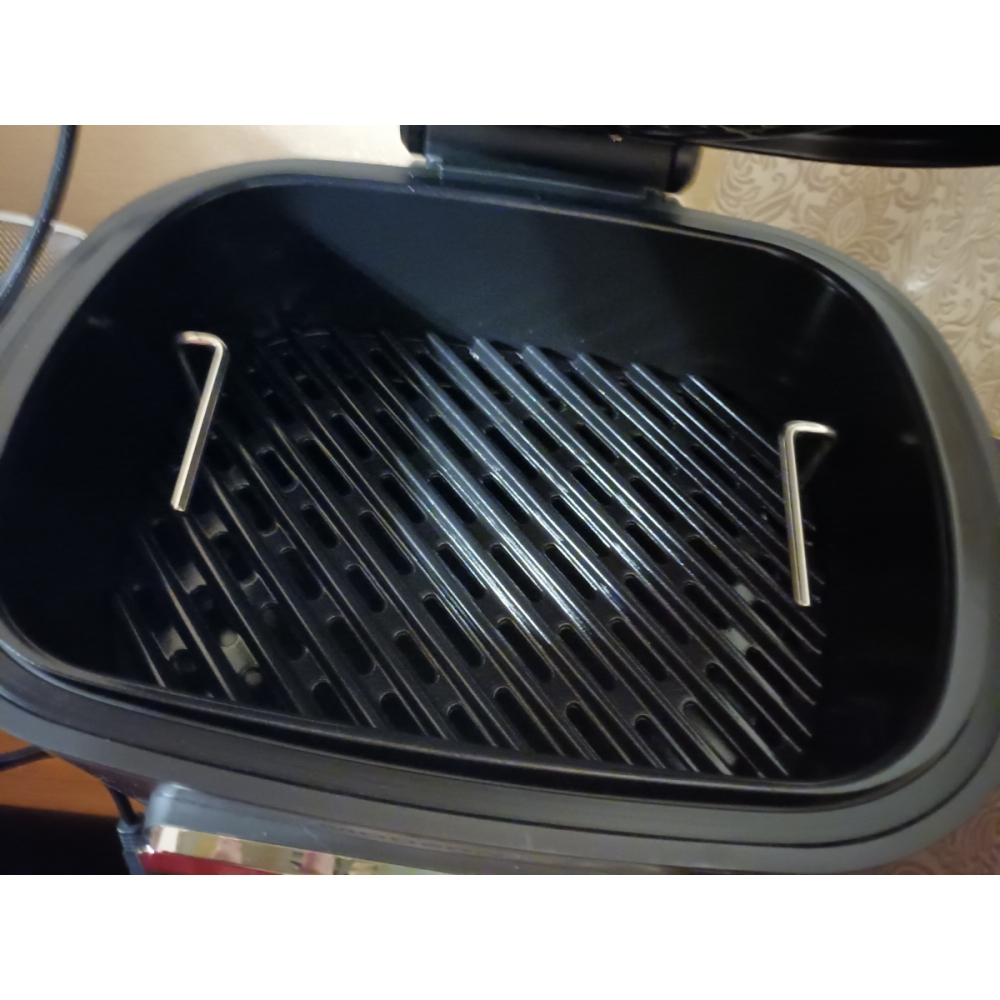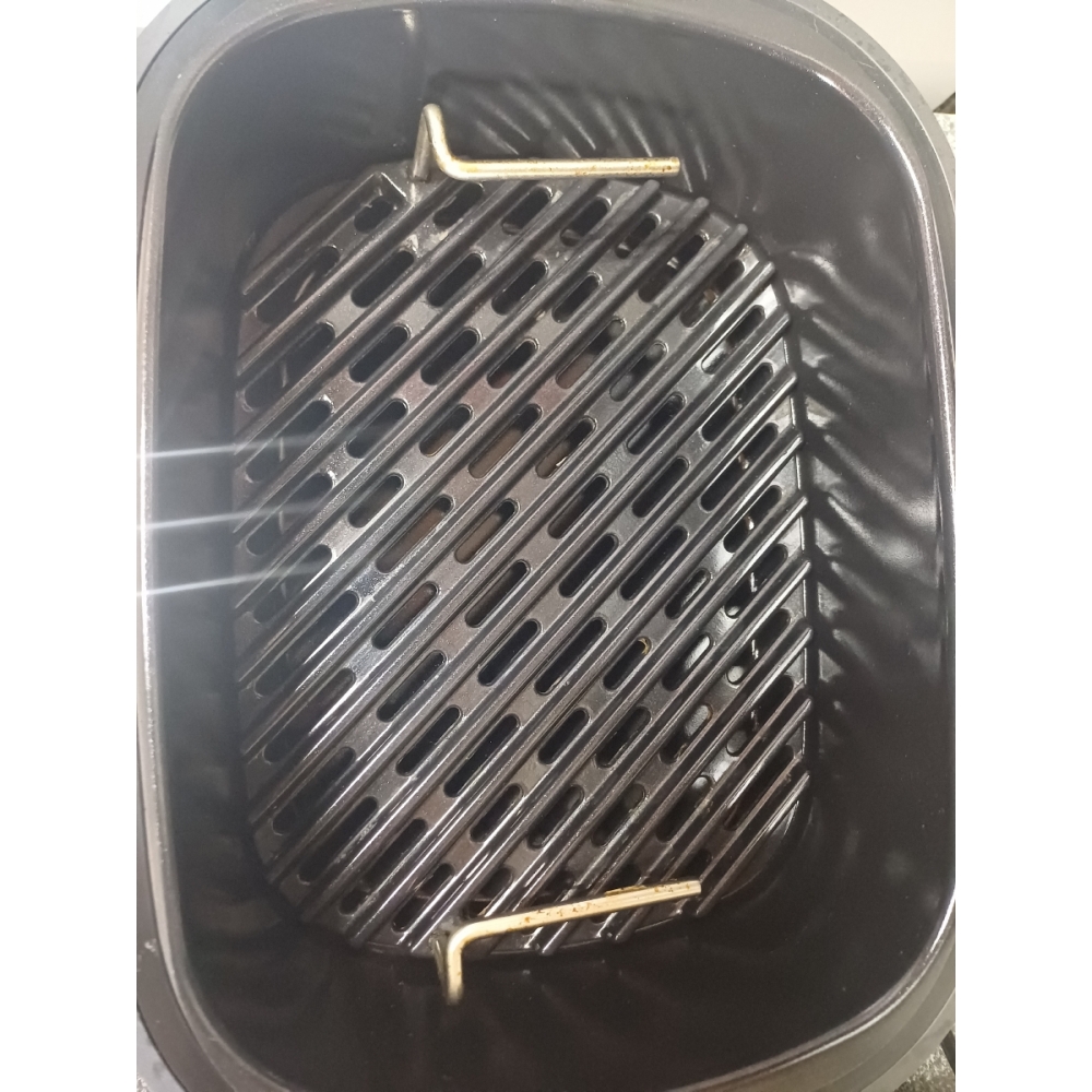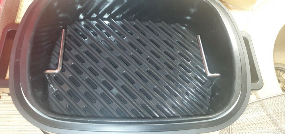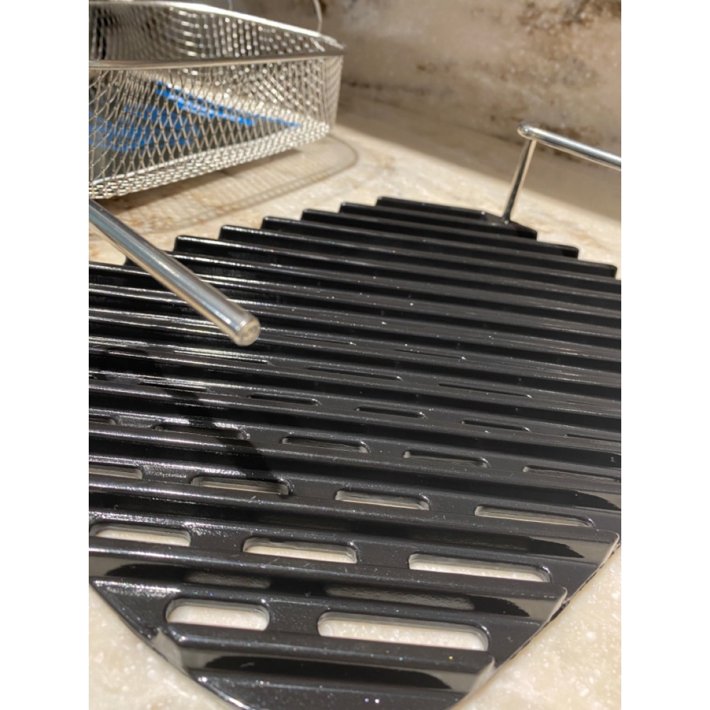 Рельефная решётка-гриль выполнена из цельного алюминиевого сплава, благодаря чему довольно лёгкая, но при этом обладает высокой прочностью и долгим сроком службы. Алюминиевая решётка не препятствует воздушному потоку и обладает высокой теплопроводностью, благодаря чему быстро нагревается в начале работы и быстро остывает по её окончании. Доставать решётку можно вместе с продуктами — благодаря съёмным ручкам по бокам. Поверхность имеет стойкое керамическое антипригарное покрытие, поэтому продукты не пригорают и не прилипают к поверхности, а саму решётку легко мыть.
