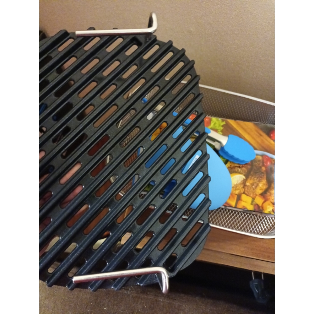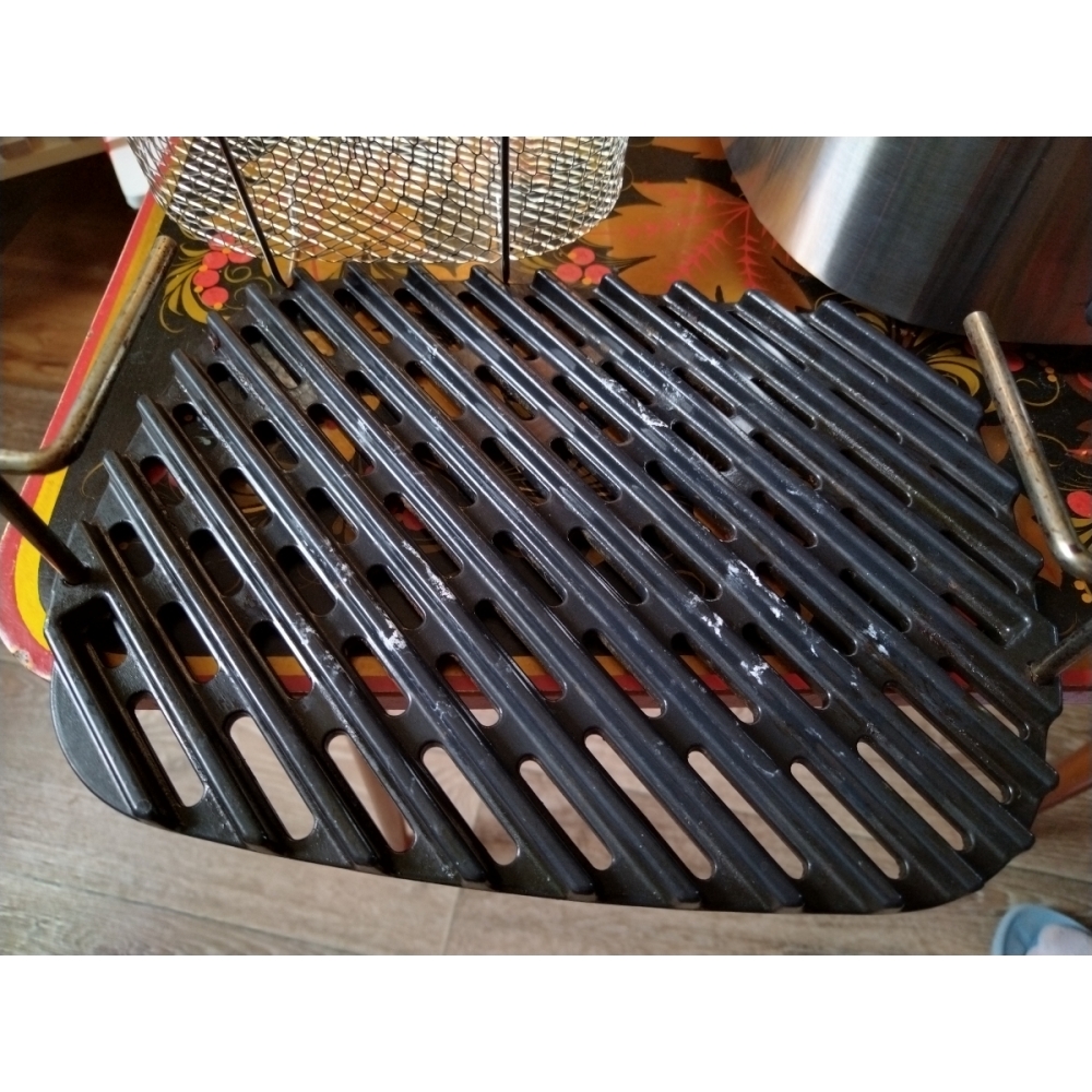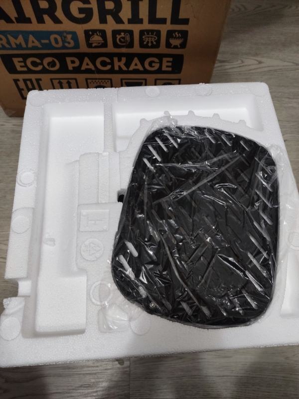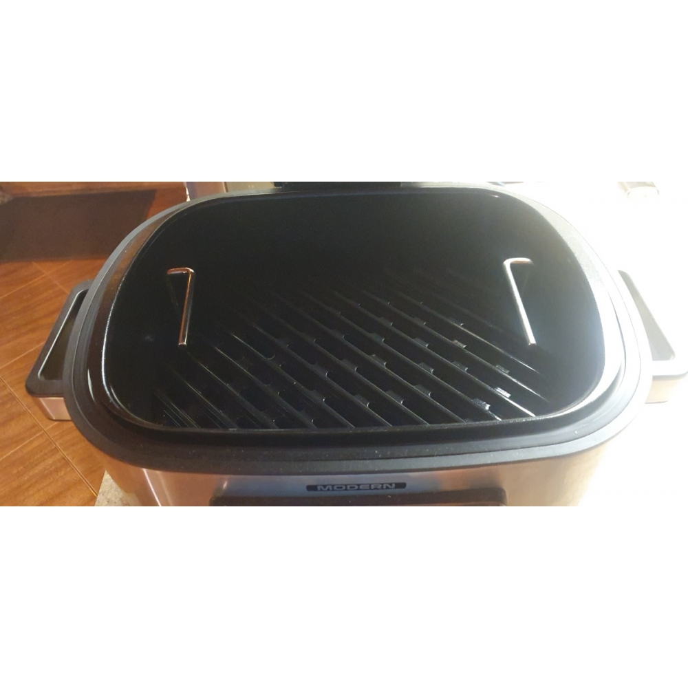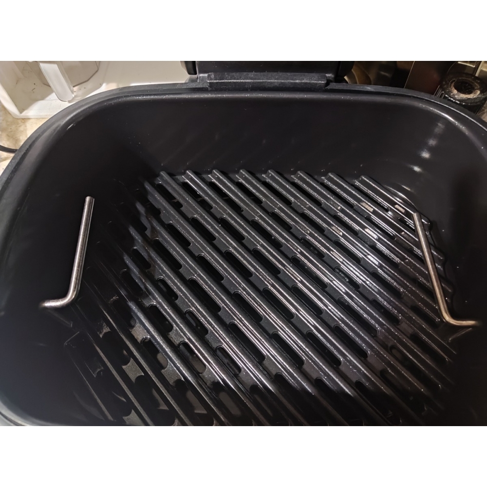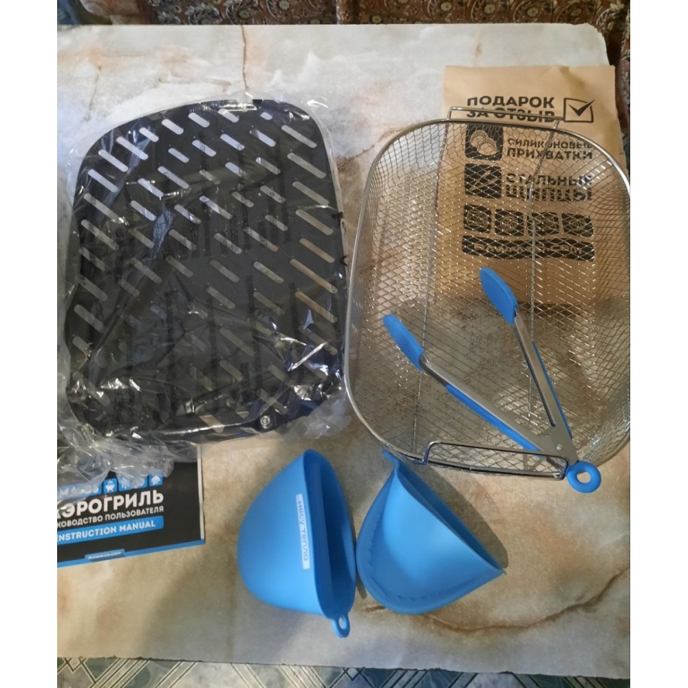 Рельефная решётка-гриль выполнена из цельного алюминиевого сплава, благодаря чему довольно лёгкая, но при этом обладает высокой прочностью и долгим сроком службы. Алюминиевая решётка не препятствует воздушному потоку и обладает высокой теплопроводностью, благодаря чему быстро нагревается в начале работы и быстро остывает по её окончании. Доставать решётку можно вместе с продуктами — благодаря съёмным ручкам по бокам. Поверхность имеет стойкое керамическое антипригарное покрытие, поэтому продукты не пригорают и не прилипают к поверхности, а саму решётку легко мыть.