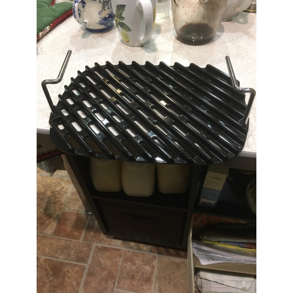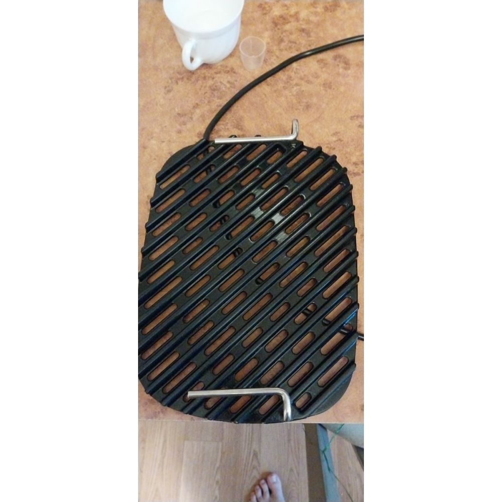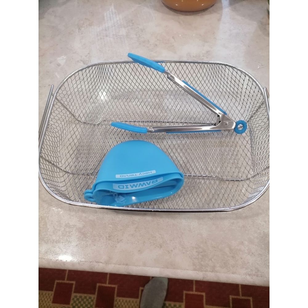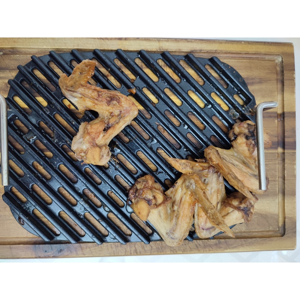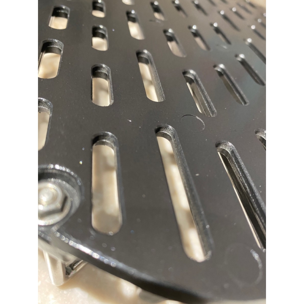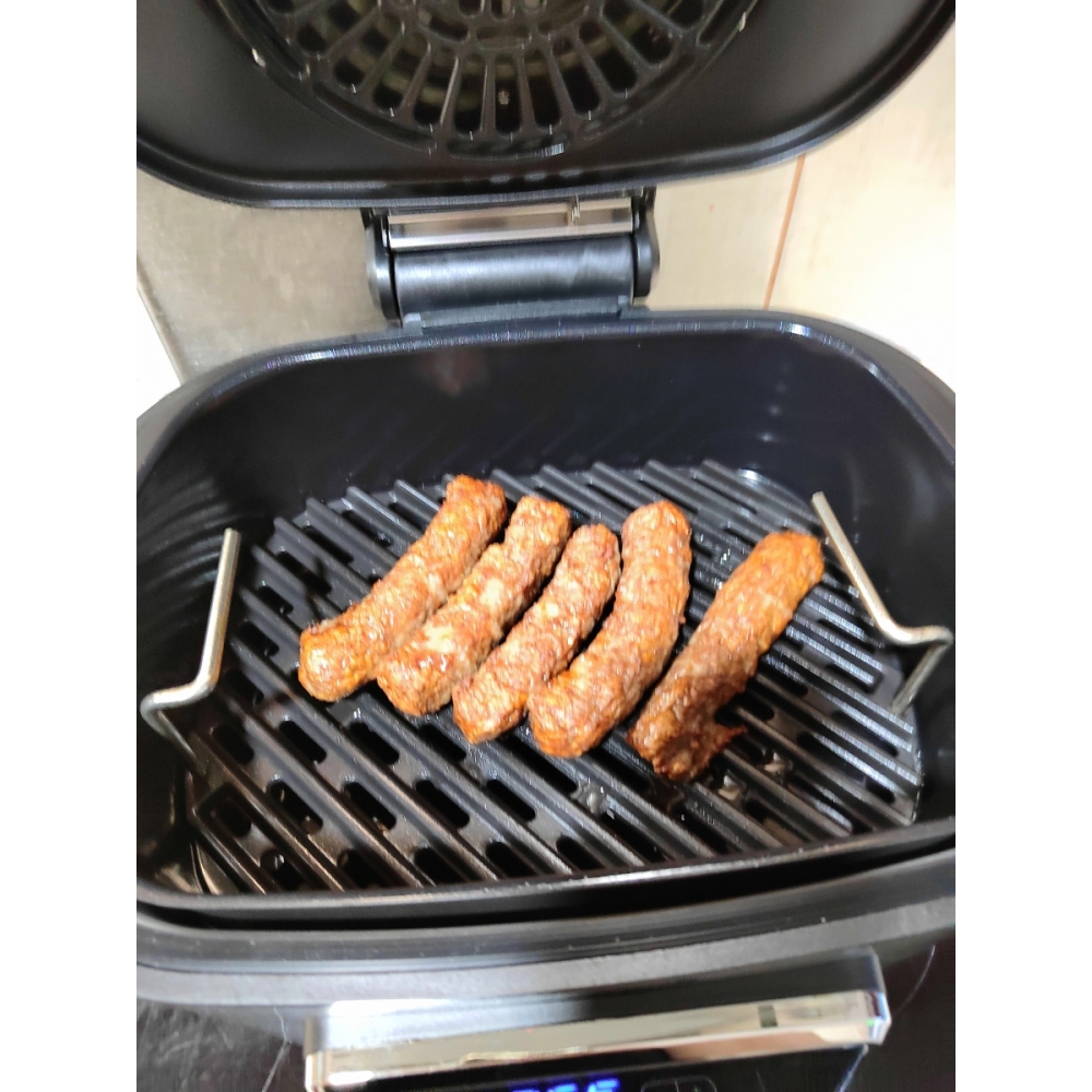Рельефная решётка-гриль выполнена из цельного алюминиевого сплава, благодаря чему довольно лёгкая, но при этом обладает высокой прочностью и долгим сроком службы. Алюминиевая решётка не препятствует воздушному потоку и обладает высокой теплопроводностью, благодаря чему быстро нагревается в начале работы и быстро остывает по её окончании. Доставать решётку можно вместе с продуктами — благодаря съёмным ручкам по бокам. Поверхность имеет стойкое керамическое антипригарное покрытие, поэтому продукты не пригорают и не прилипают к поверхности, а саму решётку легко мыть.