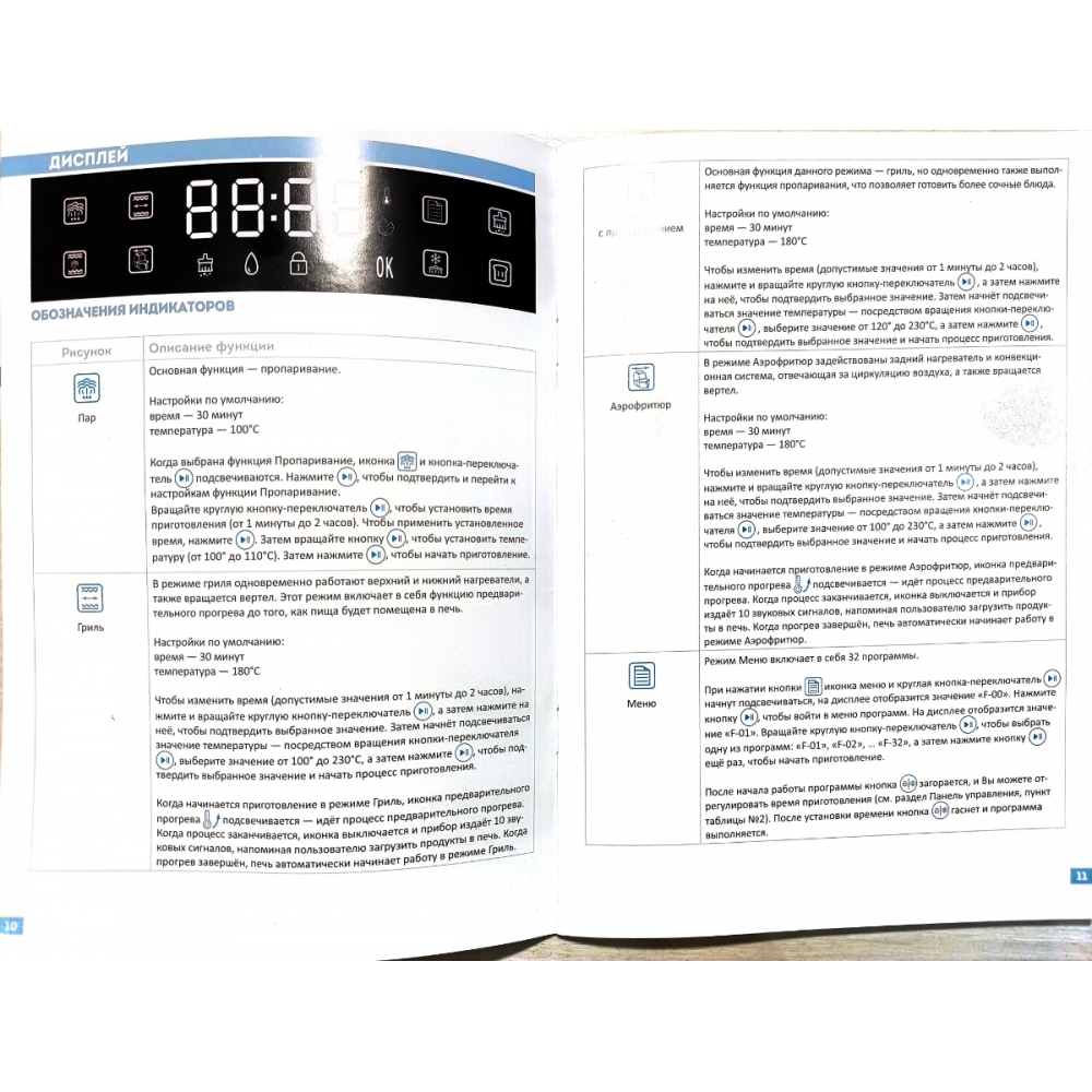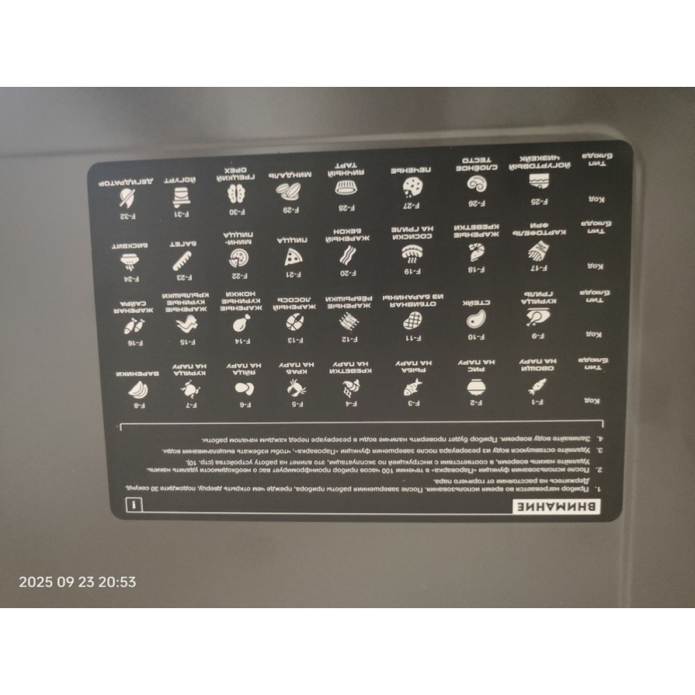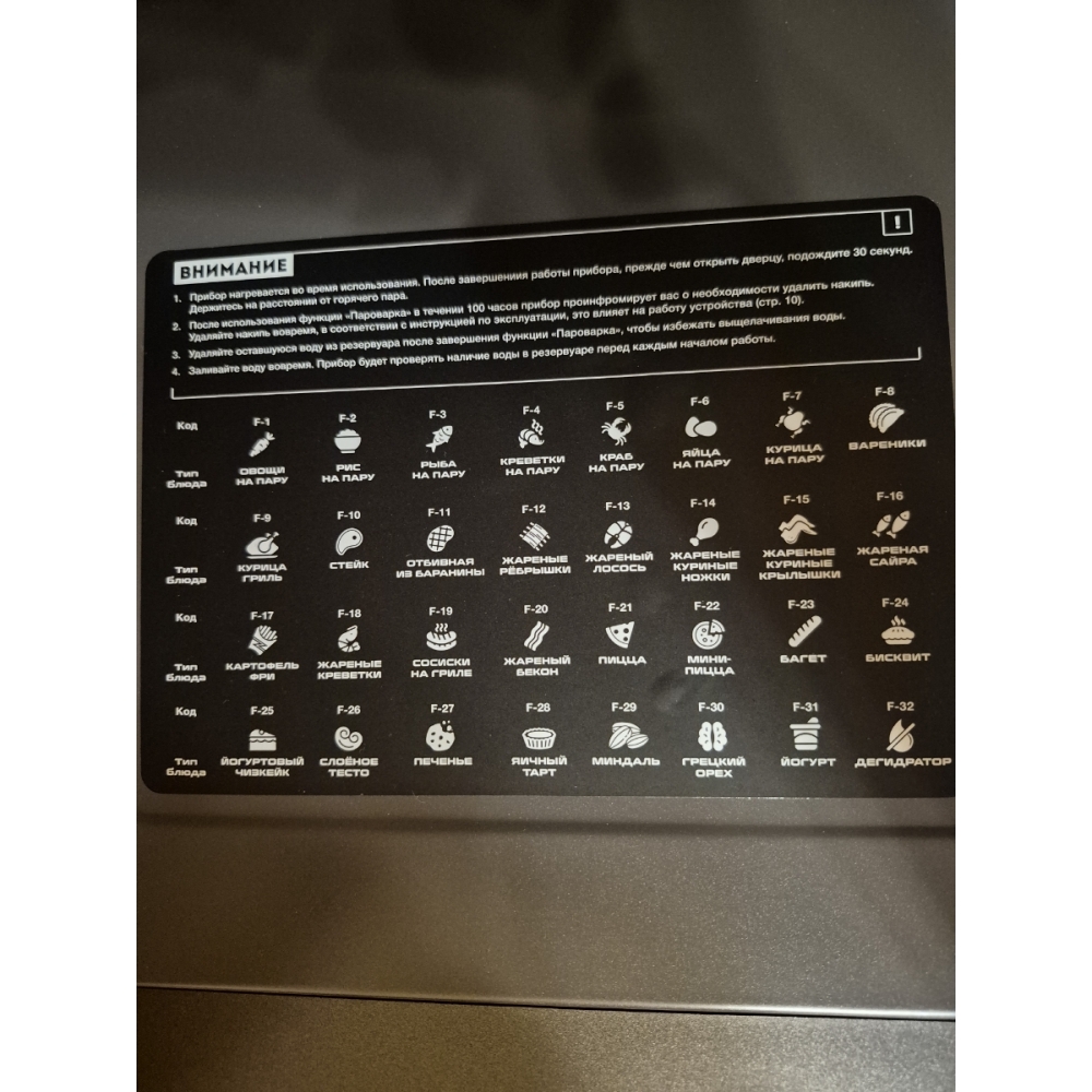 В печи предусмотрено 32 автоматических режима для приготовления различных блюд и выполнения различных задач: пироги, десерты, овощи на пару, жареная курица, пицца, хлеб, печенье, картофель-фри, йогурт и многое другое.