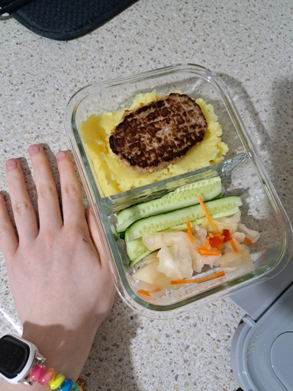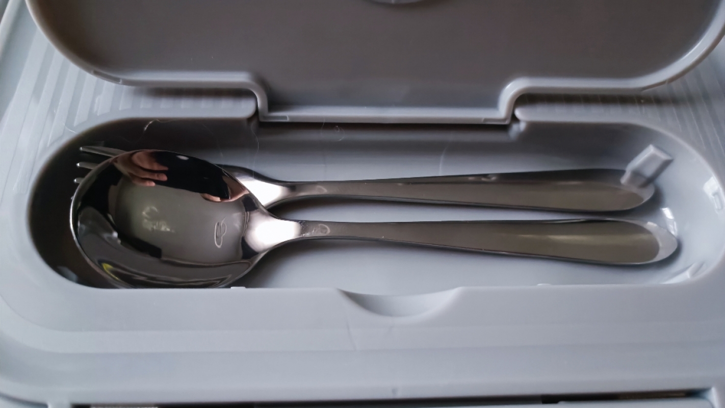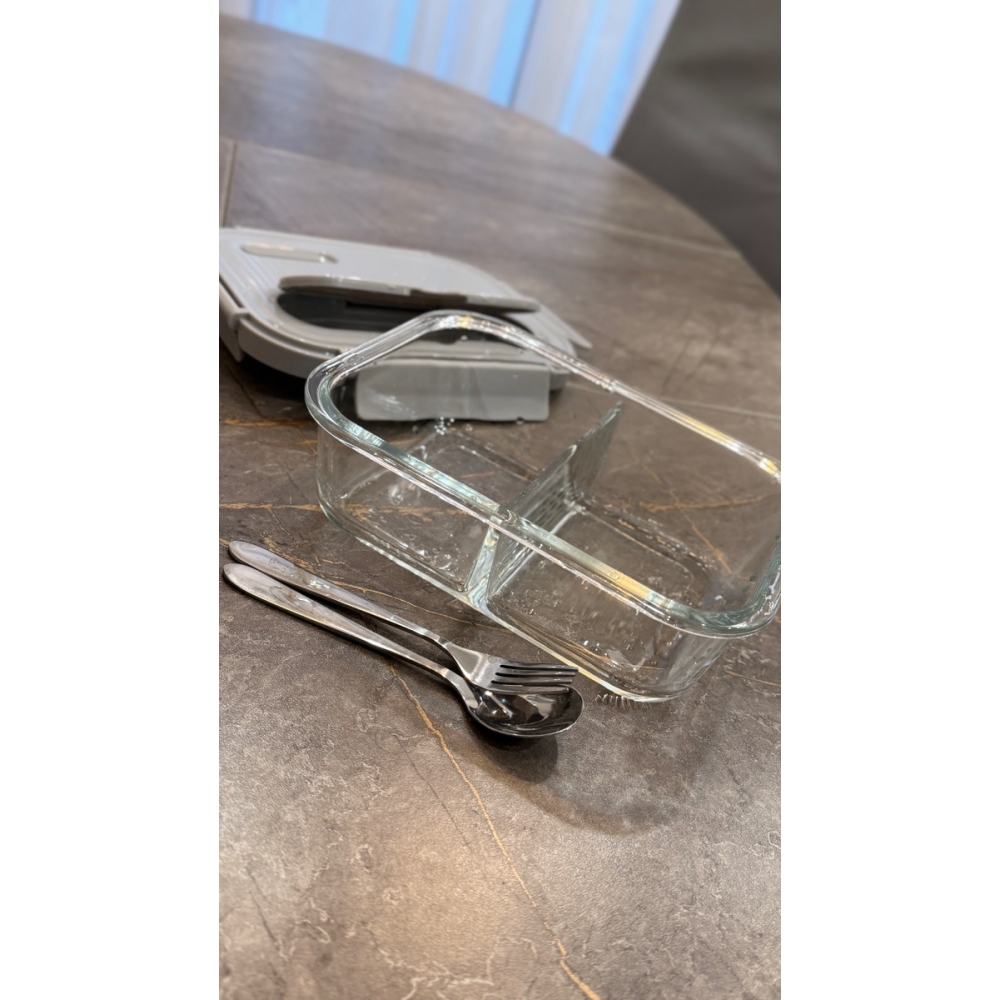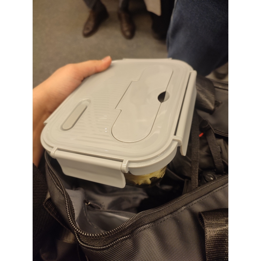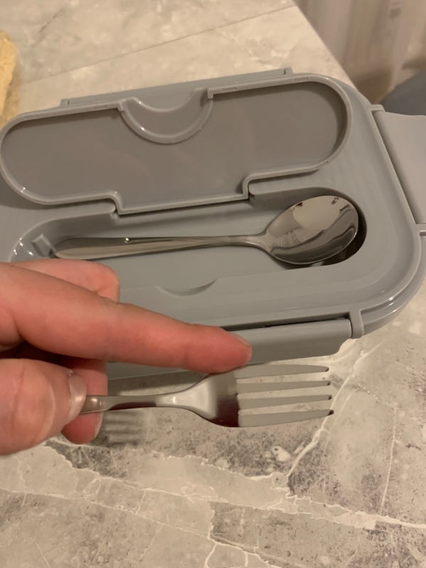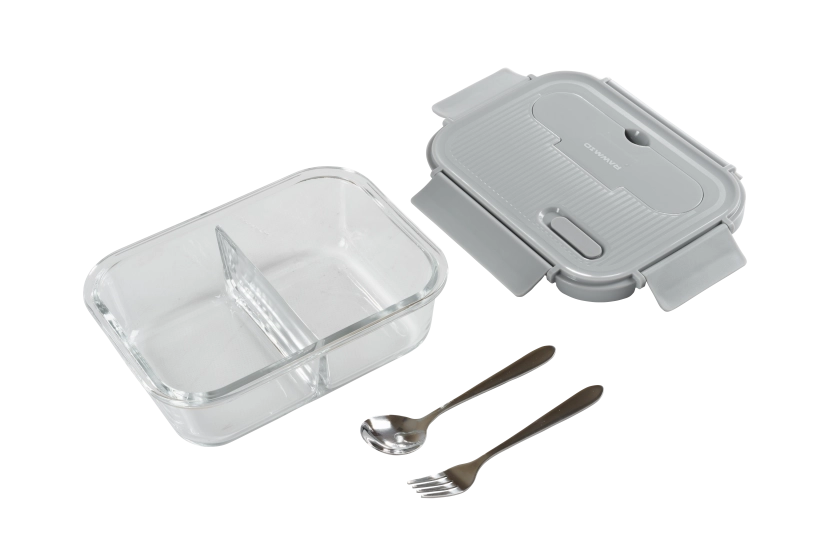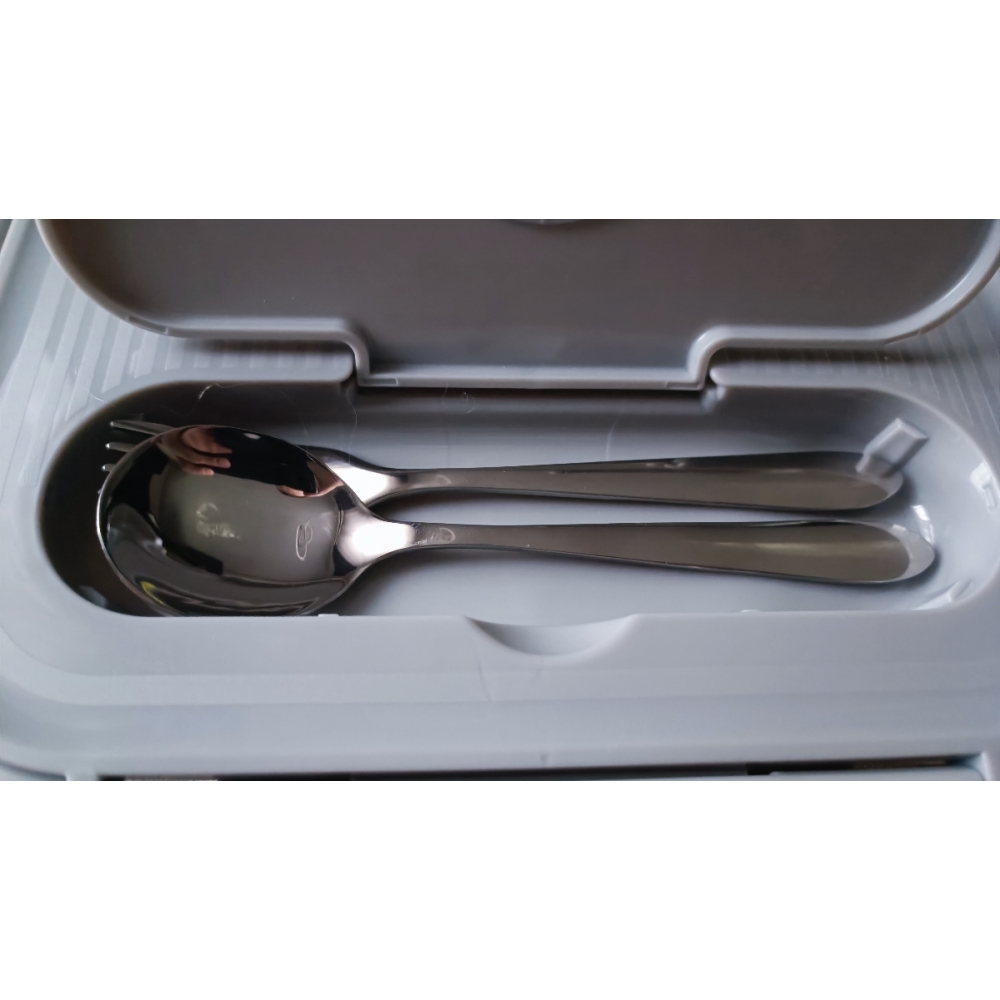 Продуманная конструкция с двумя отделениями позволяет брать с собой полноценный обед: основное блюдо, гарнир или закуску. Герметичная крышка с силиконовым уплотнителем и надёжными защёлками защищает от проливаний и помогает сохранить свежесть продуктов. Верхний отсек крышки аккуратно скрывает вилку и ложку, которые всегда под рукой — удобно в дороге, на работе или во время учёбы.