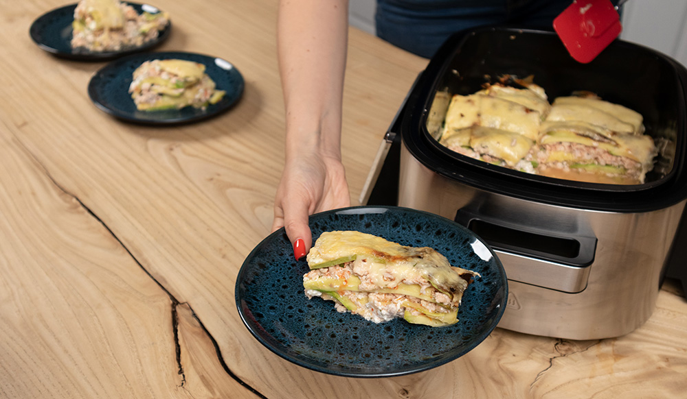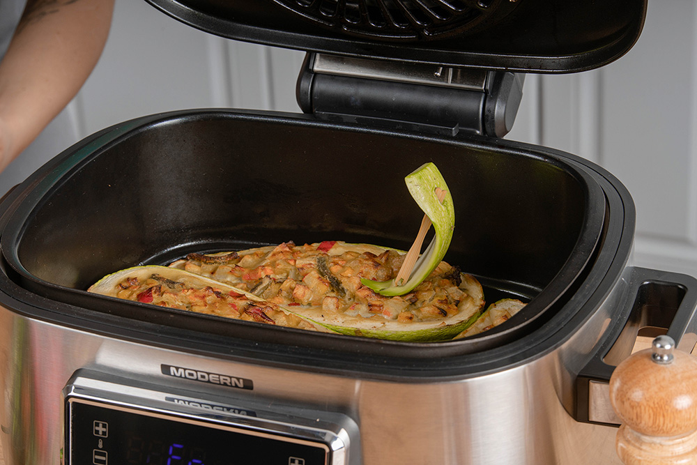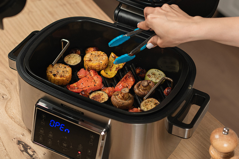 Сама чаша с высокими бортиками, на 6 литров, совместно с нагревательным элементом создает замкнутый контур внутри которого и происходит 3D-обдув. При этом блюда не деформируются и не пережариваются. И можно приготовить продукты разной высоты, чего не сделаешь, например, в контактном гриле.