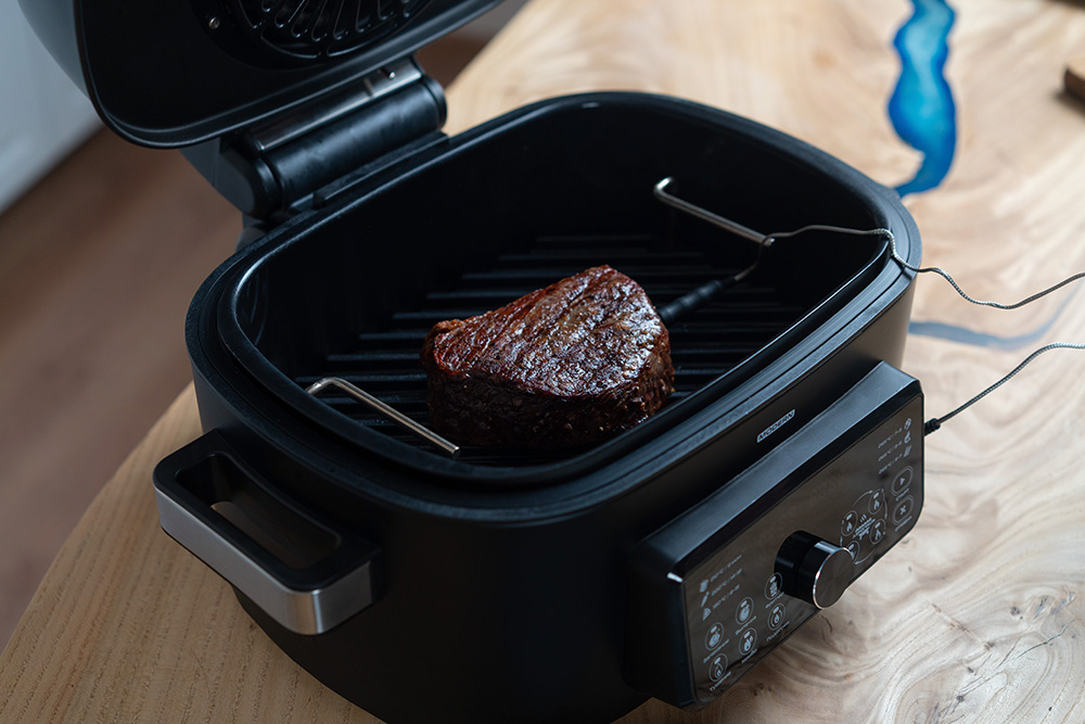 В режиме с термощупом можно выставить температуру от 55 до 90 градусов в зависимости от степени прожарки, которую вы хотите получить. После того как необходимая температура будет достигнута, аэрогриль выключится автоматически. Также в гриле есть ещё 3 автоматических режима "гриль контроль" без использования термощупа от 200 до 265 градусов, время от 1 минуты до 30 минут, с возможностью варьировать эти показатели.