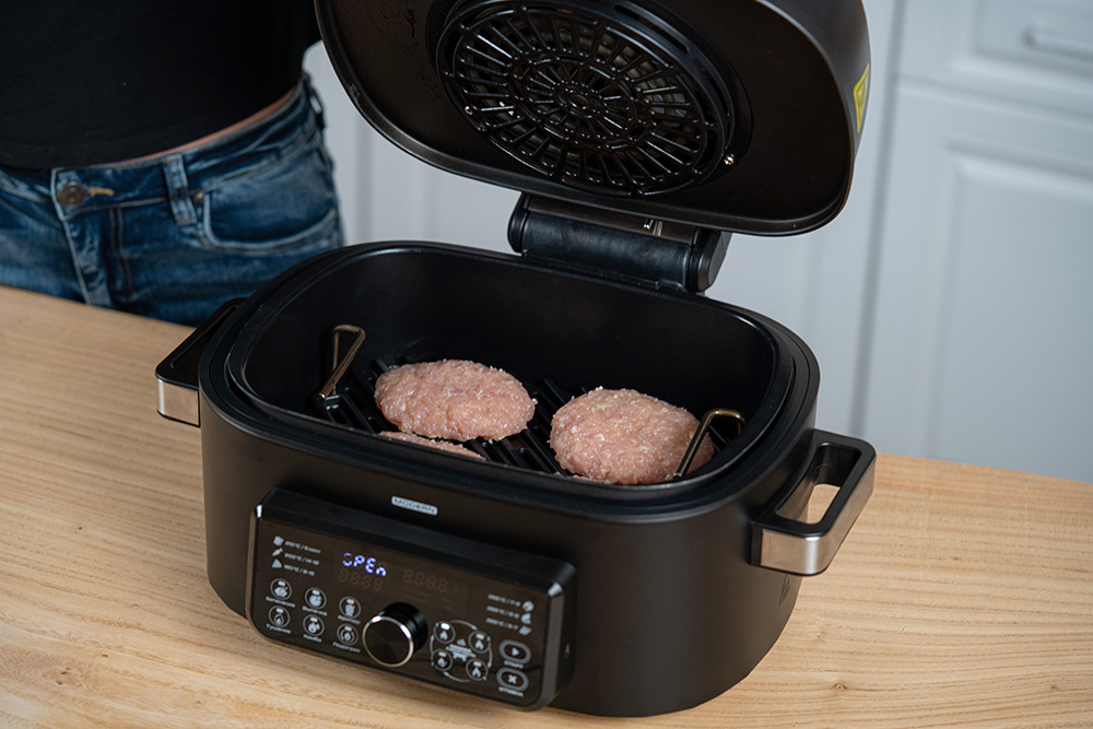 И в той, и в другой модели есть специальная цельнолитая алюминевая решётка гриль. Она быстро разогревается и быстро остывает. Разогревается — от потоков воздуха, и прожаривает продукт со всех сторон, для этого даже необязательно его переворачивать. Также прожарка осуществляется за счёт отверстий в самой решётке, обтекаемой формы чаши, 3D-обдува и чётко рассчитанного расстояния между чашей и нагревателем, о котором было сказано выше.