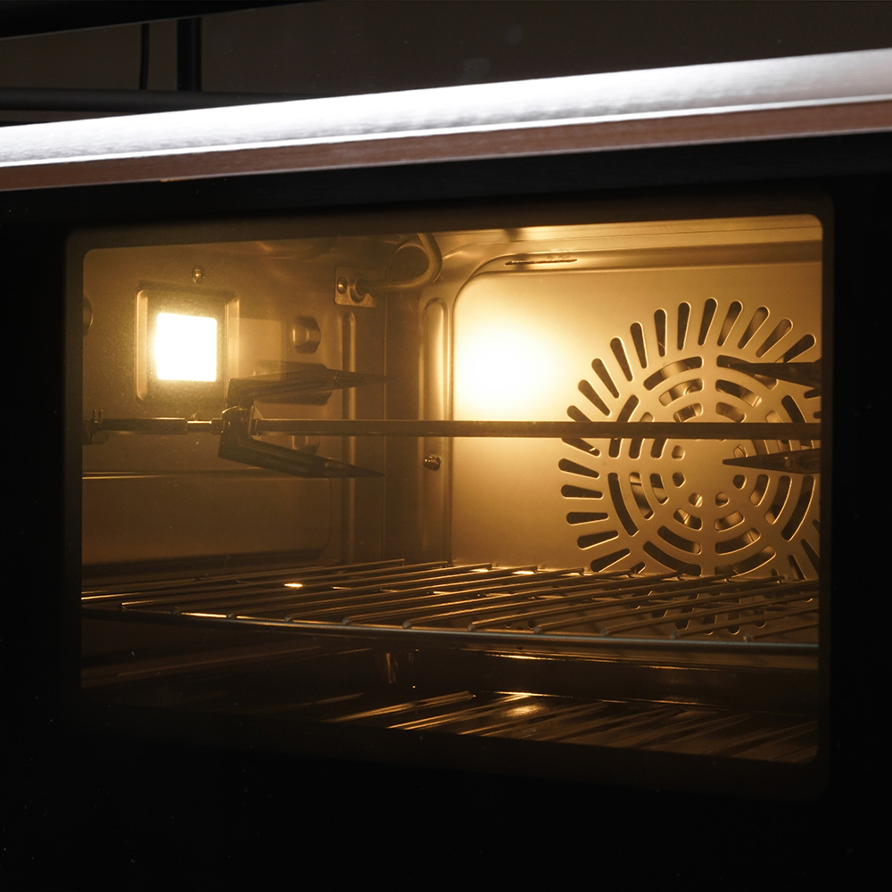 Тонированное стекло дверцы с голубоватым оттенком выполняет не только эстетическую функцию, но и позволяет наблюдать за процессом приготовления без потери тепла. Специальное жаростойкое покрытие выдерживает экстремальные температуры до 300°C.