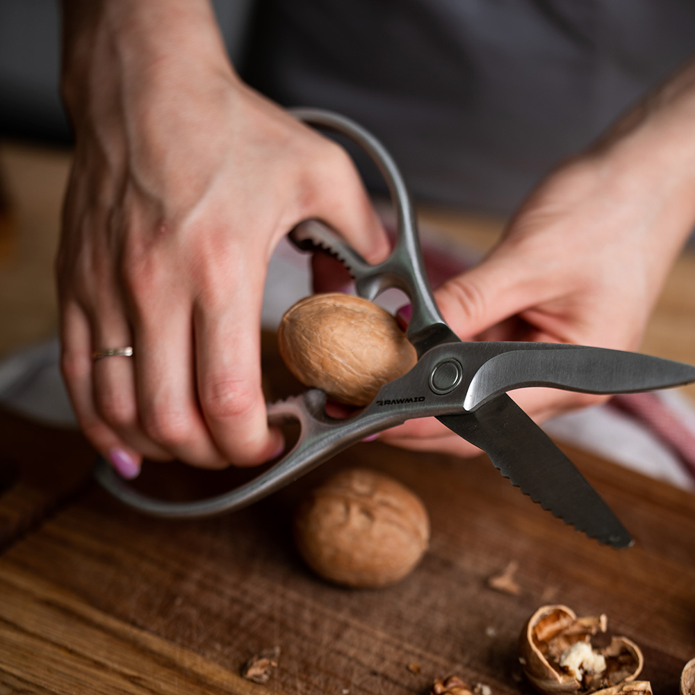 Универсальный инструмент, который подходит для чистки рыбы, раскалывания орехов, открывания бутылок и нарезки продуктов. Ножницы станут отличным дополнением к любой коллекции ножей.