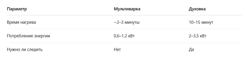 Мультиварка потребляет в 2–3 раза меньше энергии, чем духовой шкаф. И при этом быстрее набирает нужную температуру (в отличие от духовки, которой нужно 10–15 минут на прогрев).