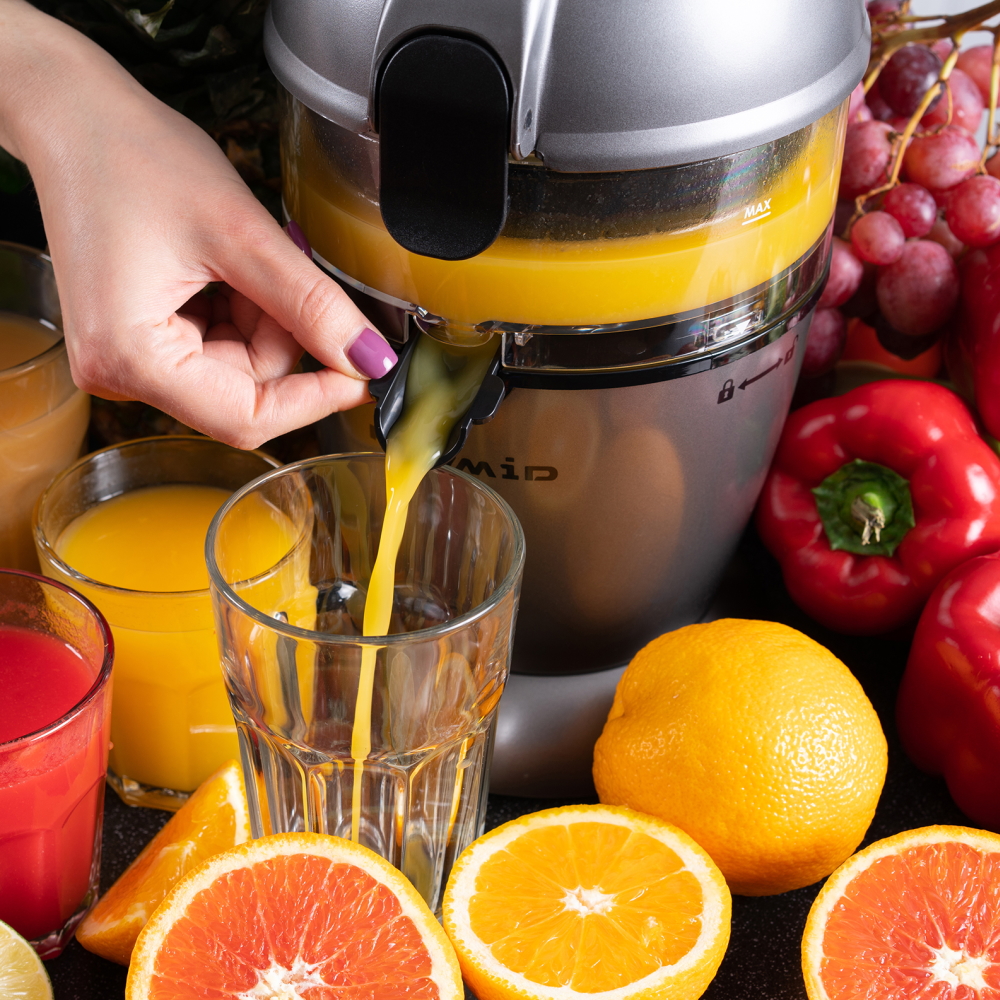 Гранат — один из самых сложных фруктов для обработки. Он жёсткий, его неудобно чистить, сок разбрызгивается при любом движении. Но RAWMID Mini RMJ-02 с этой задачей справляется уверенно: встроенный нож разрезает плод, а конусы выжимают сок, оставляя все косточки и кожицу в фильтрах. В результате, весь сок — прямо в стакане, а все отходы — аккуратно остаются внутри съёмных насадок. Всё это доказательство того, как технология работает на пользователя!