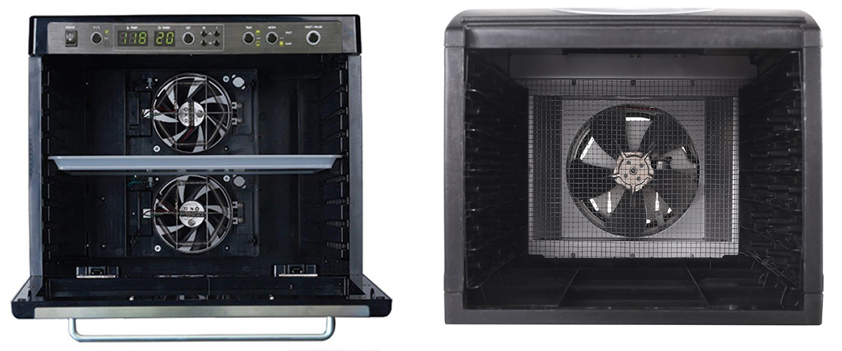 Некоторые производители ставят два вентилятора, но эта мера также показала себя неэффективной: вентиляторы в ряде случаев работают асинхронно, что ведёт к неравномерной просушке продуктов. Также два вентилятора способствуют большему энергопотреблению, а при перегрузках сети удваивается вероятность выхода из строя одного из вентиляторов. Данные проблемы во всей красе проявились в первой модели корейской Седоны, из-за чего компания Tribest (производитель Седоны) со временем отошли от двух вентиляторов в пользу одного.