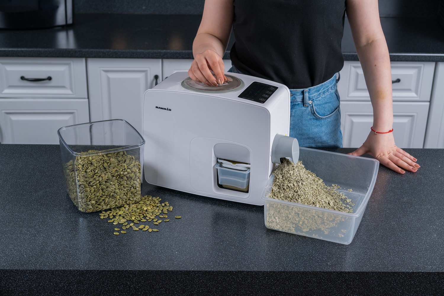Маслопресс RAWMID прост в использовании. Достаточно выбрать режим и нажать кнопку. Девайс предназначен для приготовления масла из арахиса, кунжута, подсолнечника, рапса, льна, грецкого ореха и других семян с содержанием масла более 30% .Не все семечки подходят для приготовления масла. Например, белый лен или семена с полосатой кожурой имеют в своем составе малое количество масла, поэтому отжимать их нет особого смысла. Благодаря автоматическому проталкиванию семян не нужно следить и выталкивать застрявшие ингредиенты самостоятельно.