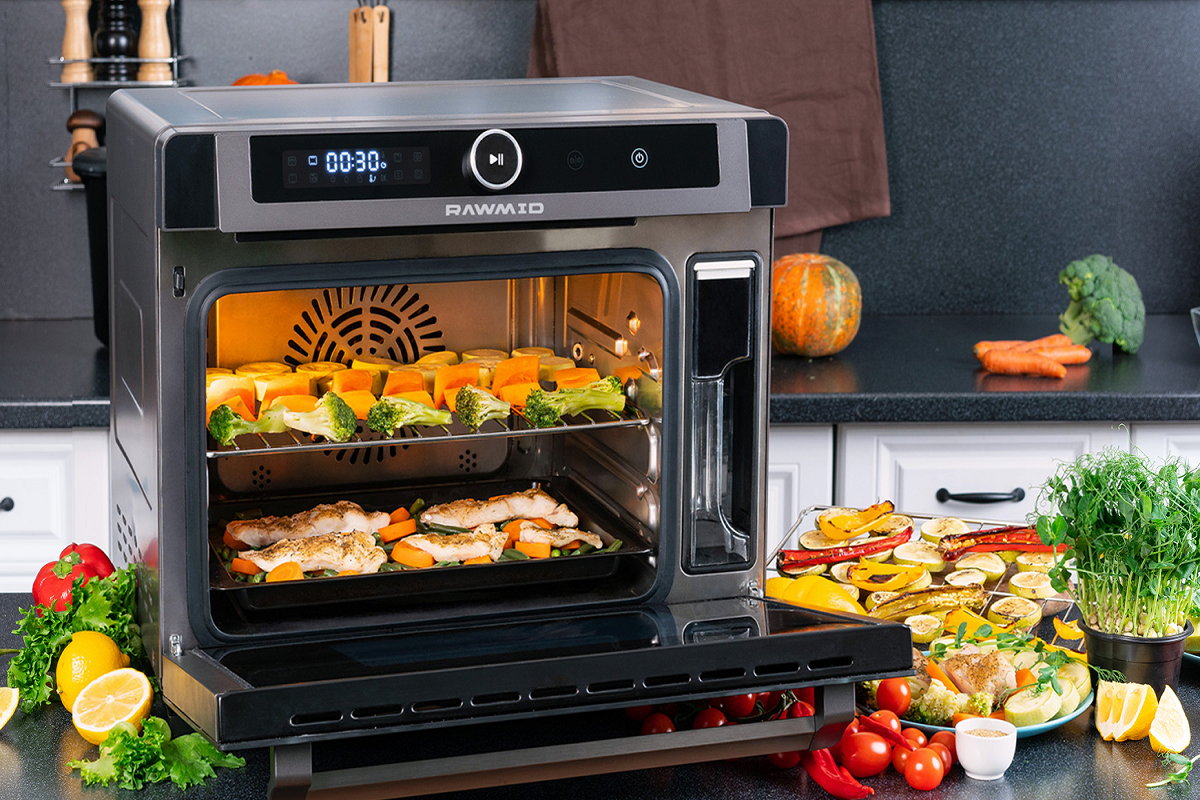 | Гриль + пропаривание | 120–230 °C (шаг 5 °C) | 1 мин–2 ч | Сначала пар, затем гриль для корочки |