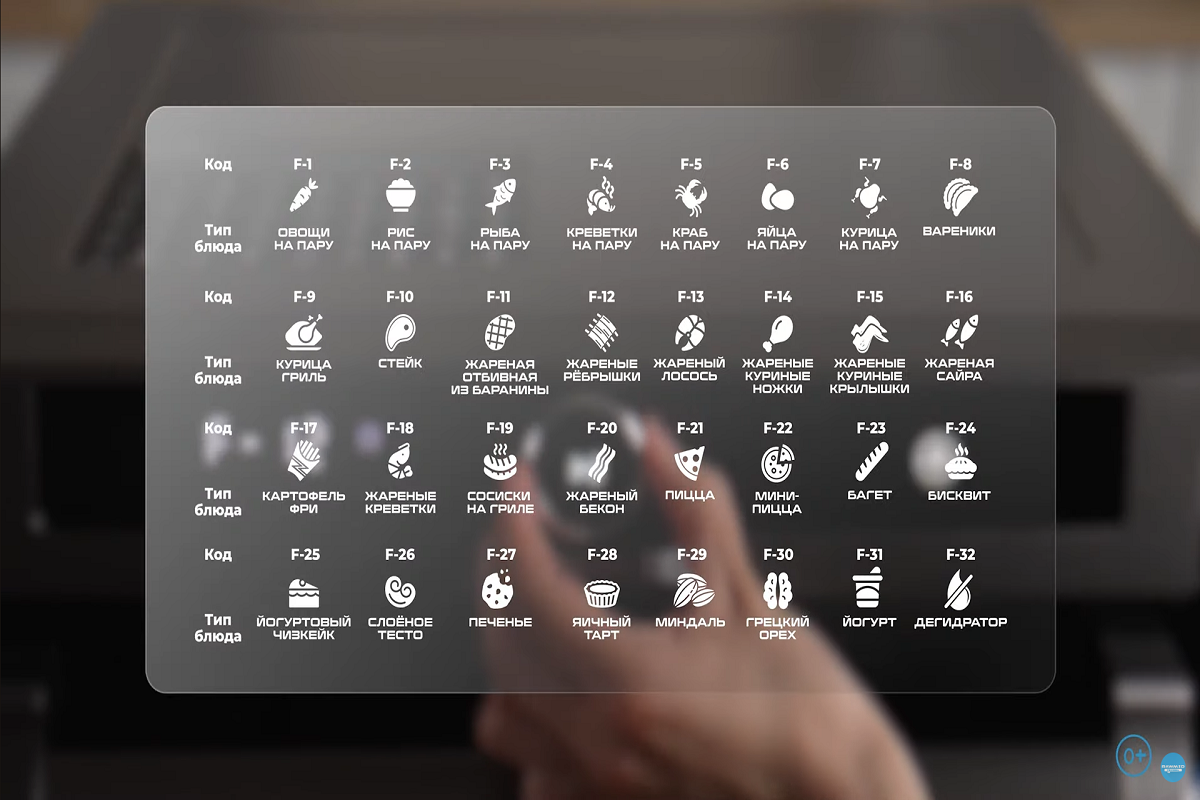 | Меню (32 программы) | фикс. диапазон* | фикс. диапазон* | Пицца, бисквит, чизкейк и др. (*время регулируется только в дегидраторе) |