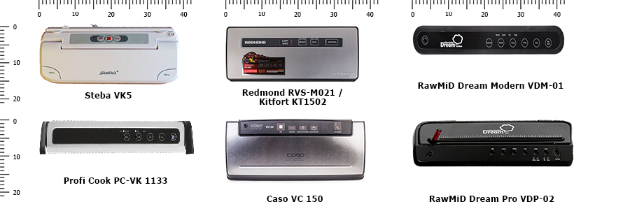 Для более наглядного сравнения габаритов можно взглянуть на них сверху – так очень легко представить, сколько места вакуумный упаковщик будет занимать на Вашем столе. Линейка в сантиметрах.