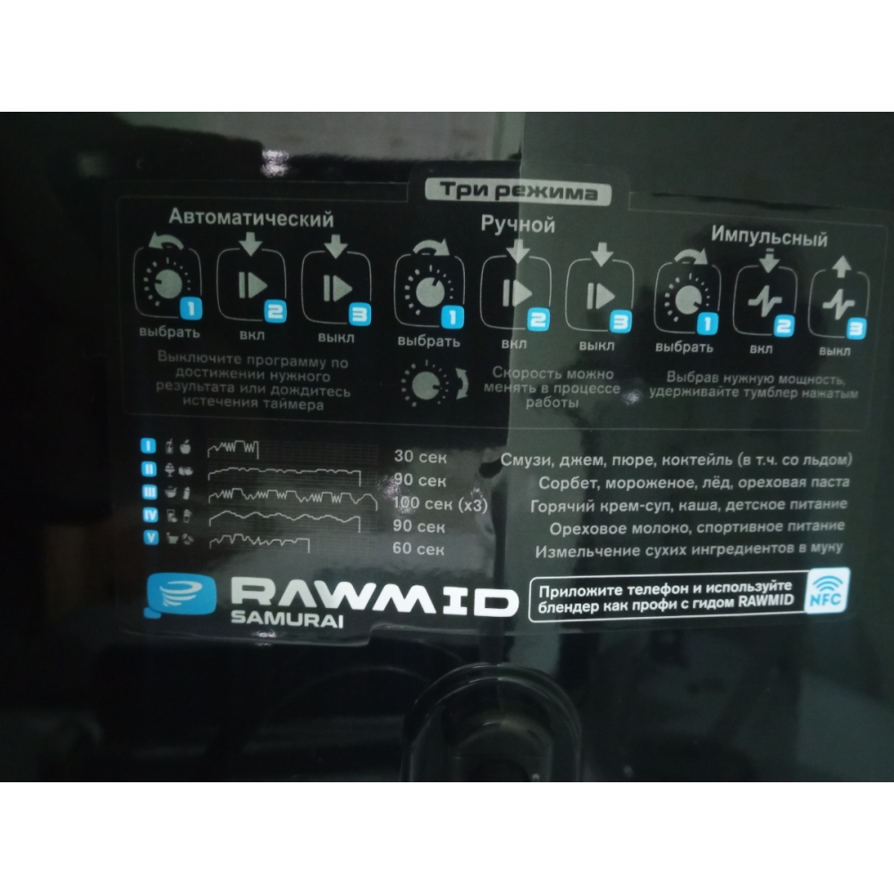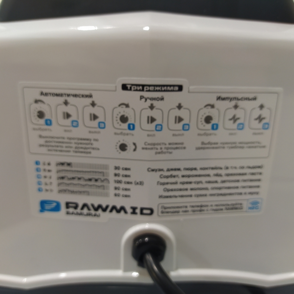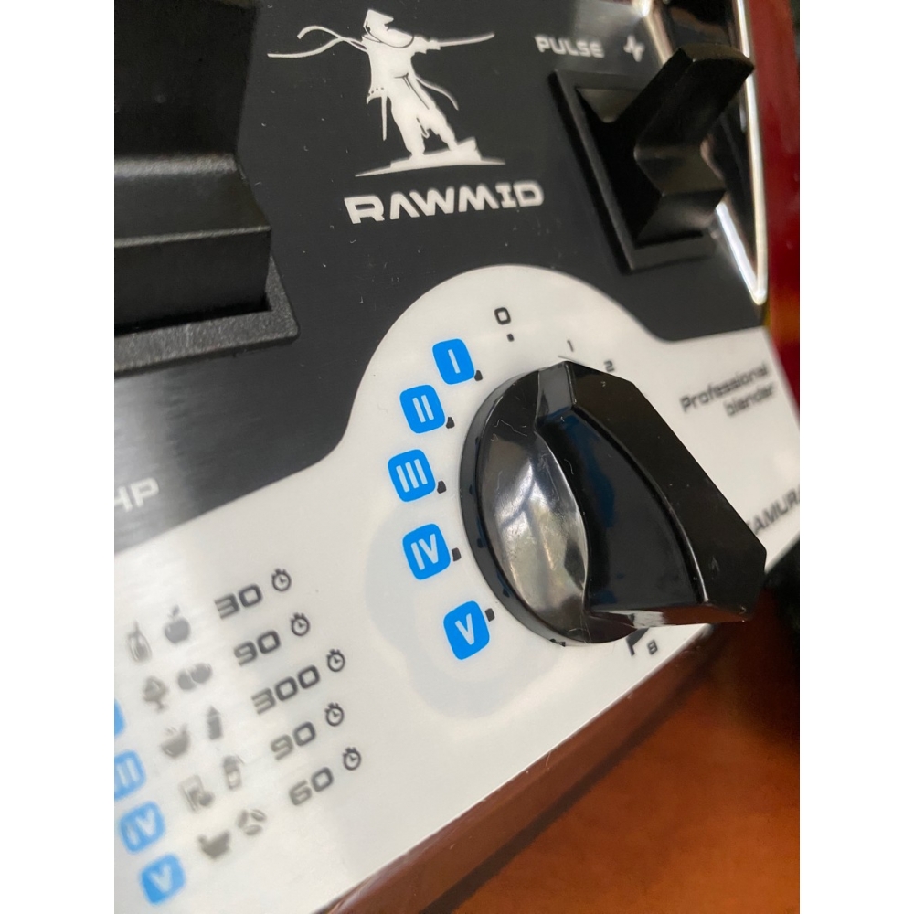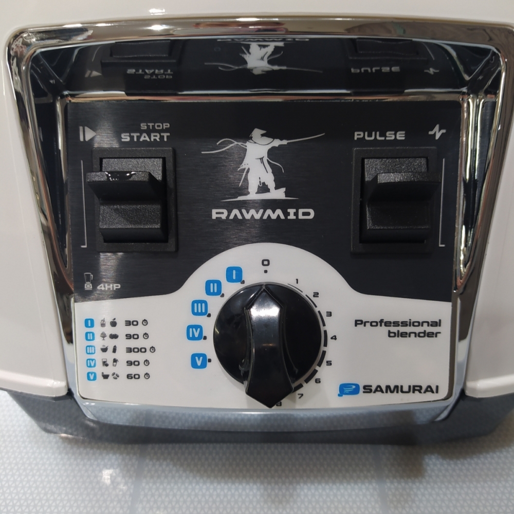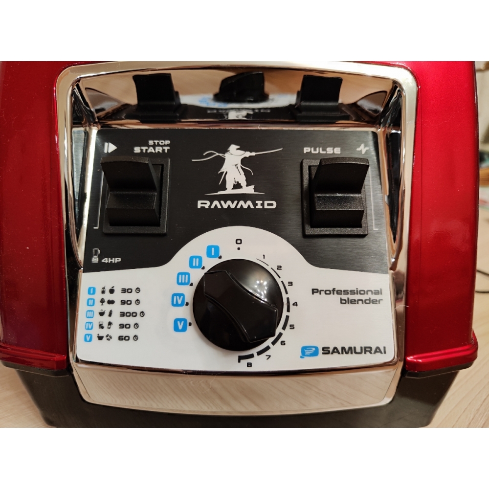 Dream Samurai оснащён 5 автоматическими режимами для приготовления различных блюд: 1) смузи и коктейли; 2) мороженое и орехи; 3) горячие супы; 4) ореховое молоко; 5) мука из сухих продуктов. Параметры этих режимов вырабатывались сотрудниками RAWMID так, чтобы они были максимально полезными и востребованными на практике. Выбрать нужный режим очень просто: достаточно повернуть переключатель влево в нужную позицию.