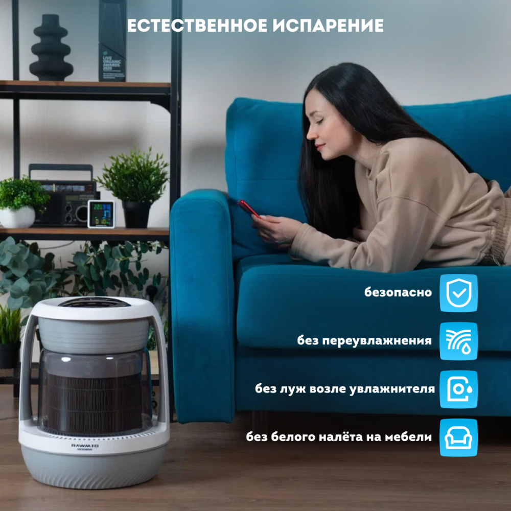 Также этот способ увлажнения — самый безопасный, так как в воздух попадает только чистый водяной пар, а в случае с ультразвуковыми увлажнителями в воздух попадает мелкая аэрозоль воды со всеми её примесями — металлами, солями и прочими веществами, которые могут быть потенциально опасными для здоровья.