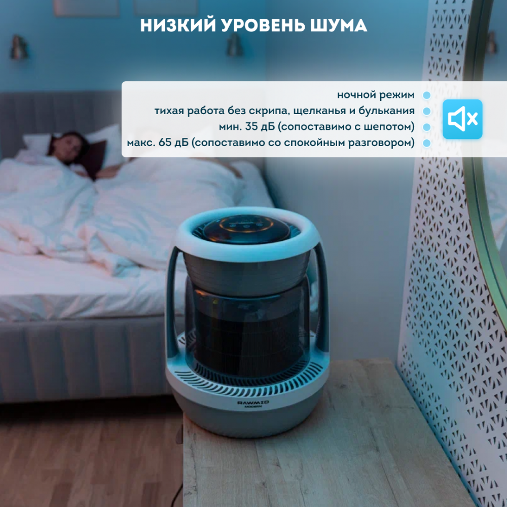 В увлажнителе RAWMID Modern предусмотрен ночной режим, в котором прибор практически бесшумный, а свет панели управления приглушён.