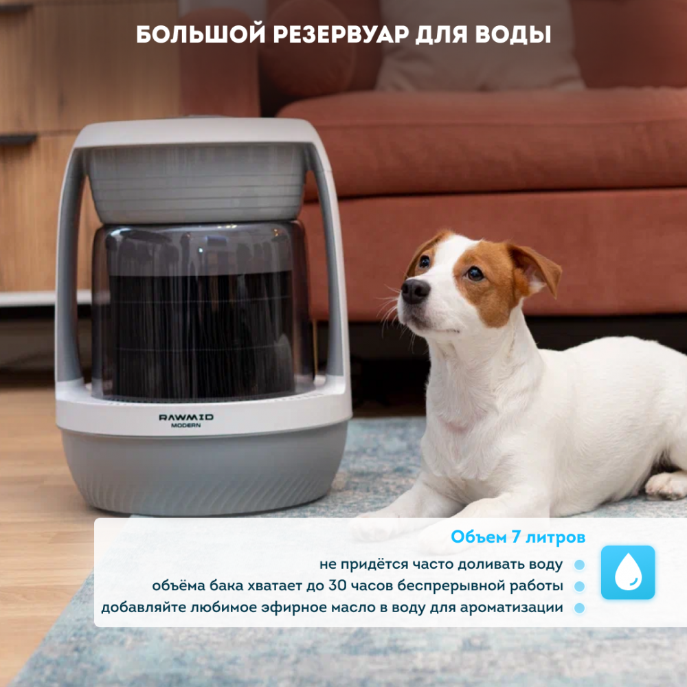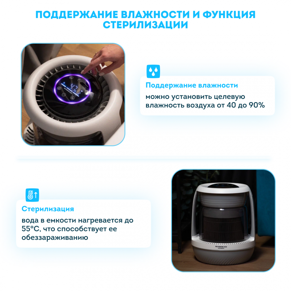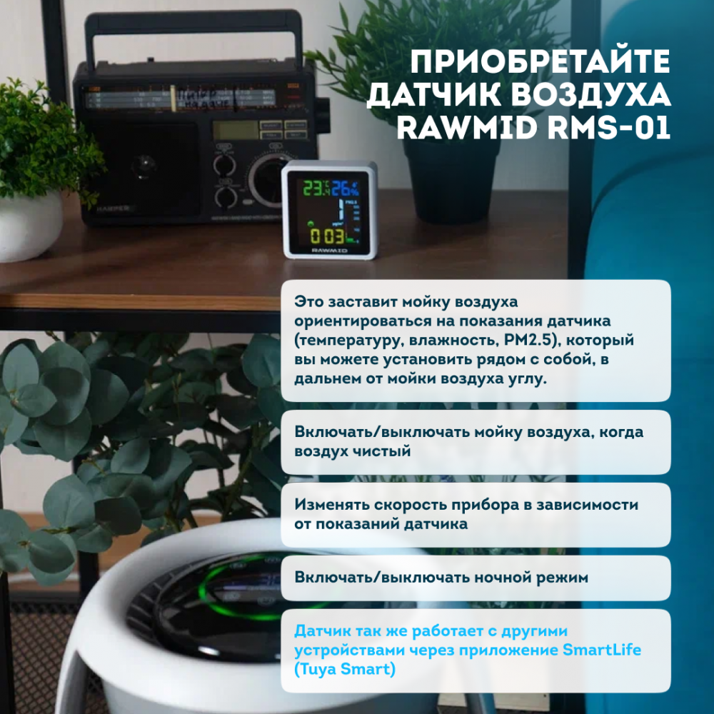 Совет: если прибор будет стоять вдали от вас, поставьте датчик воздуха RAWMID RMS-01 рядом с вами и подключите его к увлажнителю через приложение. Так увлажнитель будет поддерживать нужную влажность именно там, где вы находитесь.