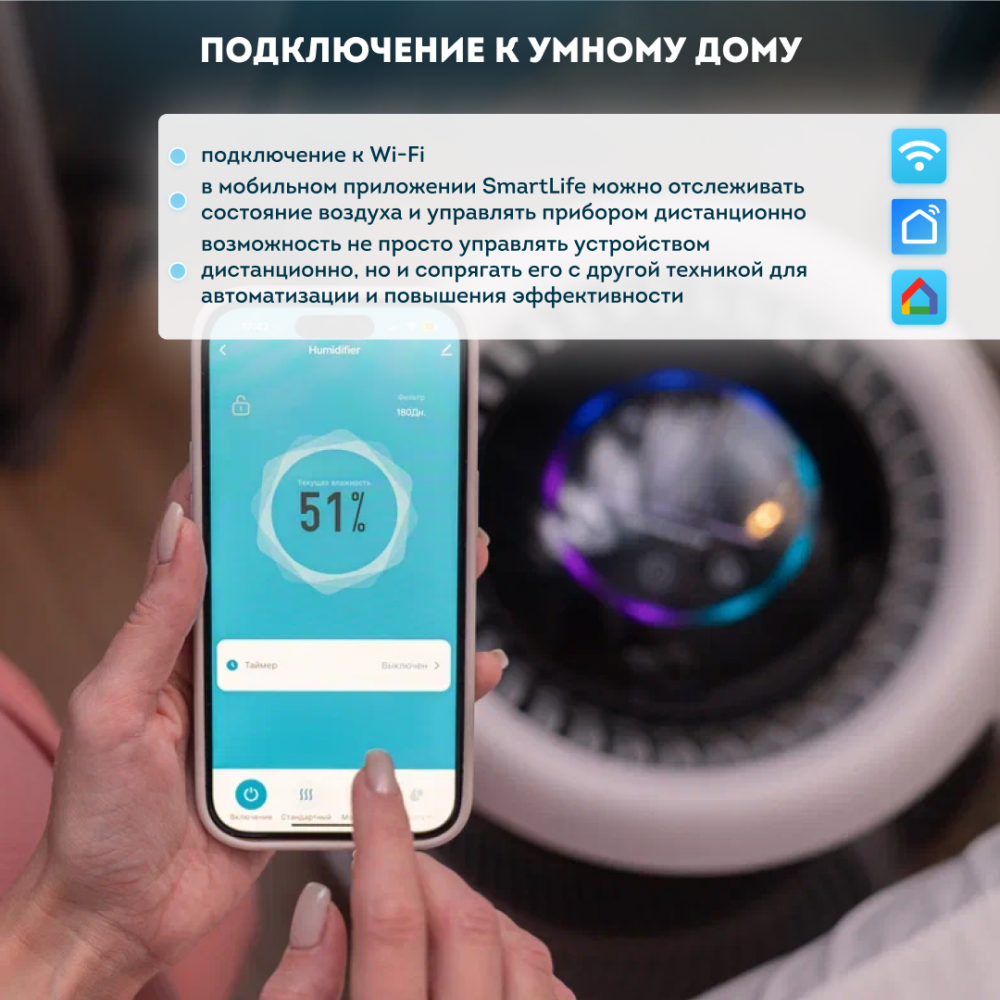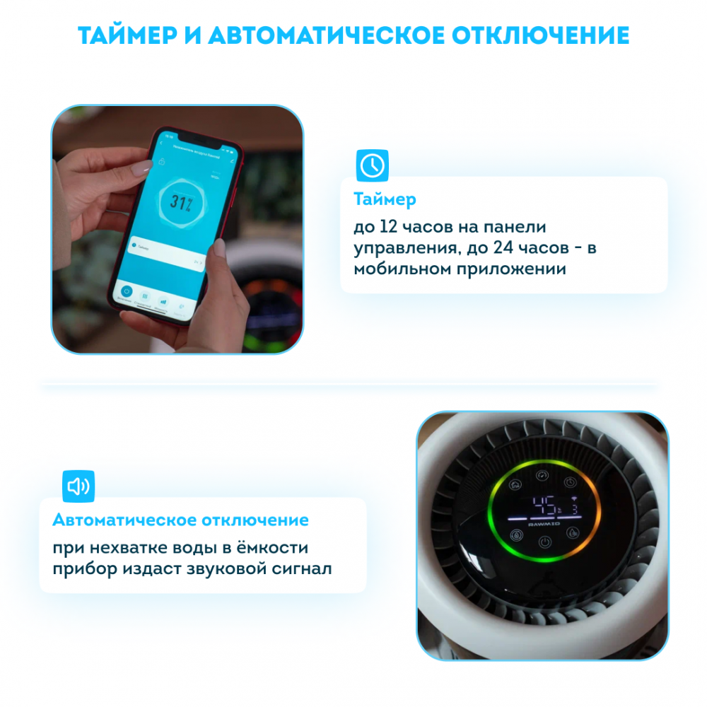 На панели управления или в приложении на смартфоне вы можете установить таймер выключения увлажнителя от 1 до 12 часов.
