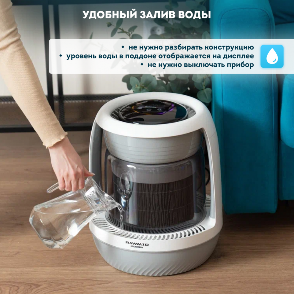 В мойке воздуха RAWMID Modern увлажнение основано на принципе естественного испарения воздуха — без переувлажнения, без луж возле увлажнителя, без белого налёта на мебели, без необходимости фильтровать воду, в отличие от ультразвуковых увлажнителей.