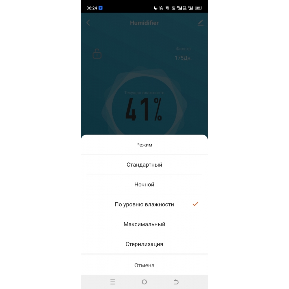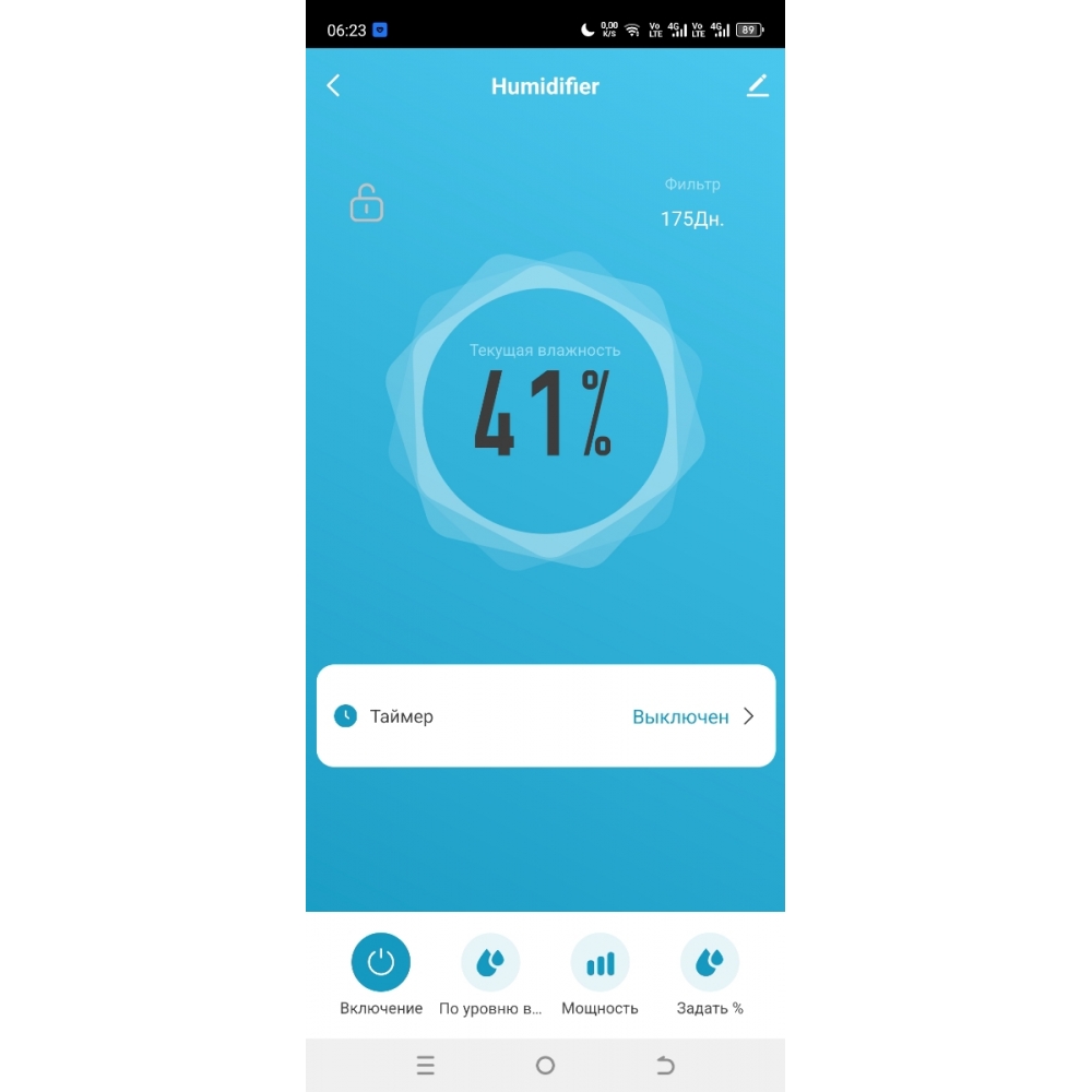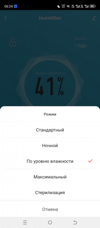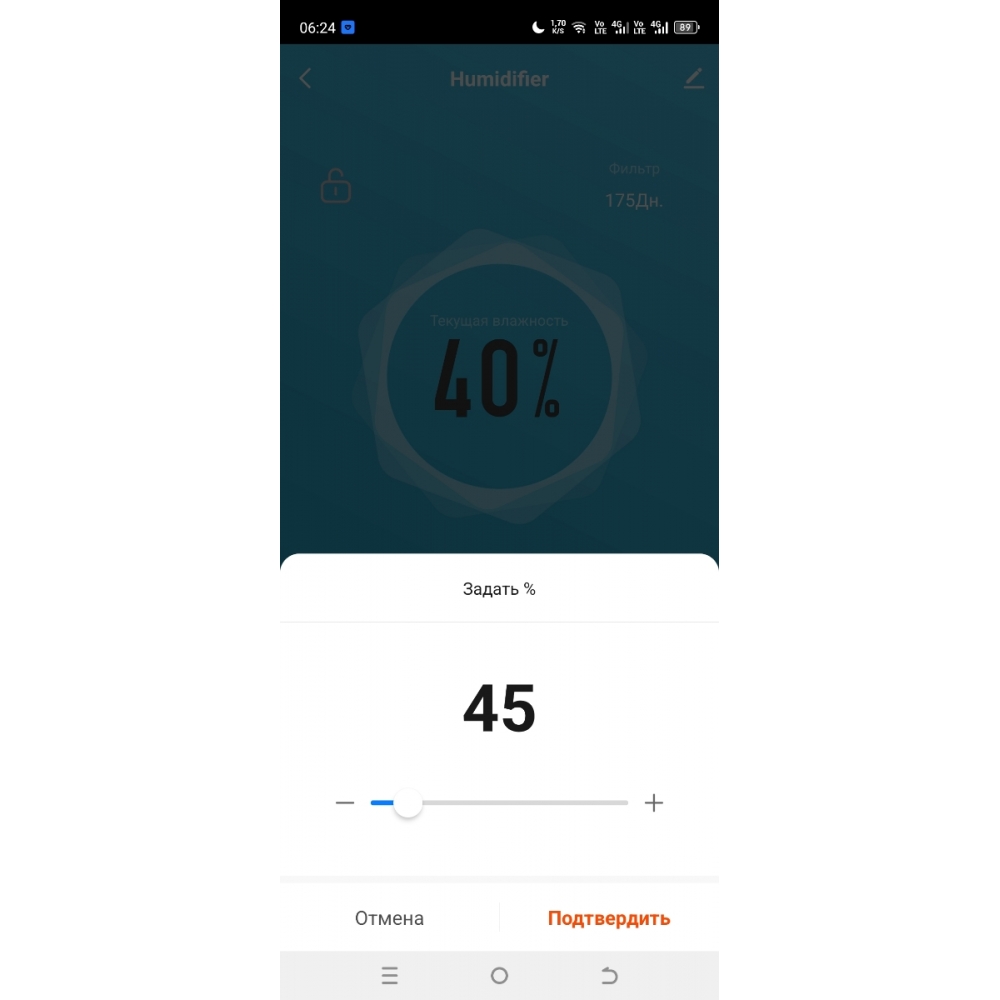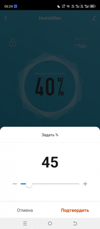 На панели управления устройства вы можете установить целевую влажность, которой хотите достичь в помещении. Доступны значения в диапазоне от 40 до 90% с интервалом 5%. После установки значения увлажнитель будет автоматически поддерживать влажность на заданном уровне.