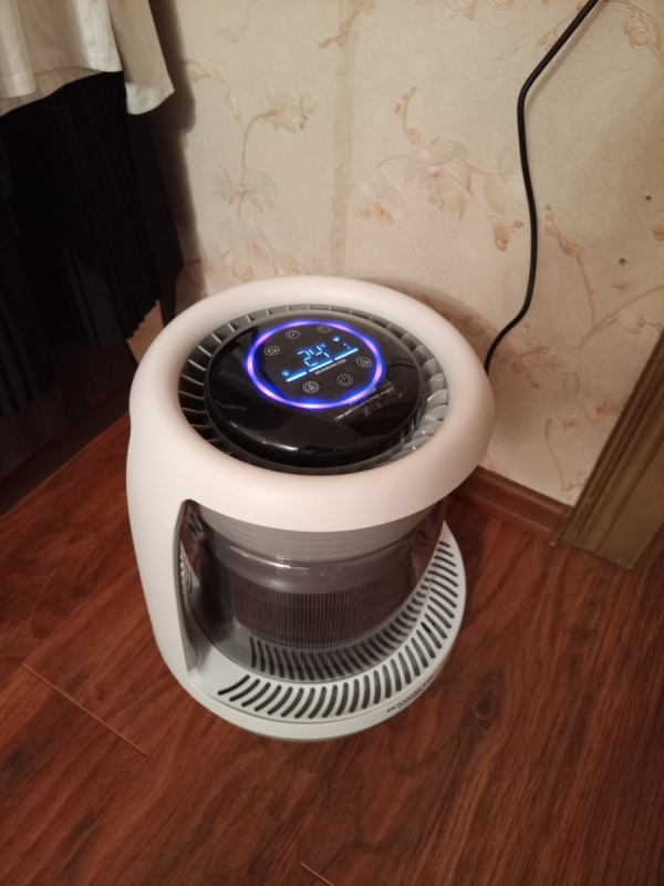 Круглая ровная сенсорная панель управления удобна в использовании и проста в уходе. Цветной индикатор показывает статус устройства, а на дисплее отображаются текущий режим работы, температура и влажность, а также уровень воды в поддоне.