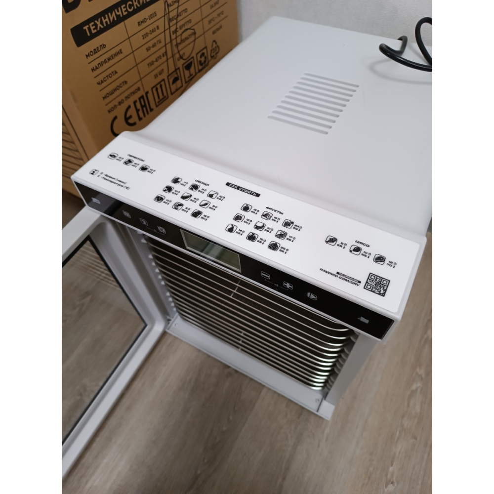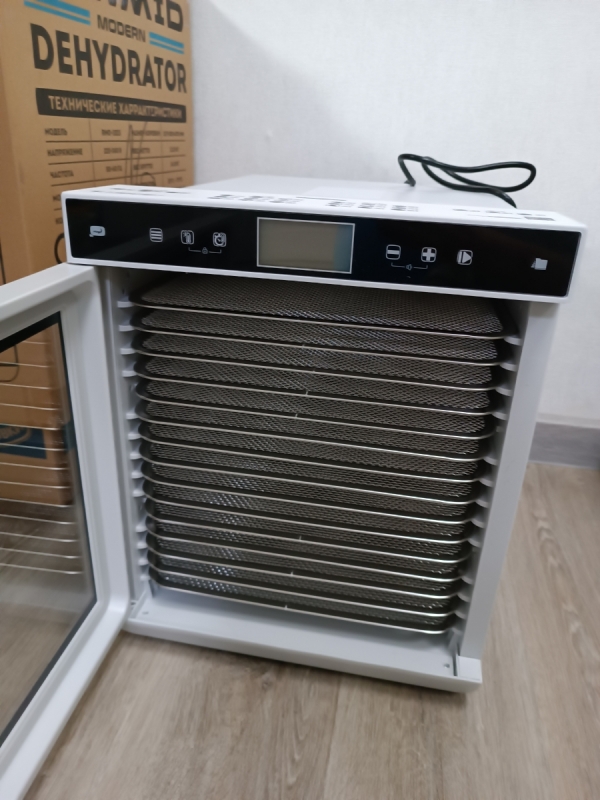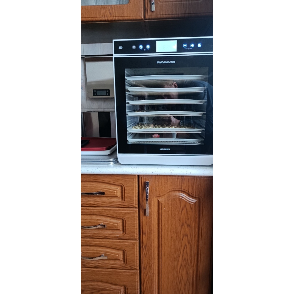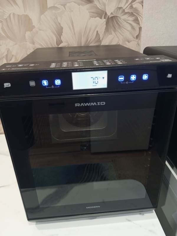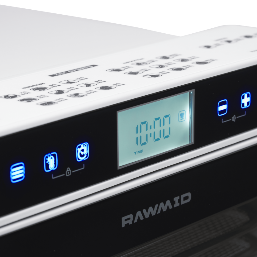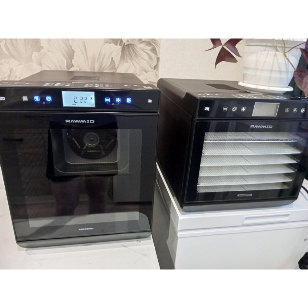 Дегидратор RAWMID Modern RMD-1015 оснащён 15 стальными лотками и 13 поддонами с бортиками для пастилы. Благодаря горизонтальному обдуву, продукты на всех лотках сушатся равномерно и их запахи не смешиваются между собой. Практичный дизайн позволяет сушить продукты любой формы и размера и удобно наблюдать за процессом сушки, а также не требует вмешательства для перестановки лотков.