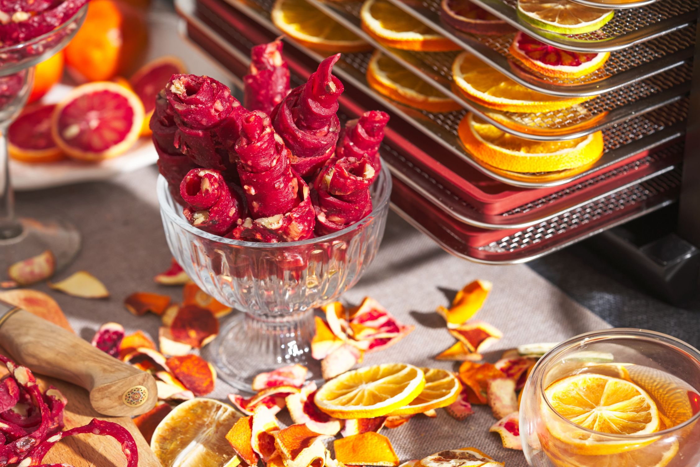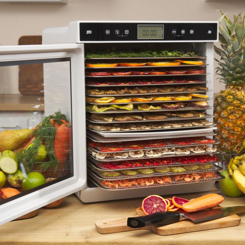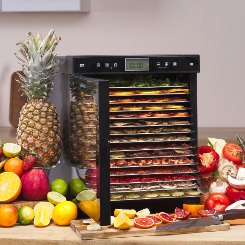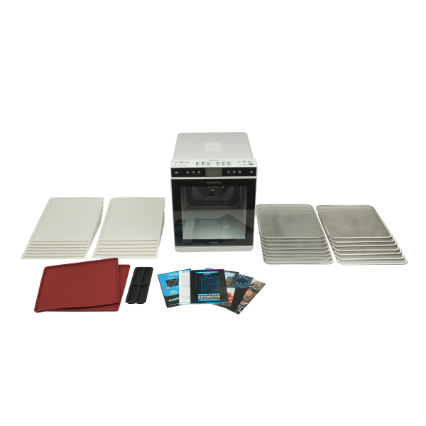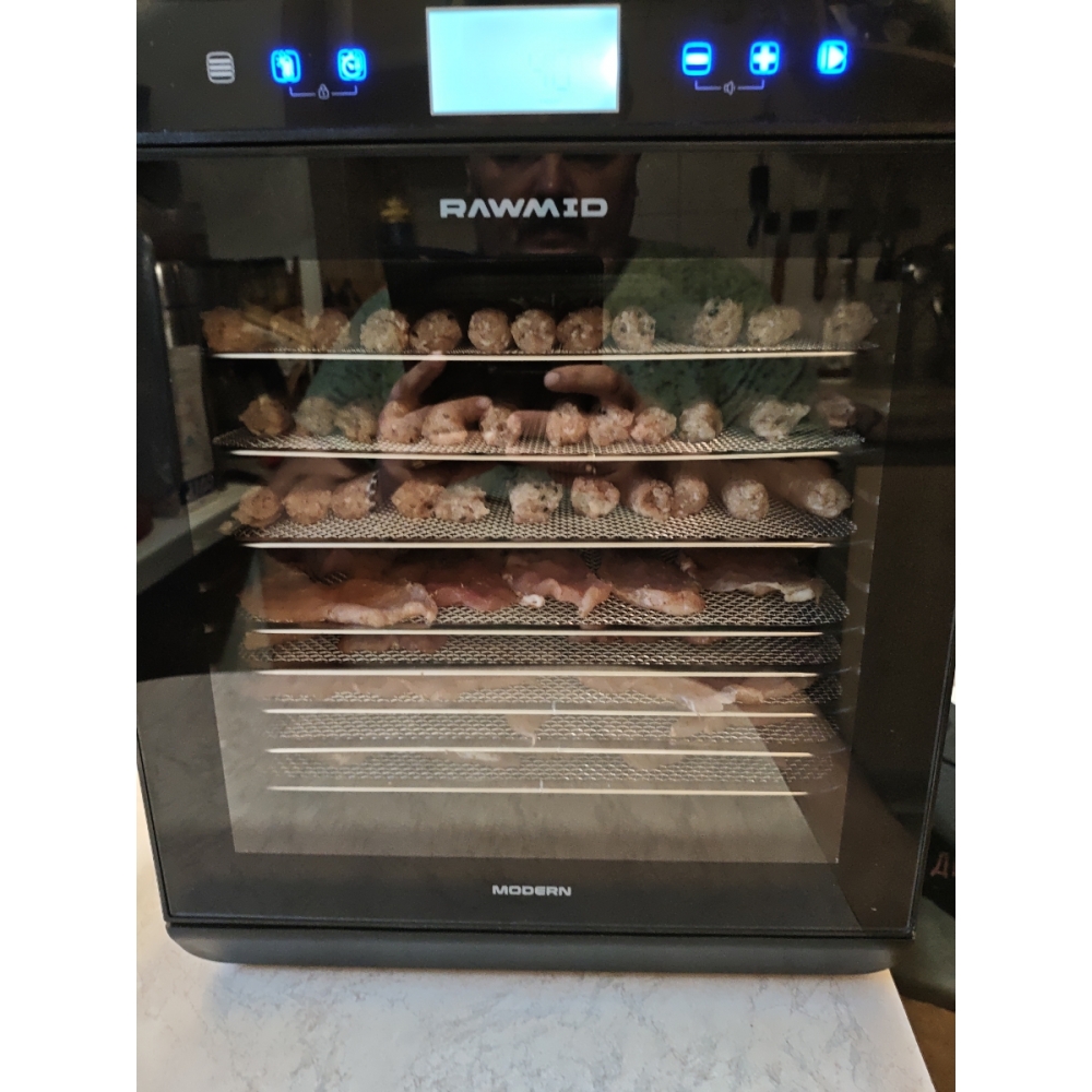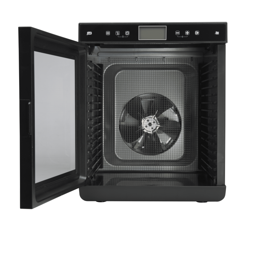 Дегидратор RAWMID Modern RMD-1015 оснащён 15 стальными лотками и 13 поддонами с бортиками для пастилы. Благодаря горизонтальному обдуву, продукты на всех лотках сушатся равномерно и их запахи не смешиваются между собой. Практичный дизайн позволяет сушить продукты любой формы и размера и удобно наблюдать за процессом сушки, а также не требует вмешательства для перестановки лотков.