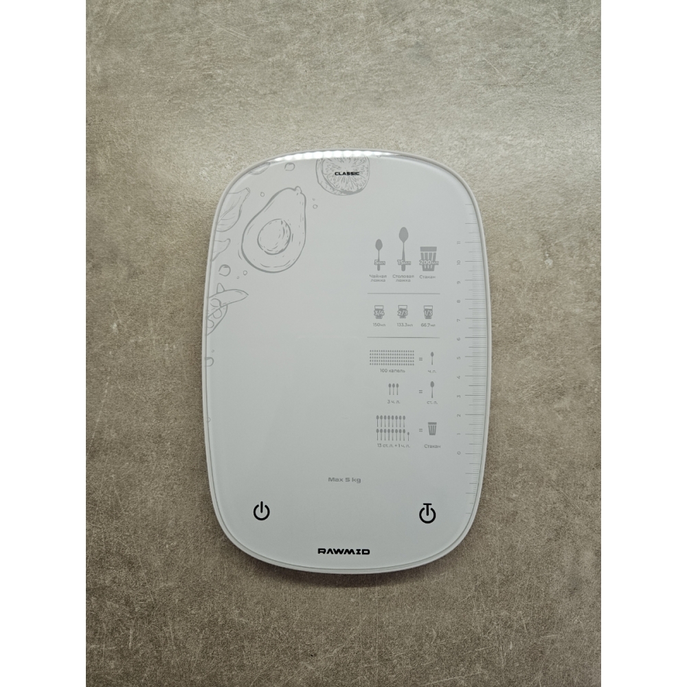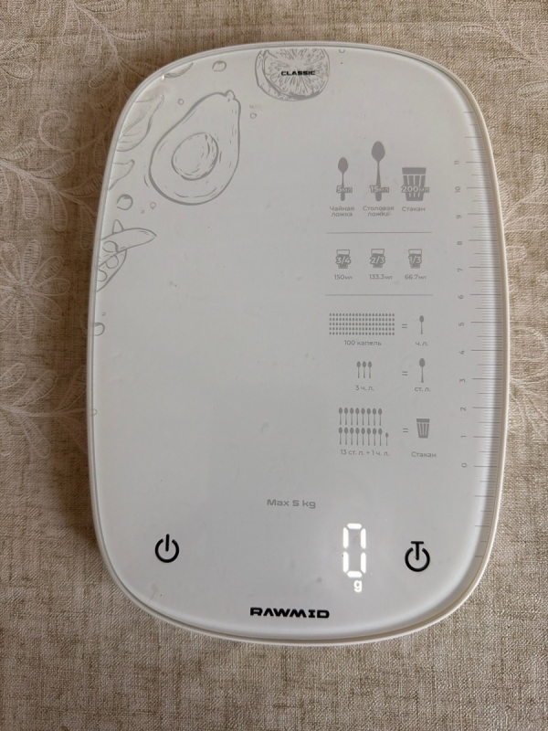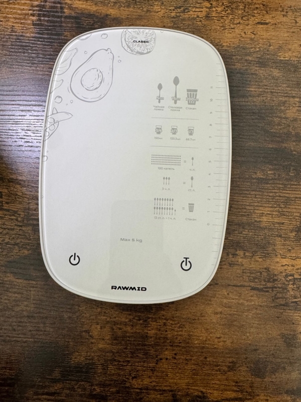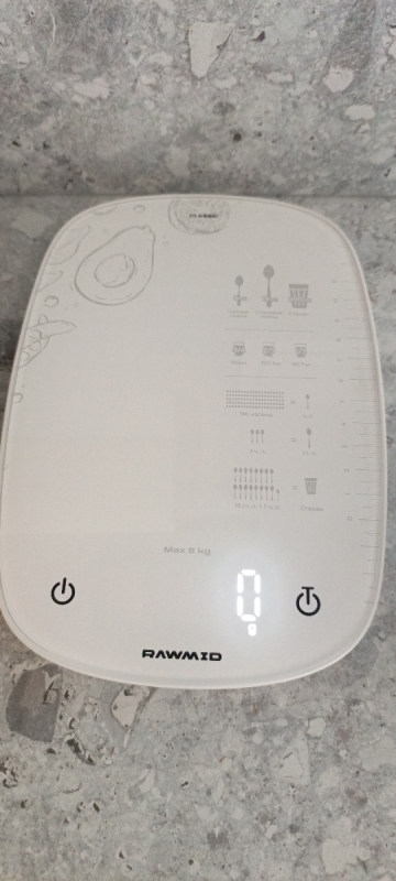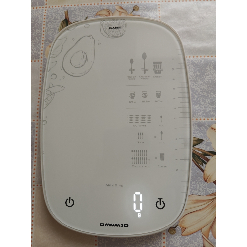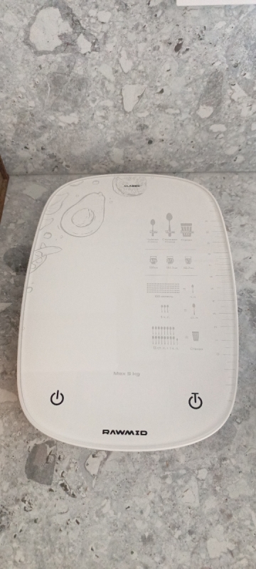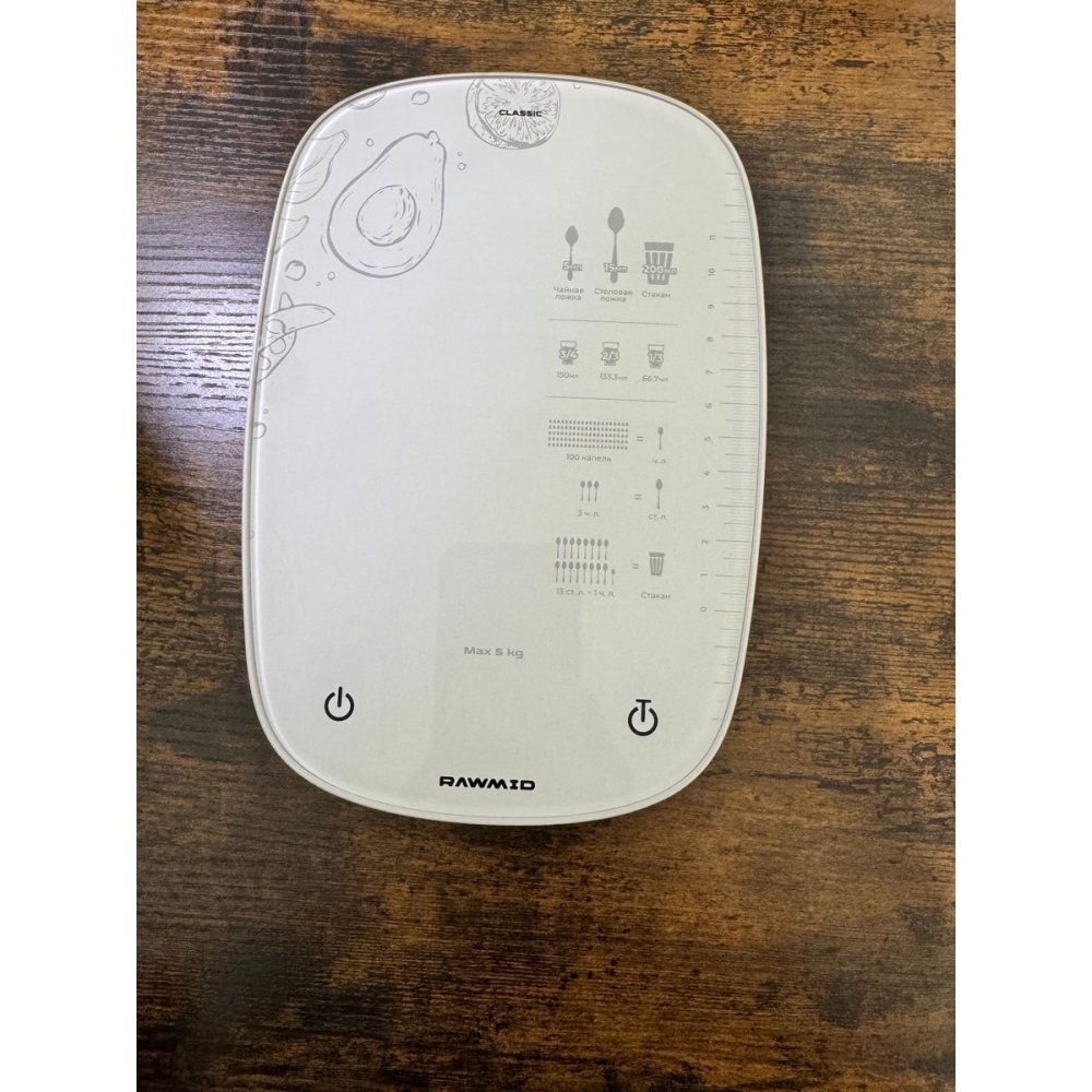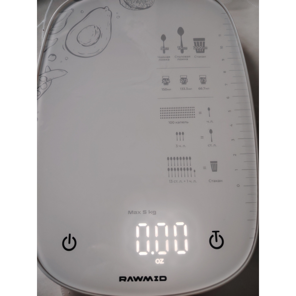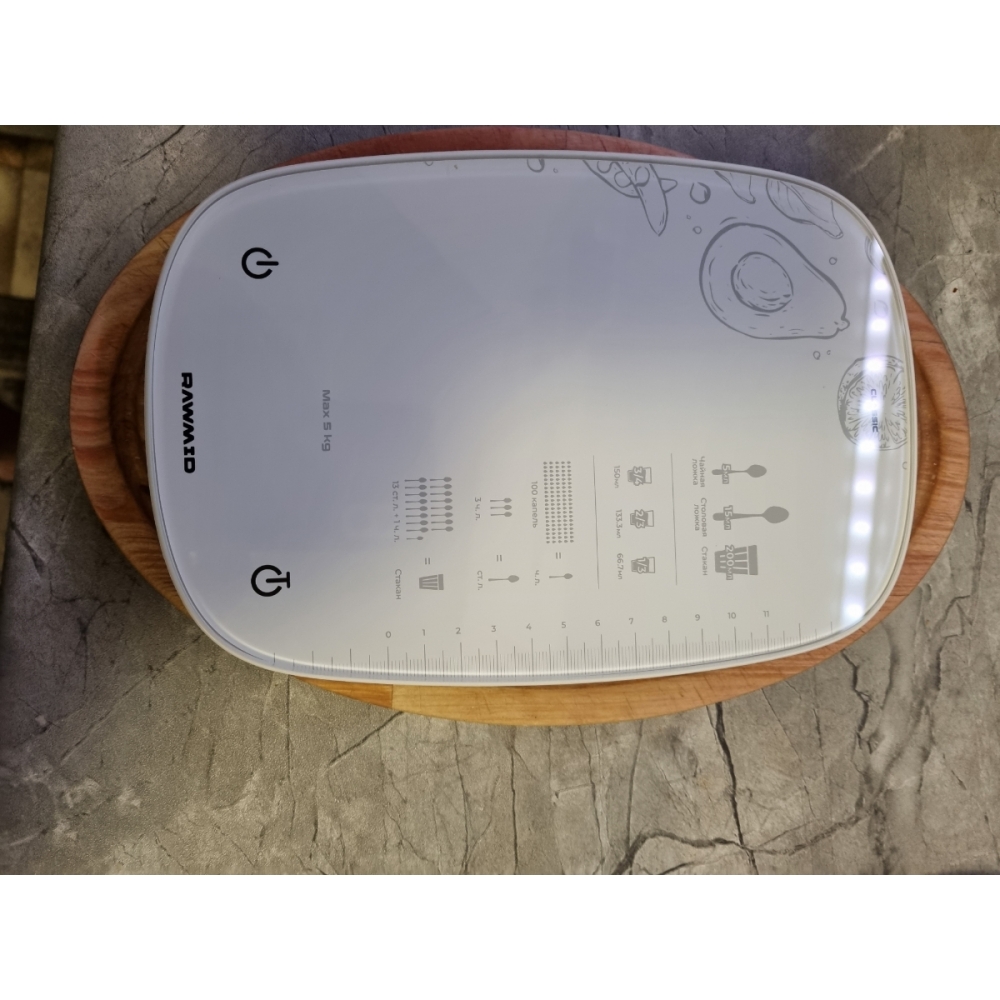 Кухонные весы RAWMID позволяют взвешивать продукты массой до 5 кг, а высокоточные датчики обеспечивают точность измерений до 1 г.