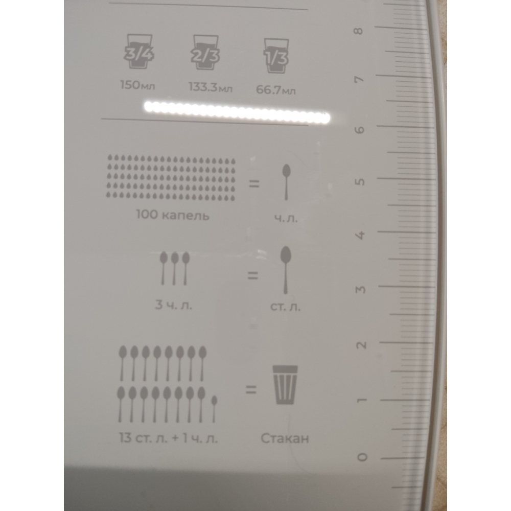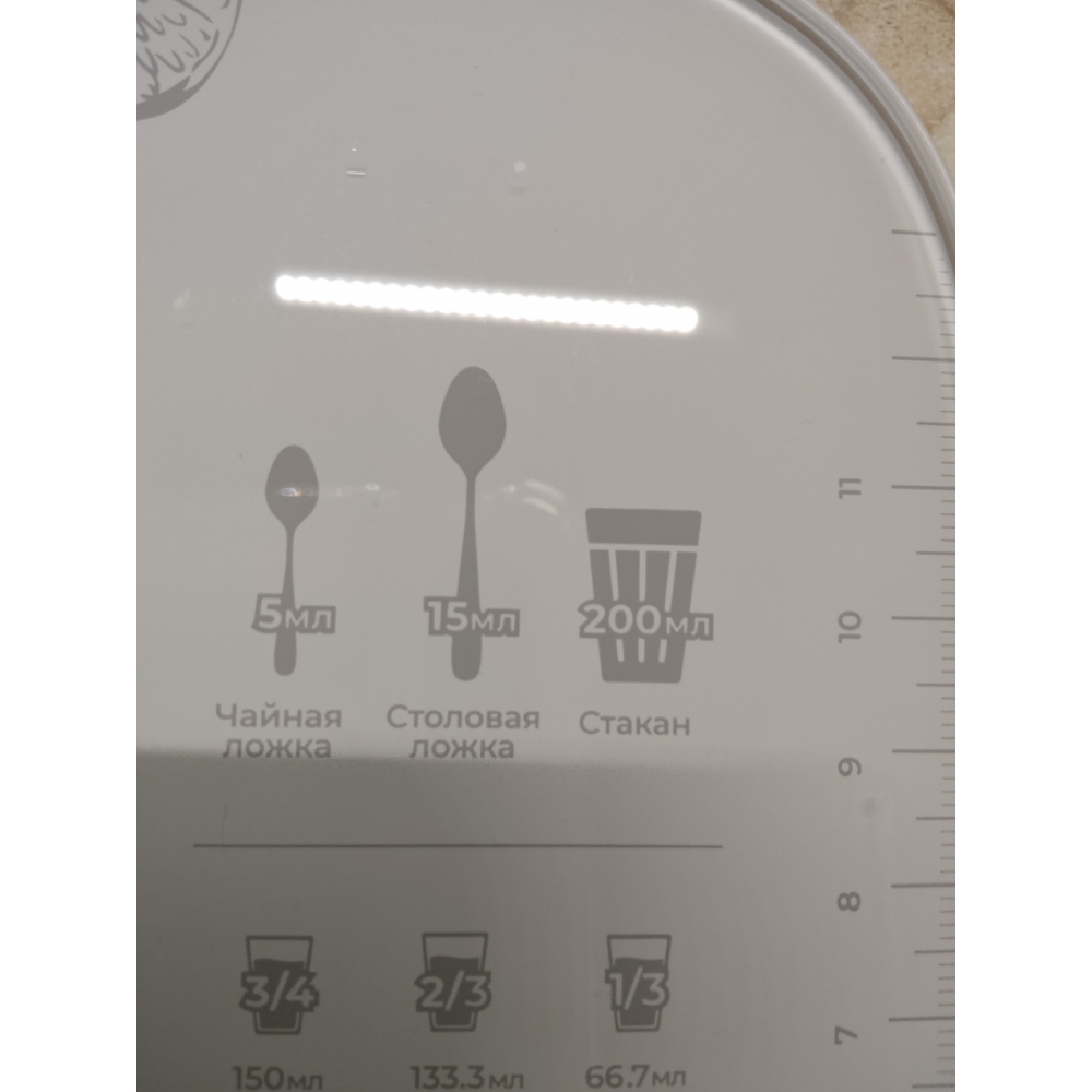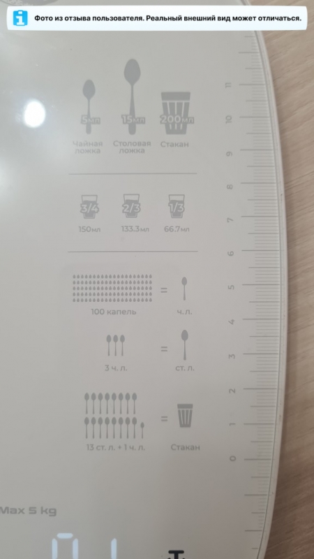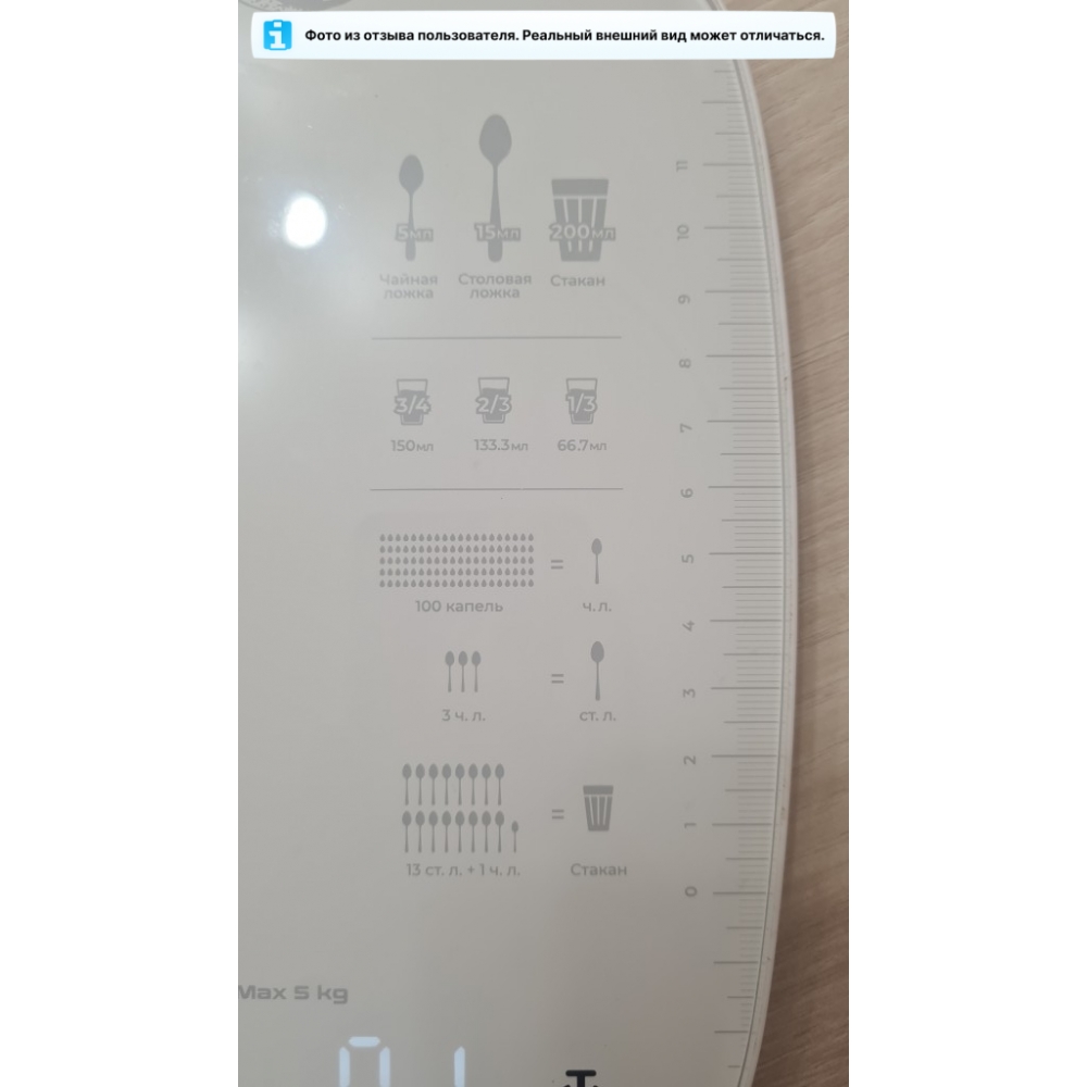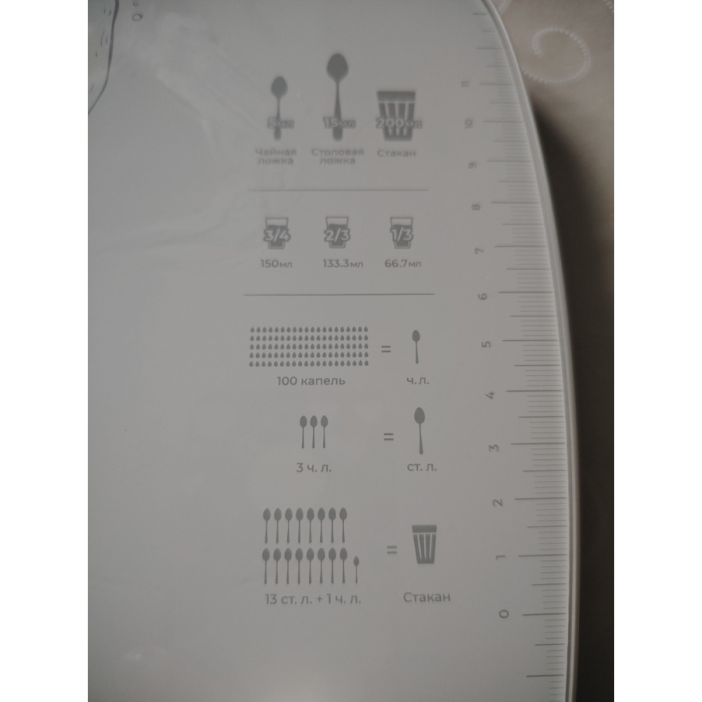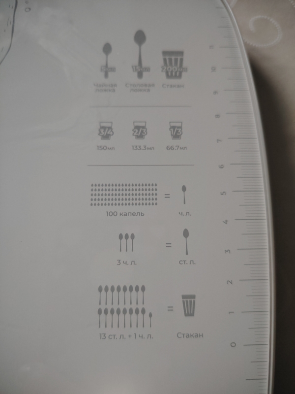 На платформе весов размещена полезная инфографика по кулинарным единицам измерения, а также линейка, позволяющая быстро разделить продукт на равные части прямо на платформе весов.