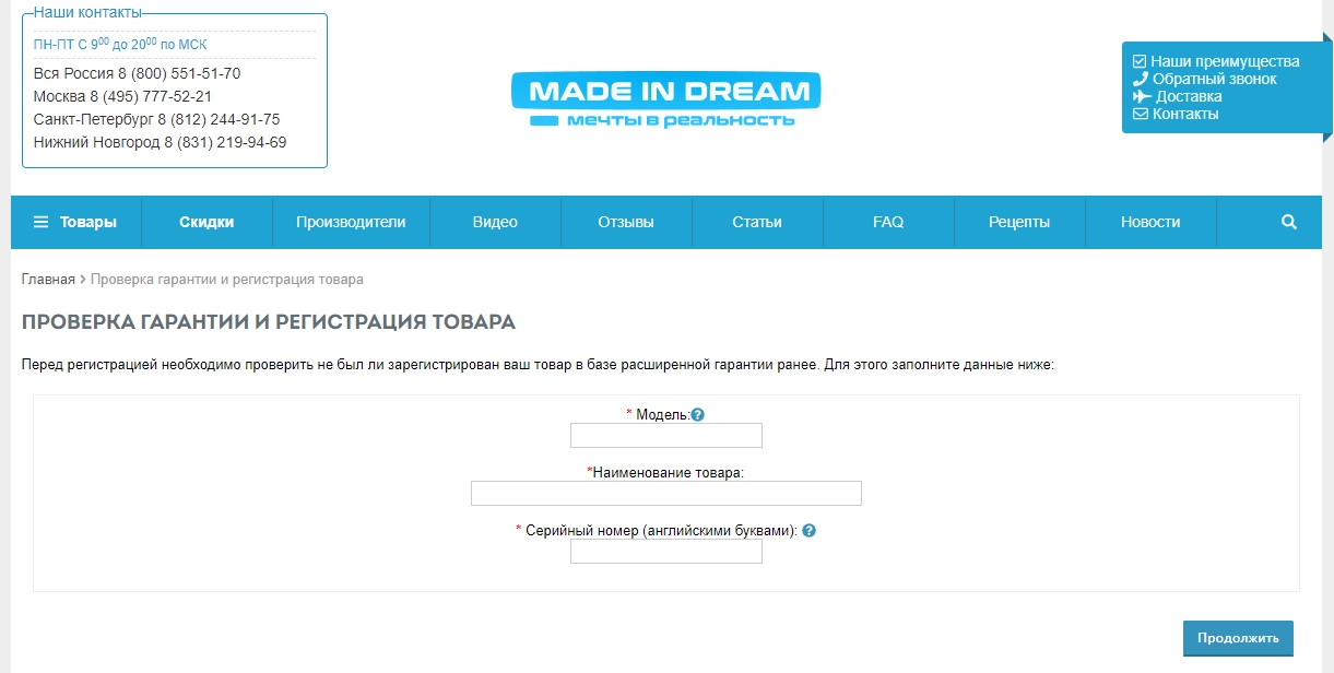 Примечание к видео: теперь при переходе по ссылке «Регистрация товара», расположенной внизу сайта madeindream.com, открывается страница выбора действия: вы можете перейти к регистрации нового товара или проверить гарантию на конкретный товар.