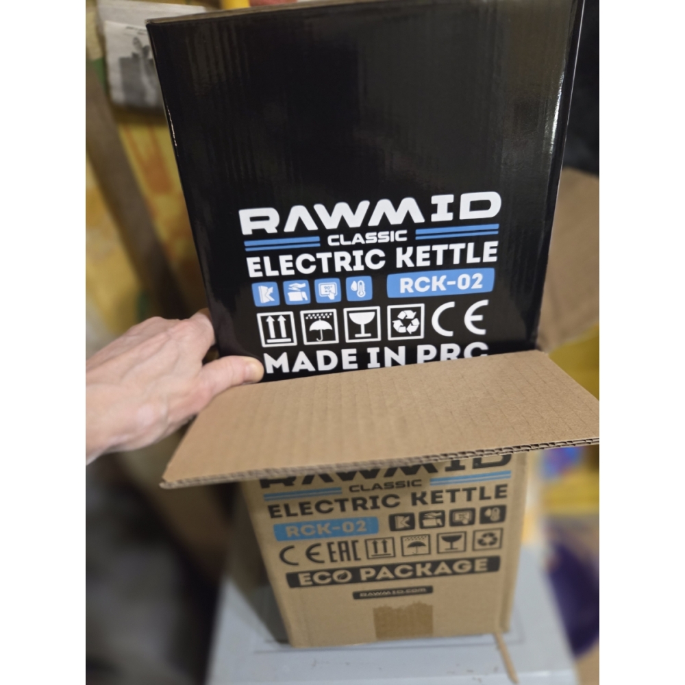 Чайник RAWMID упакован в двойную коробку. Внутренняя — подарочная, с красивым фирменным дизайном. Внешняя — обеспечивает дополнительную защиту во время перевозки.