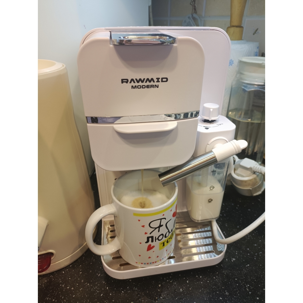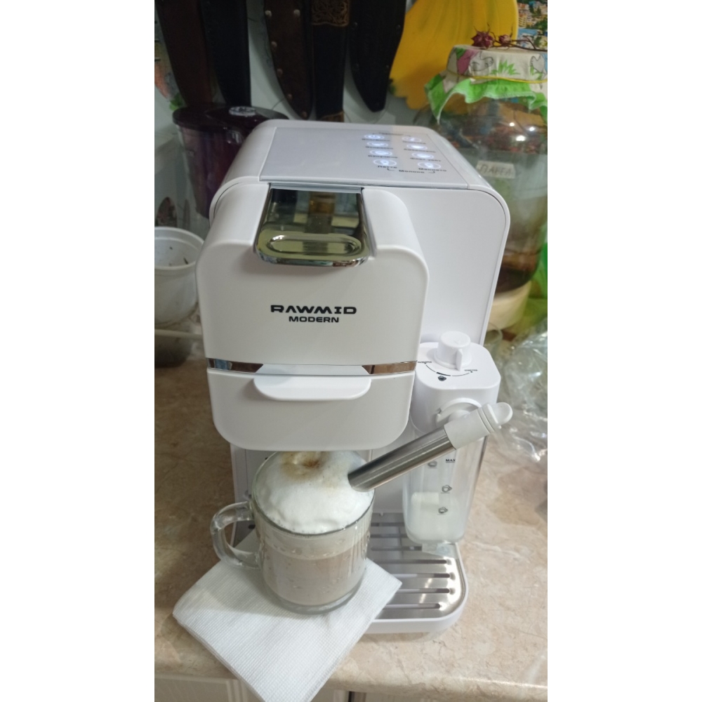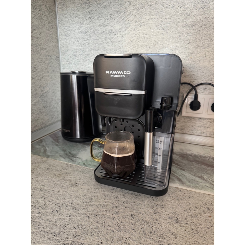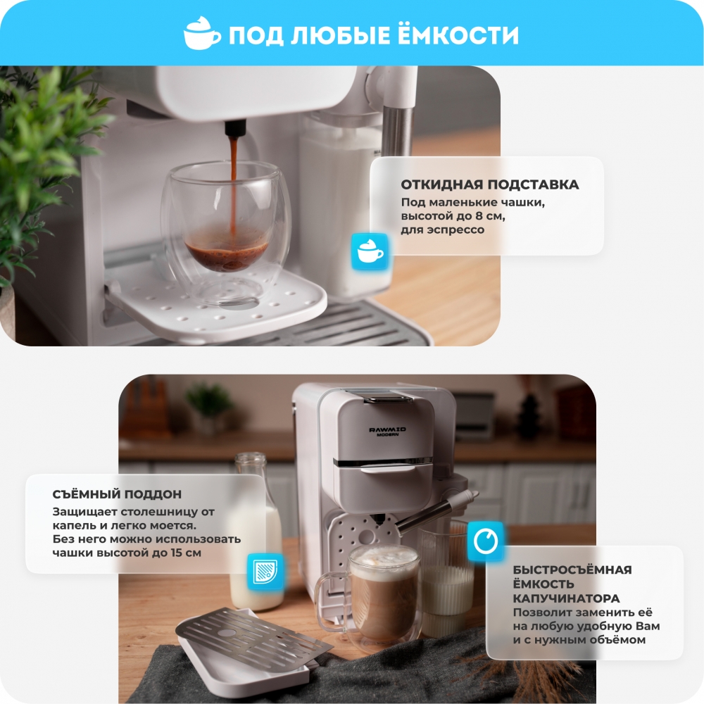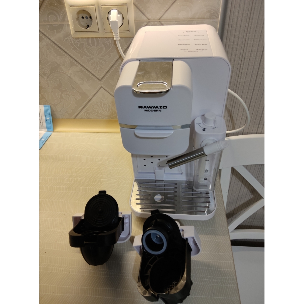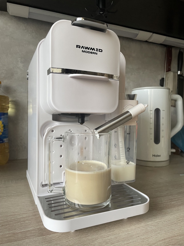 Кофемашину RAWMID легко содержать в чистоте благодаря не только функции самоочистки, но и продуманной конструкции прибора. Поддон для капель защищает стол от возможных проливов напитков, а после использования его можно легко снять и очистить. Капучинатор после использования также легко разбирается и промывается, а ещё его можно промыть, если залить в ёмкость для молока воду и пропустить пару раз.
