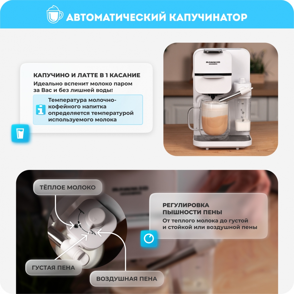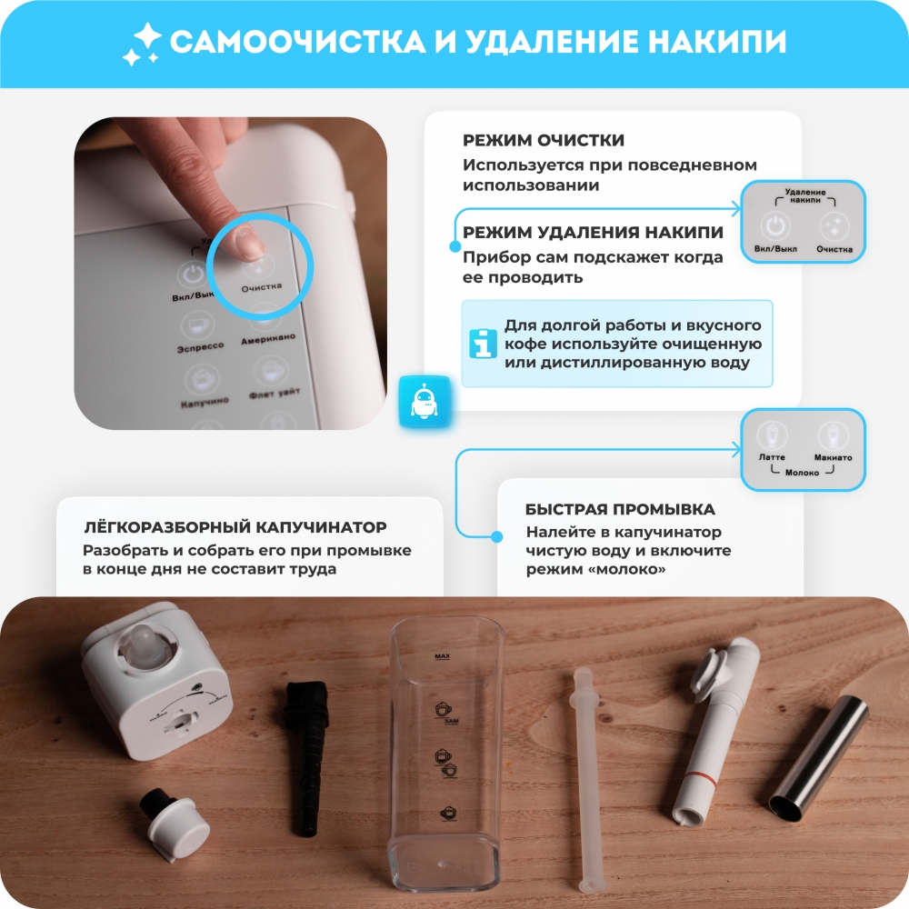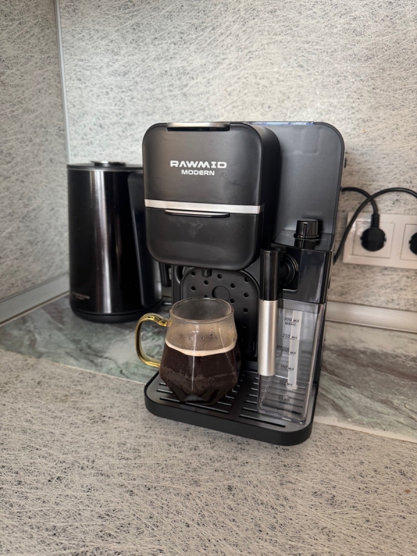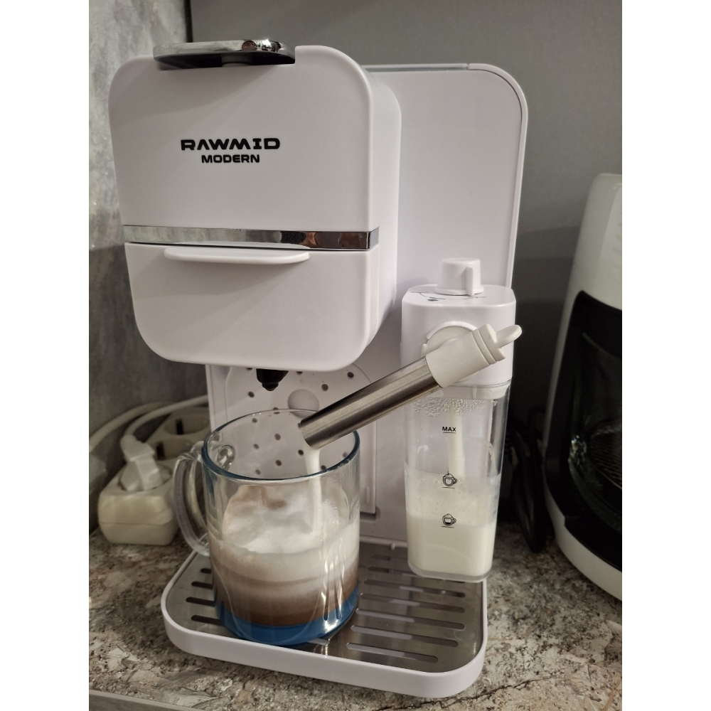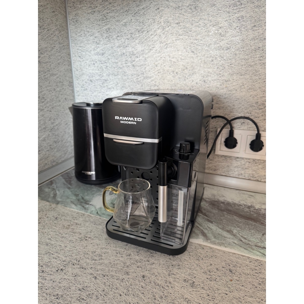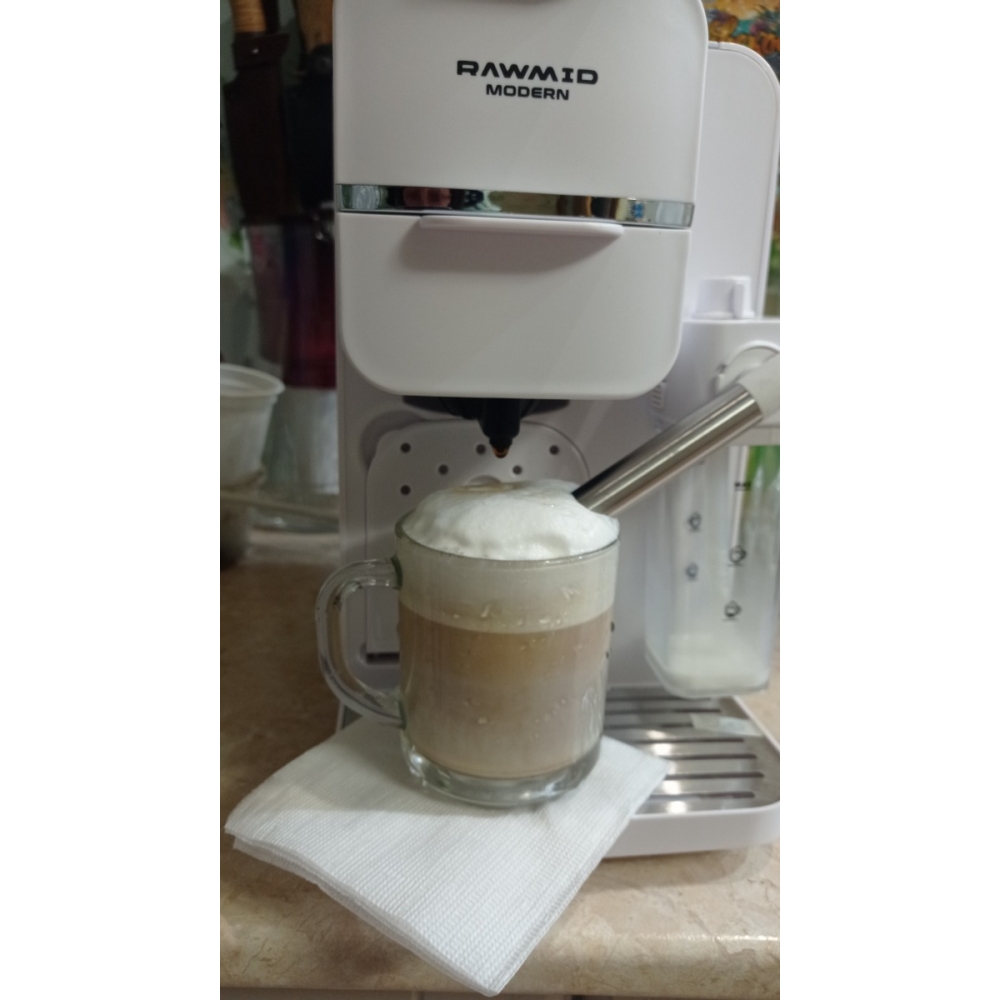 Кофемашину RAWMID легко содержать в чистоте благодаря не только функции самоочистки, но и продуманной конструкции прибора. Поддон для капель защищает стол от возможных проливов напитков, а после использования его можно легко снять и очистить. Капучинатор после использования также легко разбирается и промывается, а ещё его можно промыть, если залить в ёмкость для молока воду и пропустить пару раз.