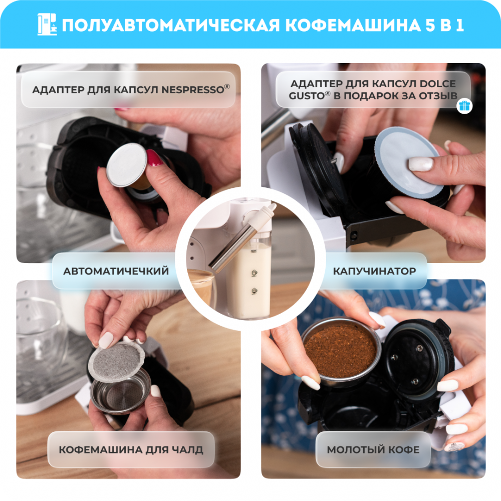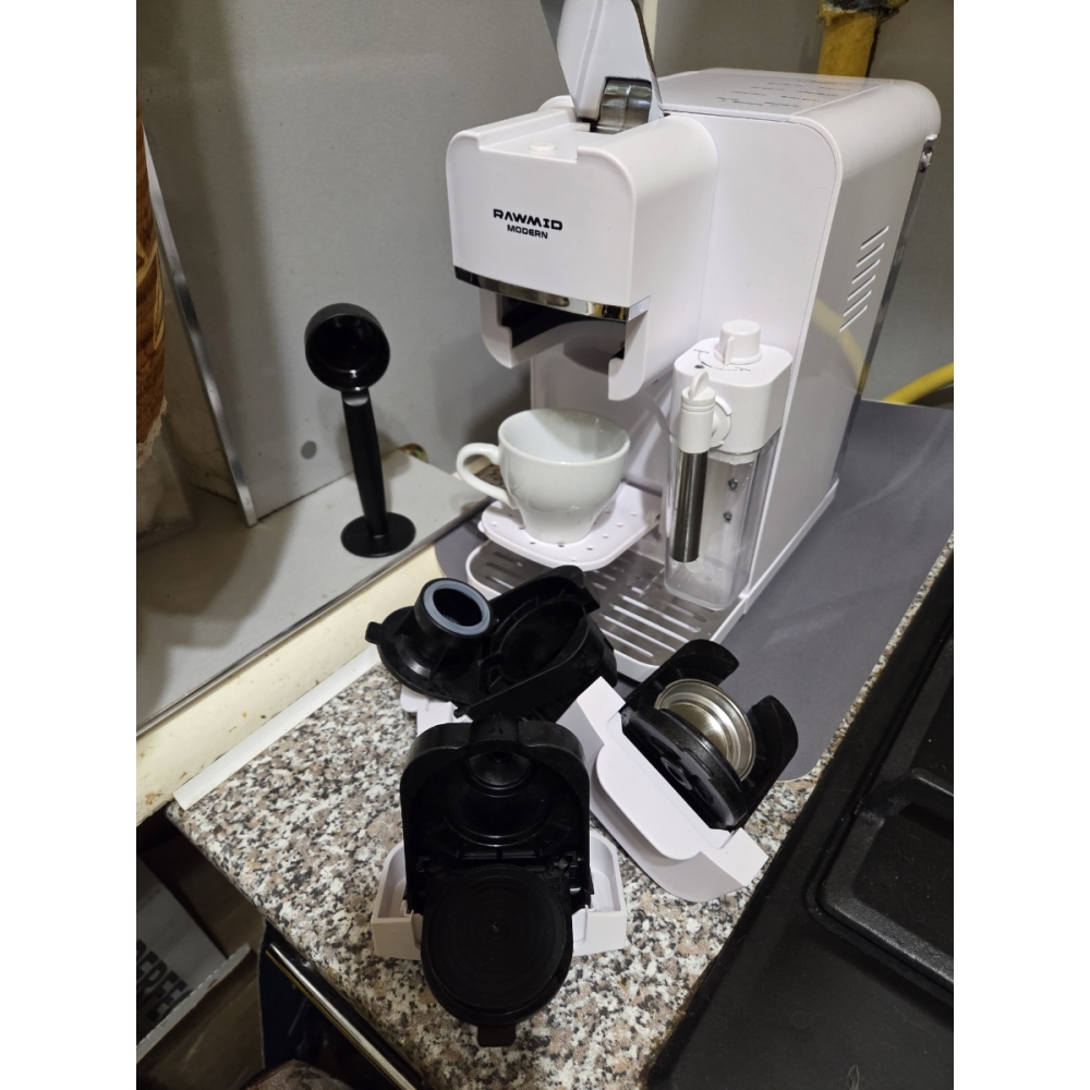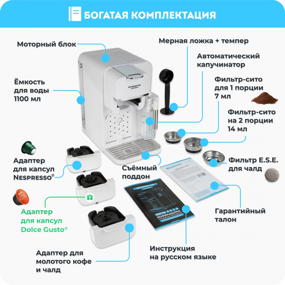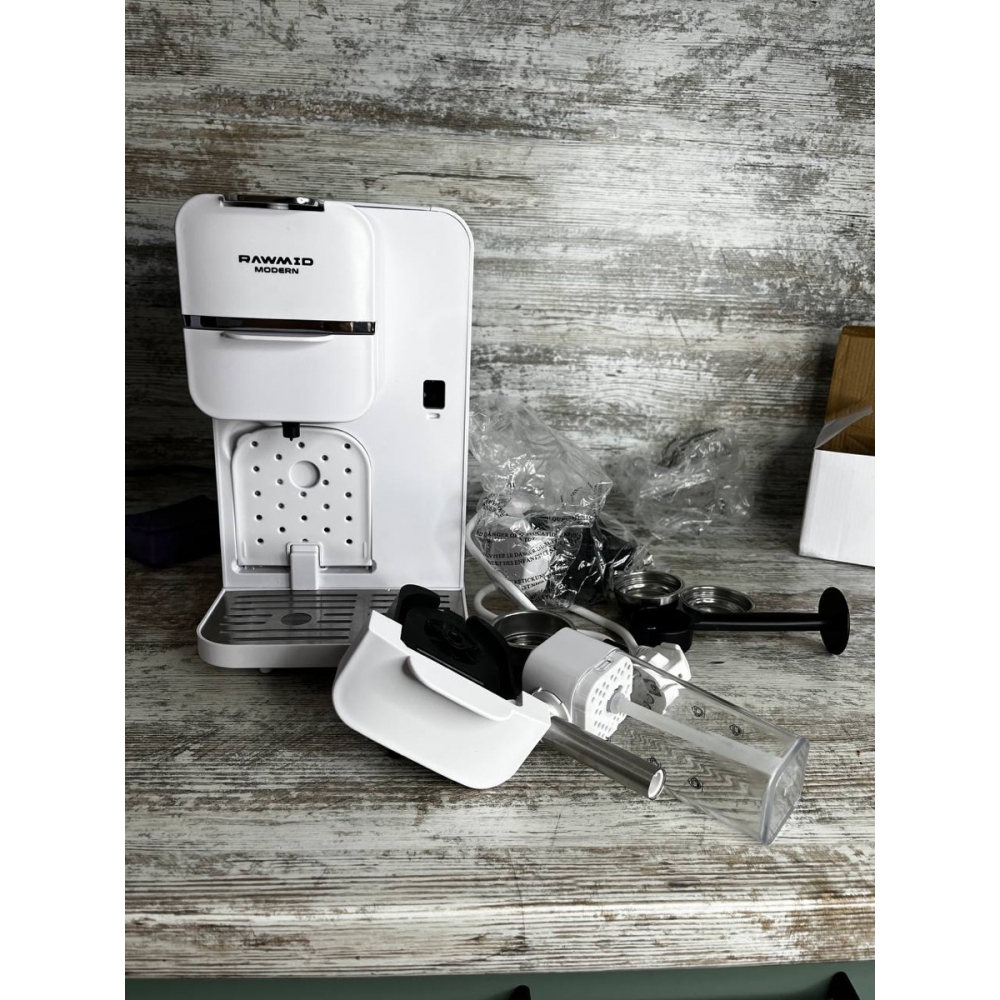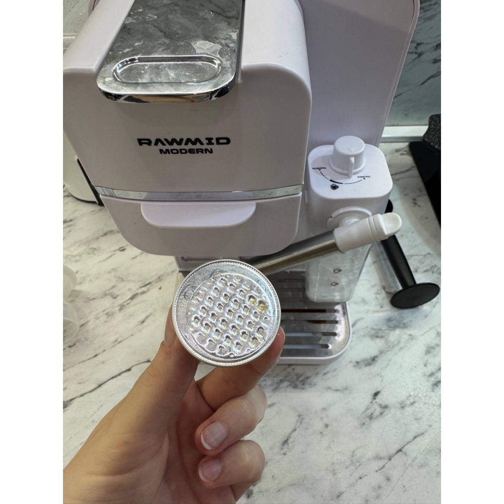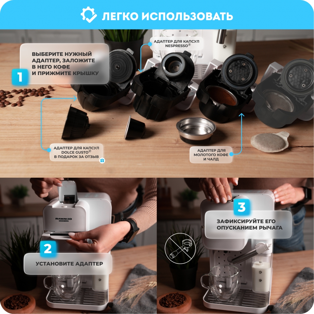 Благодаря специальным адаптерам и набору портафильтров, кофемашину RAWMID можно использовать как рожковую кофеварку для молотого кофе (обычной и двойной порции), как капсульную кофемашину для капсул Nespresso и Dolce Gusto, а также как кофемашину для чалд.