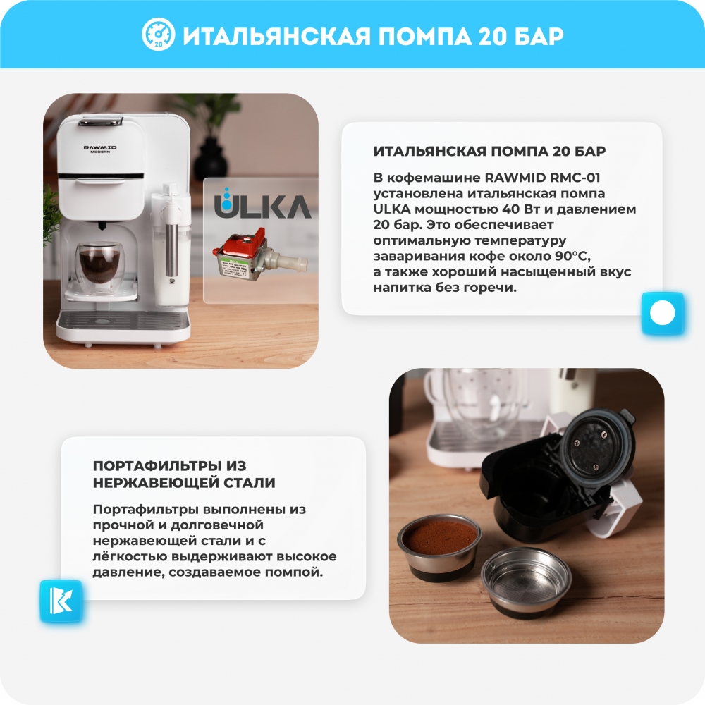 В кофемашине RAWMID RMC-01 установлена итальянская помпа ULKA мощностью 40 Вт и давлением 20 бар. Это обеспечивает оптимальную температуру заваривания кофе около 90°С, а также хороший насыщенный вкус напитка без горечи.