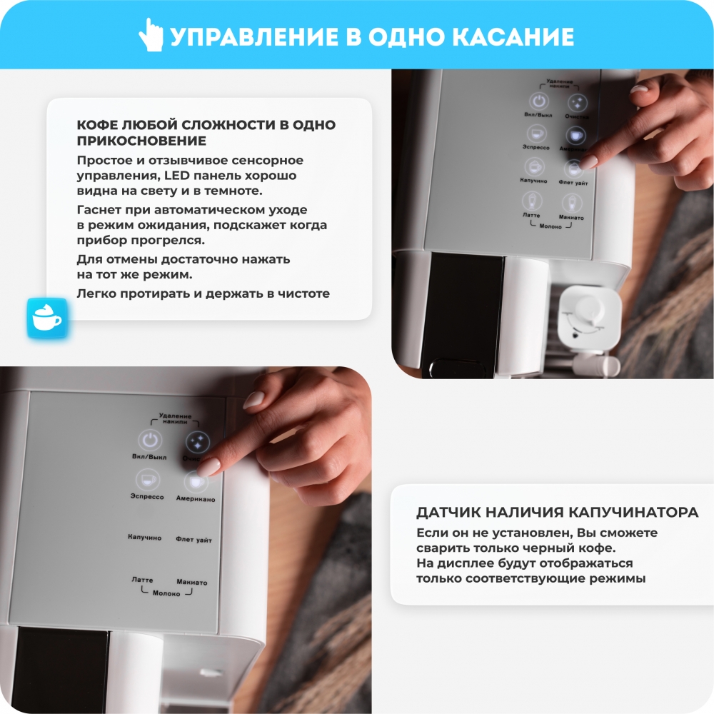 Для приготовления желаемого напитка достаточно нажать соответствующую кнопку — прибор автоматически приготовит кофе, даже если это капучино или латте с молоком и пеной.