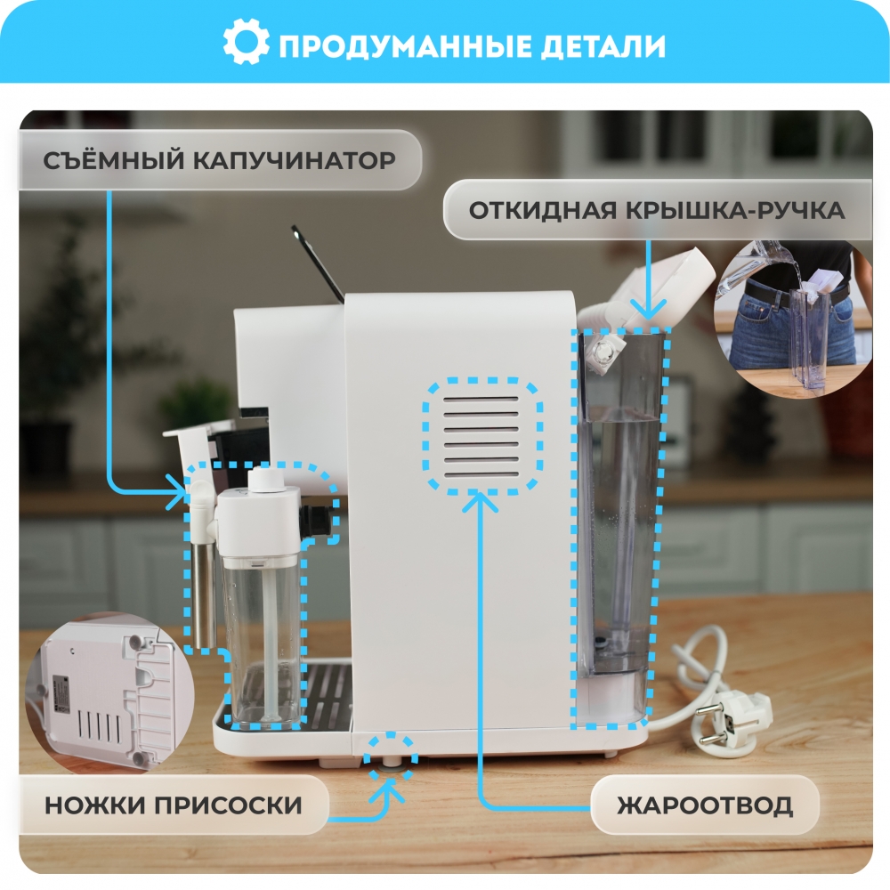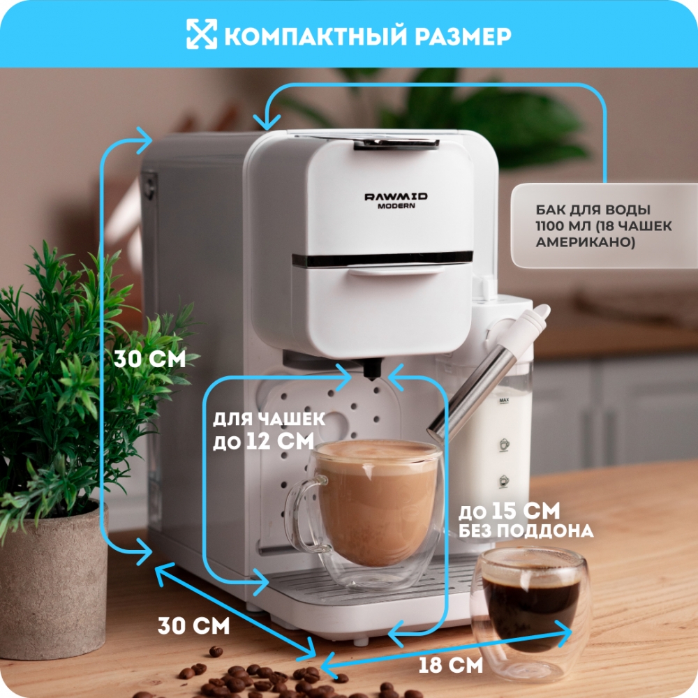 Размер кофемашины составляет всего 30×30×18 см, что позволяет с лёгкостью разместить её даже на небольшой кухне. А благодаря современному стильному дизайну, прибор прекрасно впишется в любой интерьер.