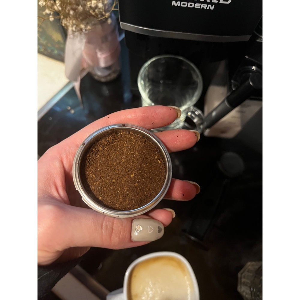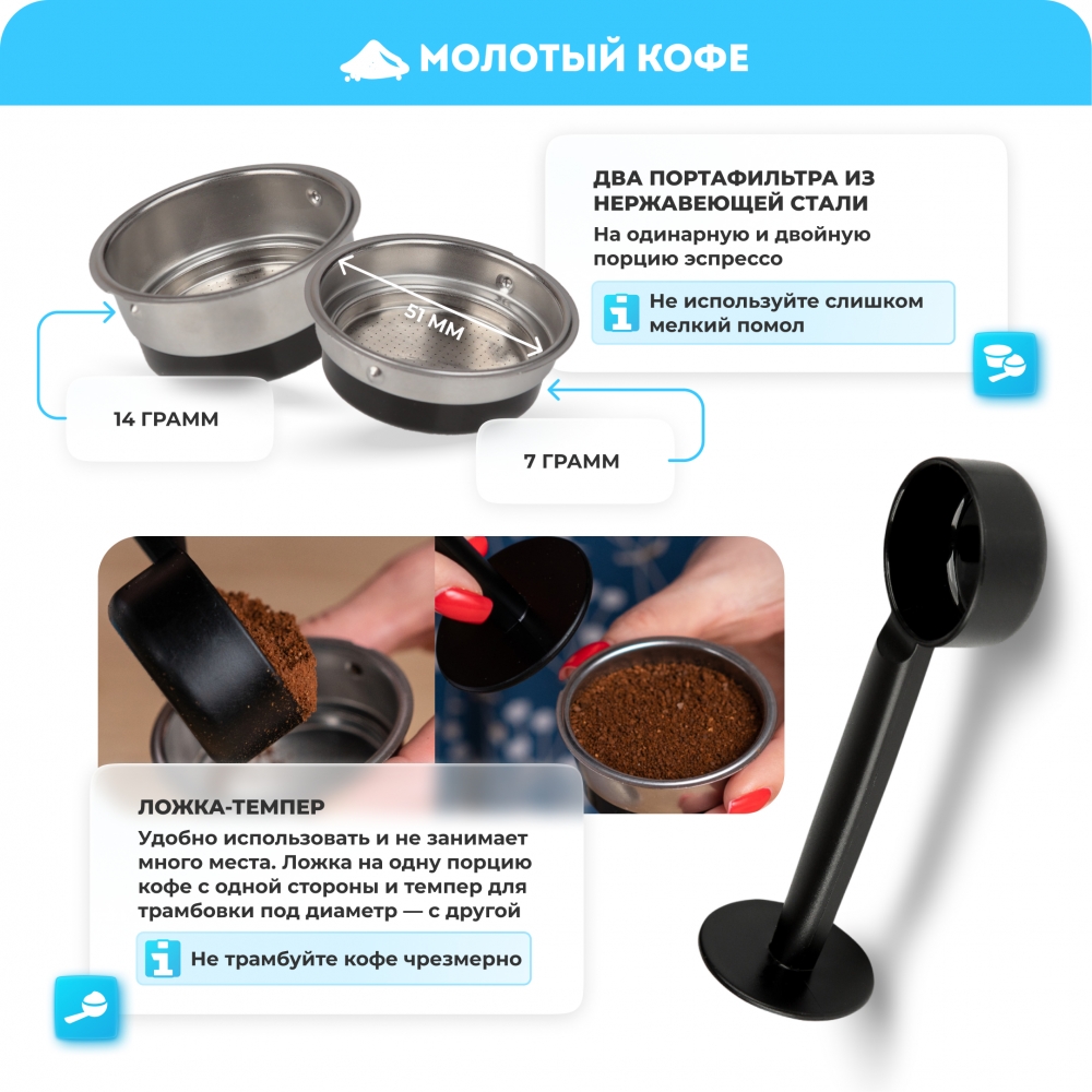 В комплекте кофемашины есть портафильтры на 1 и 2 порции молотого кофе. В фильтр для 1 порции помещается 7 граммов кофе, а для двух порций — 14 граммов.