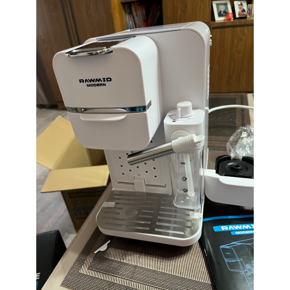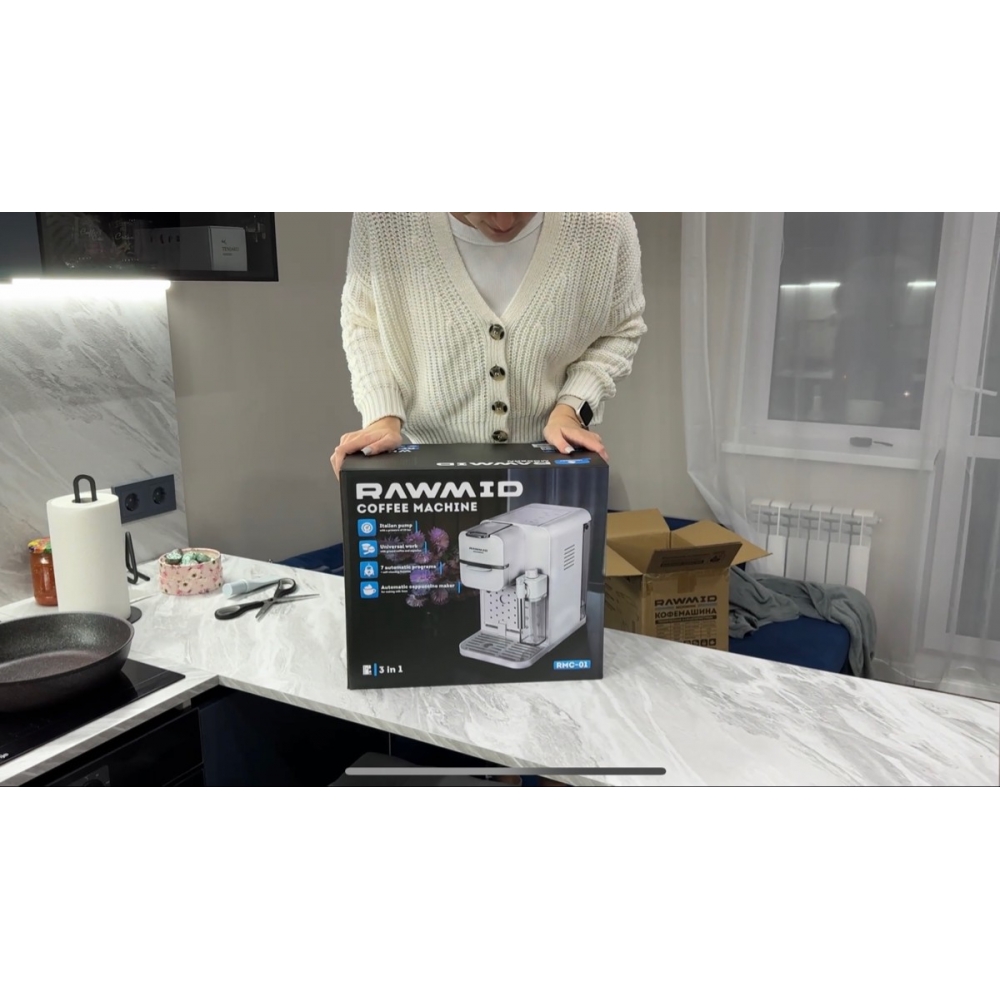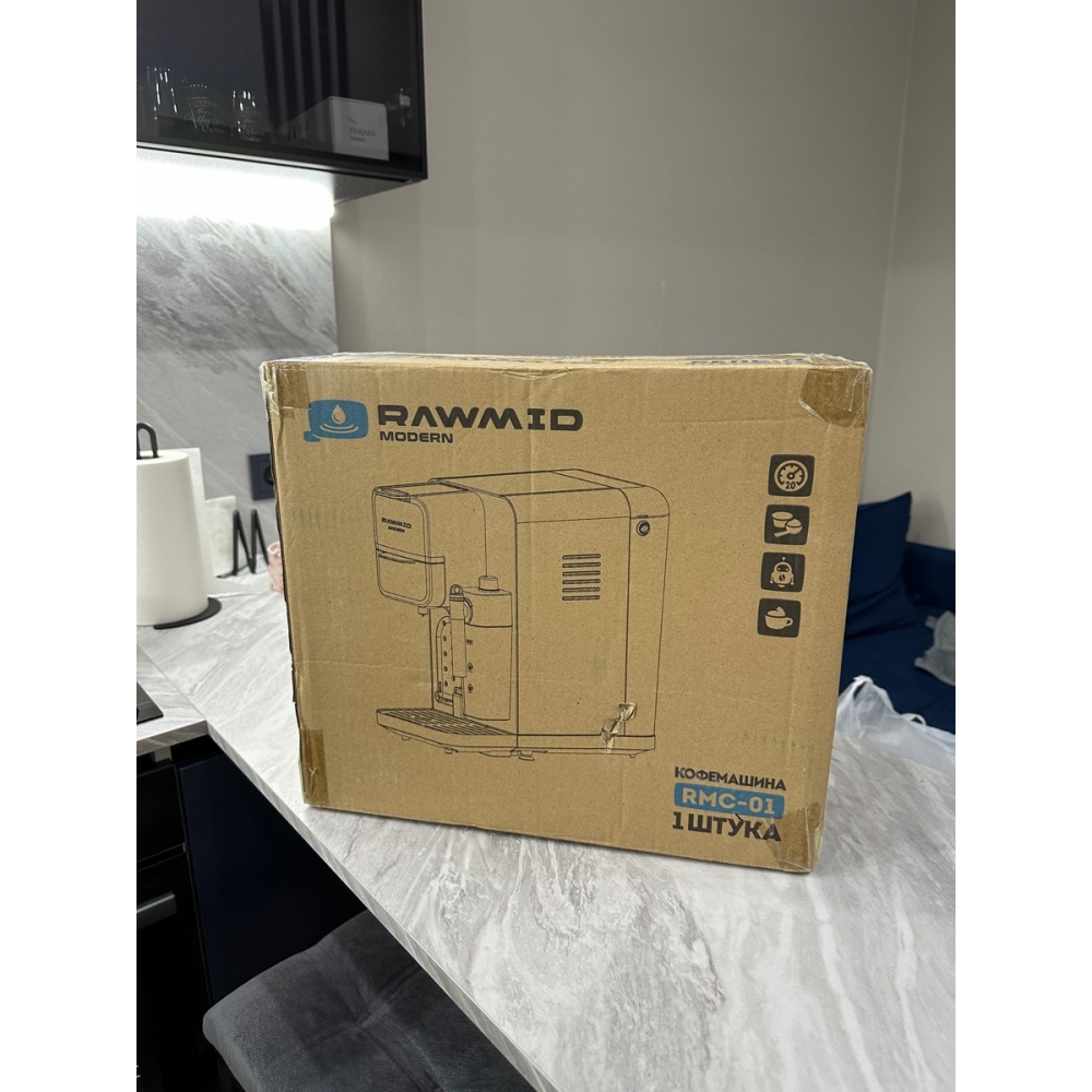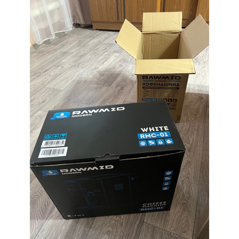 Кофемашина RAWMID упакована в двойную коробку. Внутренняя — подарочная, с красивым фирменным дизайном. Внешняя — обеспечивает дополнительную защиту во время перевозки.