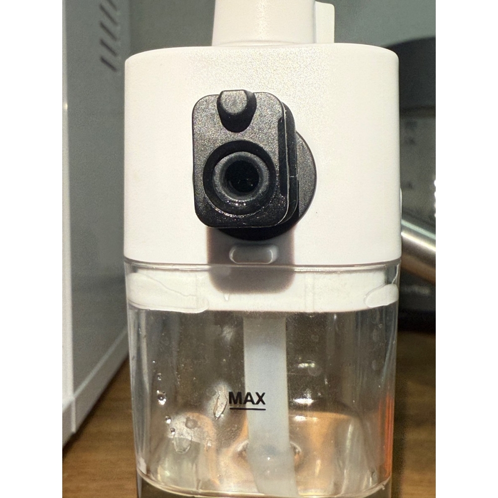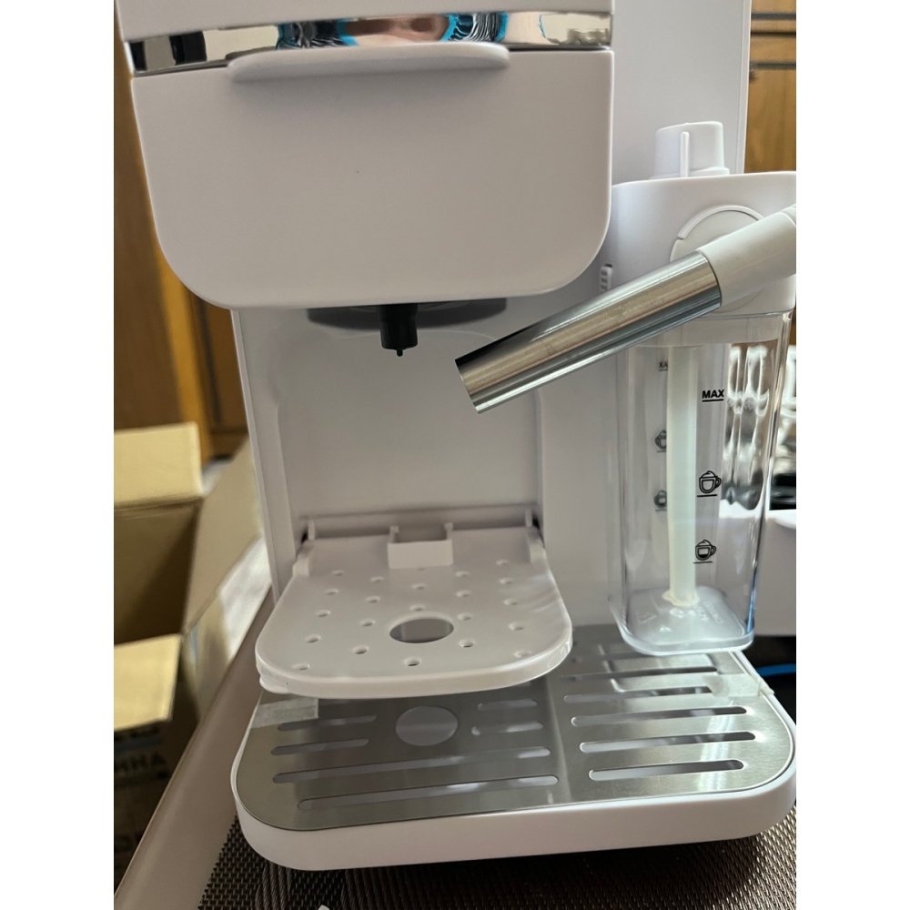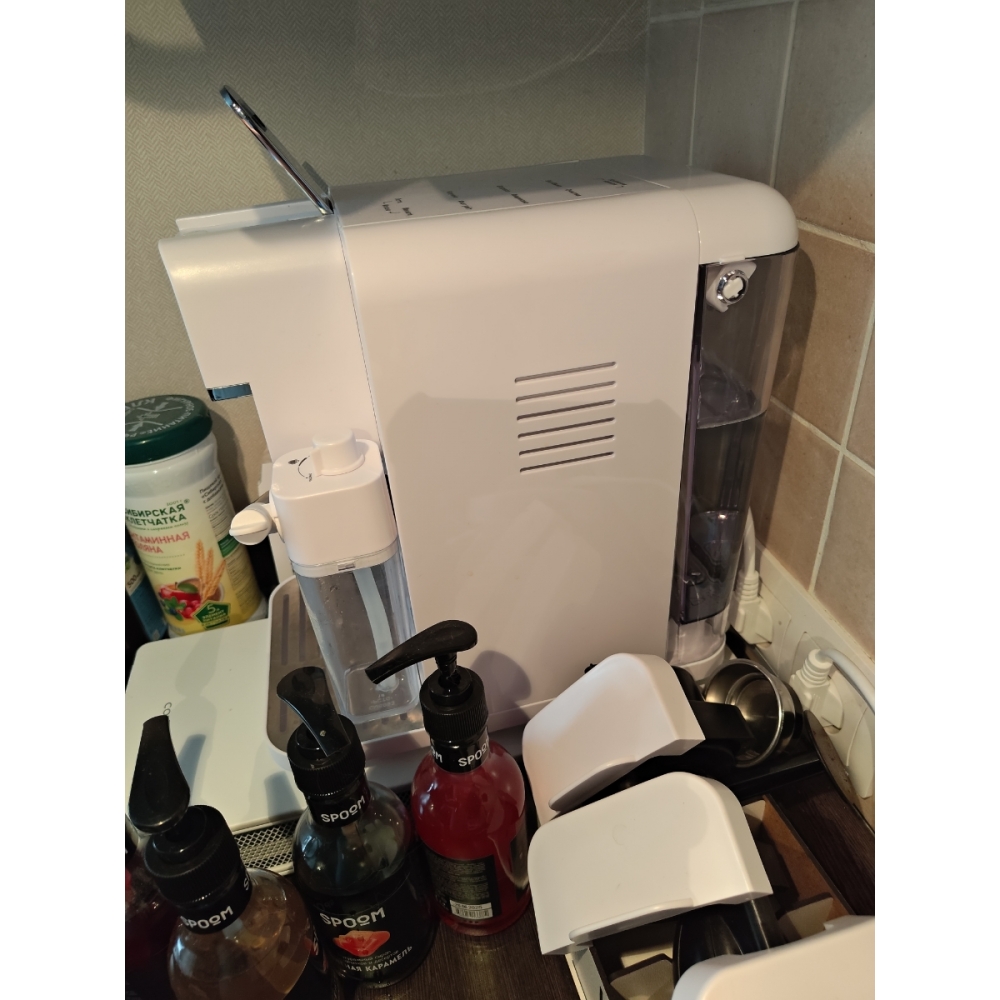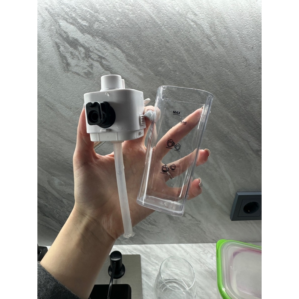 Съёмный бак для воды объёмом 1,1 литра расположен в тыльной части кофемашины и легко снимается. Также воду в бак можно наливать не снимая его с прибора. Съёмная ёмкость для молока расположена на фронтальной части корпуса и имеет объём 150 мл.