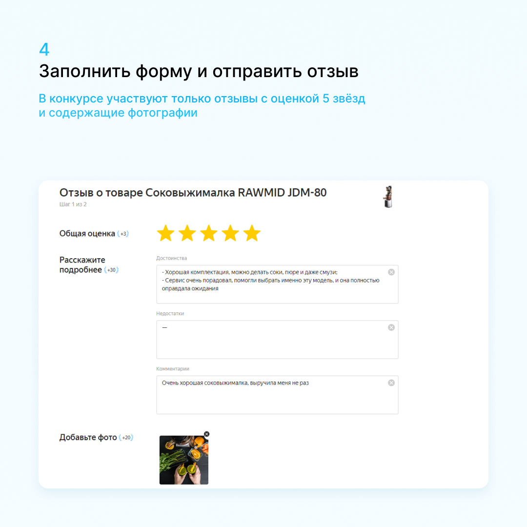 А ничего сложного! Оставьте фото-отзыв (5 звёзд) о нашем товаре на Яндекс.Маркете и получите 500 рублей бонусами. Не упустите шанс, скоро будет ещё больше подарков.