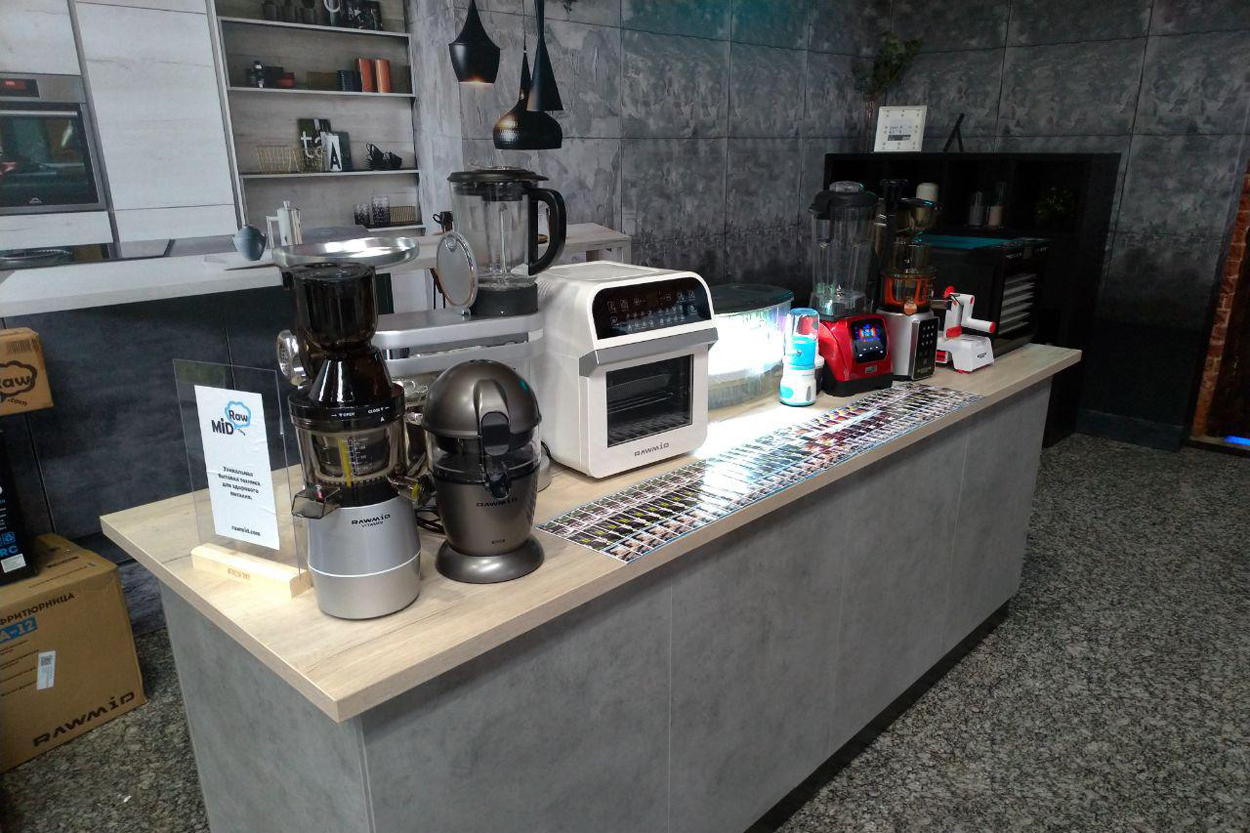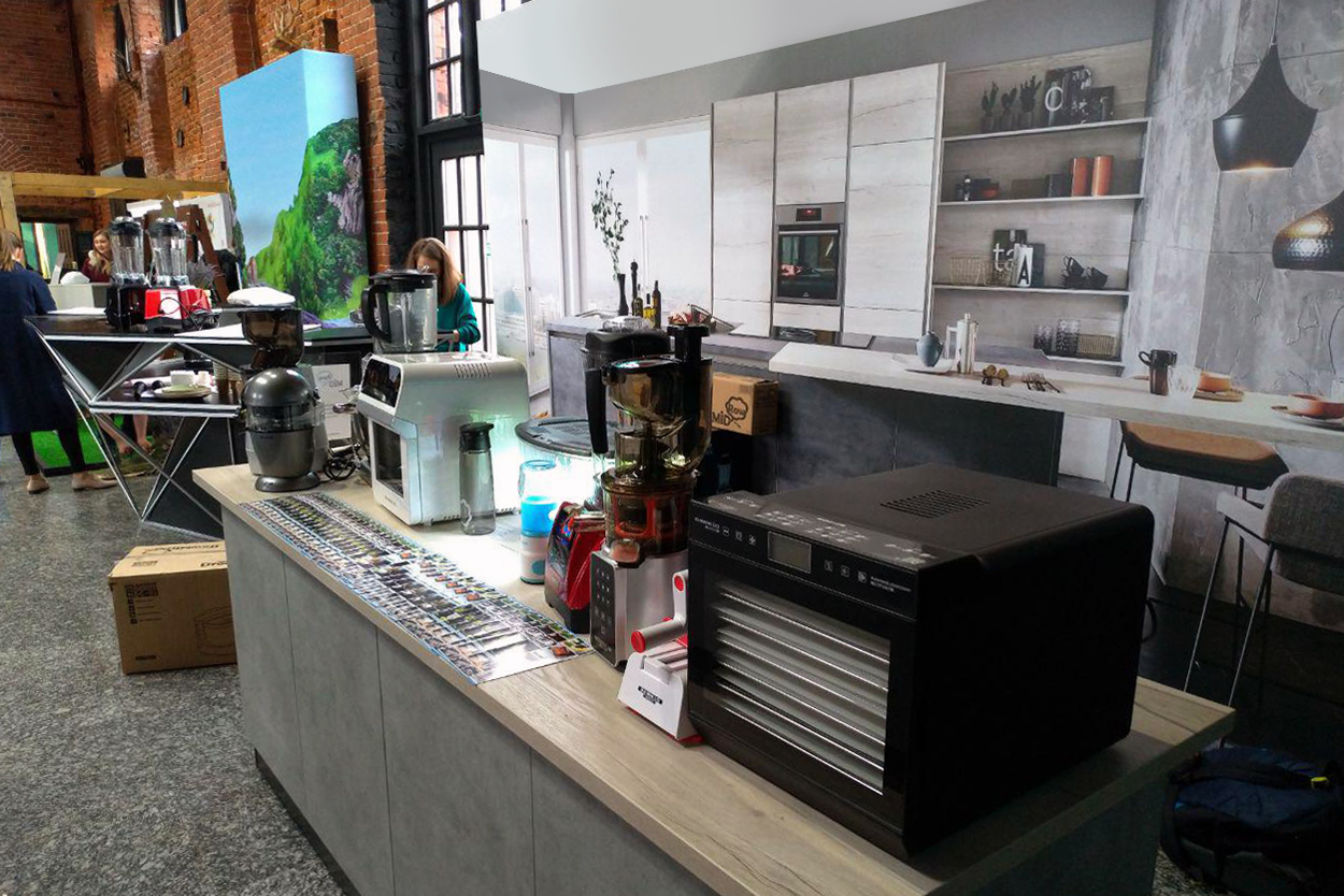 Также на фестивале было представлено много разной техники для здорового образа жизни. В том числе и техника компании RAWMID – профессиональные блендеры, персональный мини-блендер, дегидраторы, соковыжималки, планетарный миксер, аэрофритюрница, микроферма, спиралерезка. Посетители выставки активно подходили и интересовались этими устройствами, а кое-кто даже сразу приобрёл технику со скидкой.