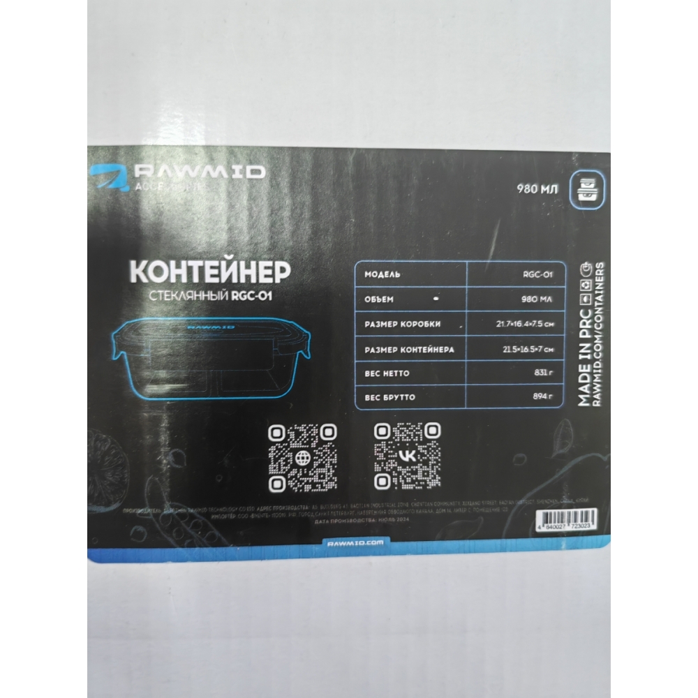 RAWMID RGC-01 — удобный и надёжный стеклянный контейнер объёмом 0.98л, созданный для тех, кто любит порядок и комфорт в деталях. Он выполнен из прочного термостойкого боросиликатного стекла, устойчивого к перепадам температур от –40 °C до +560 °C. Контейнер можно использовать для разогрева блюд в микроволновке, запекания в духовке без крышки или хранения готовой еды в холодильнике — одно решение на каждый день.